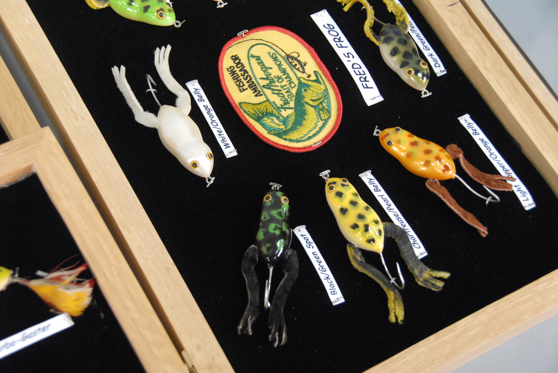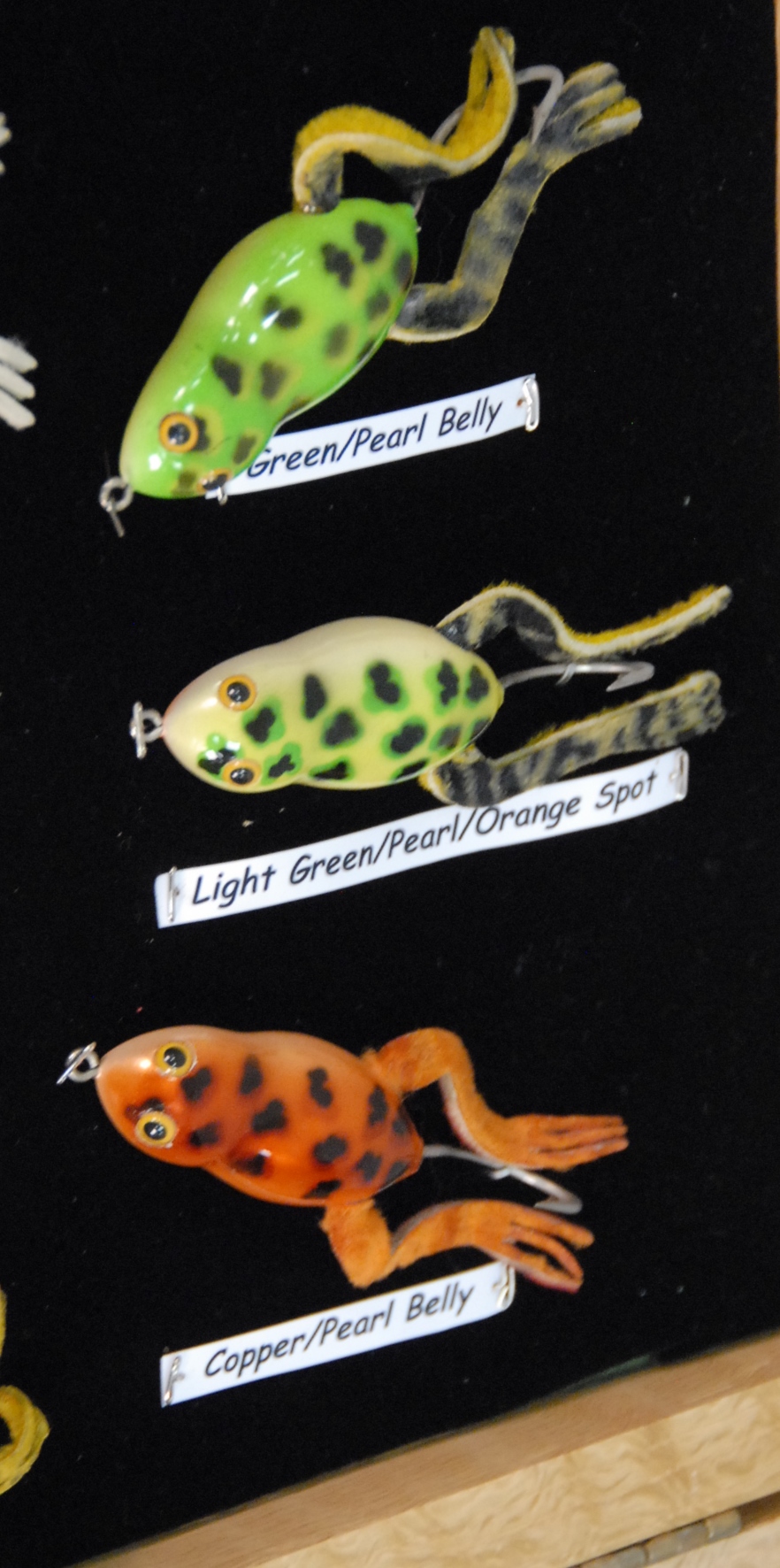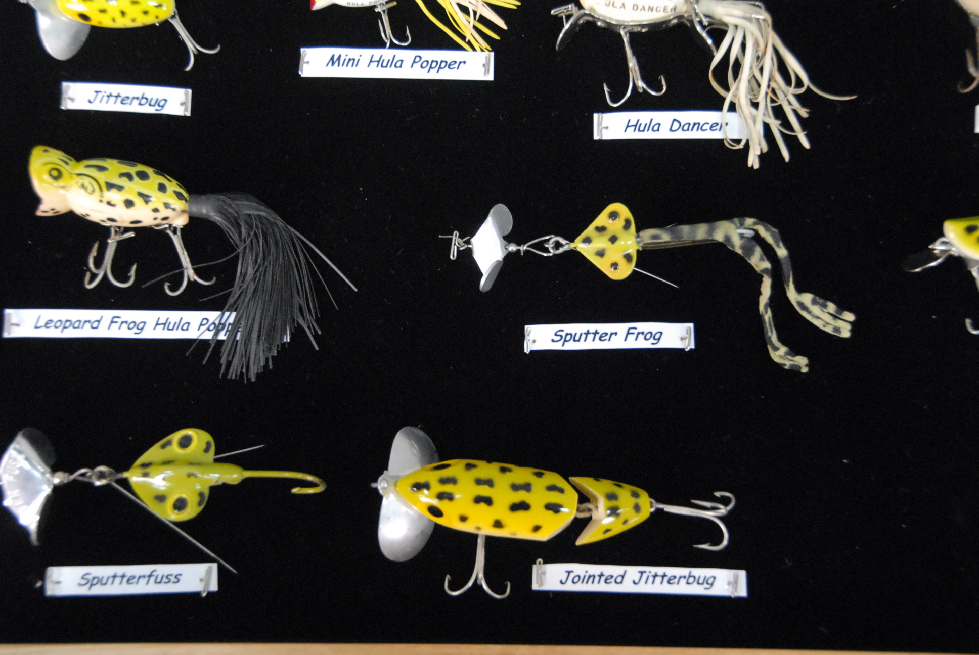 Lot 199: Fred Arbogast thirty-one Frog Patterns in three custom cases include Pug Nose, Hula Pike Sputterbuzz, Bug Eye, Fly Rod Hula, Mud Bug…