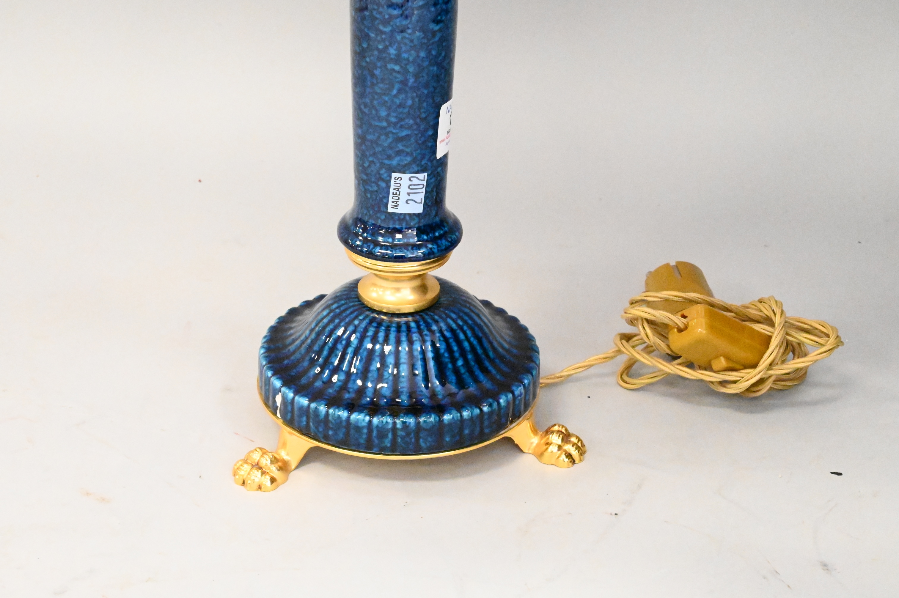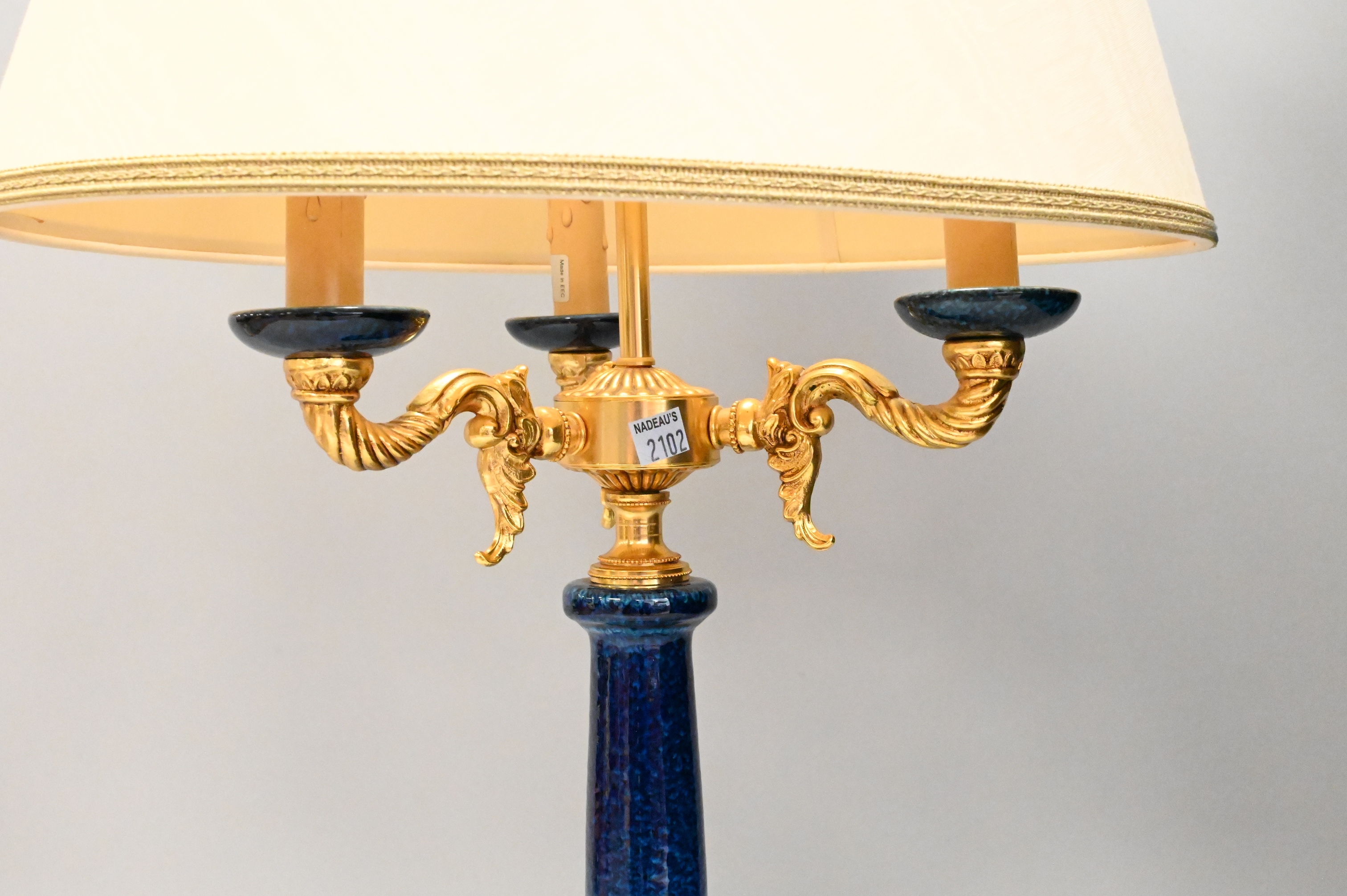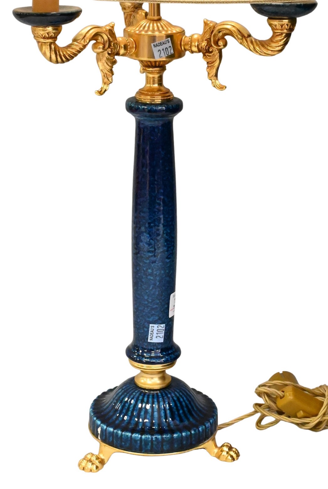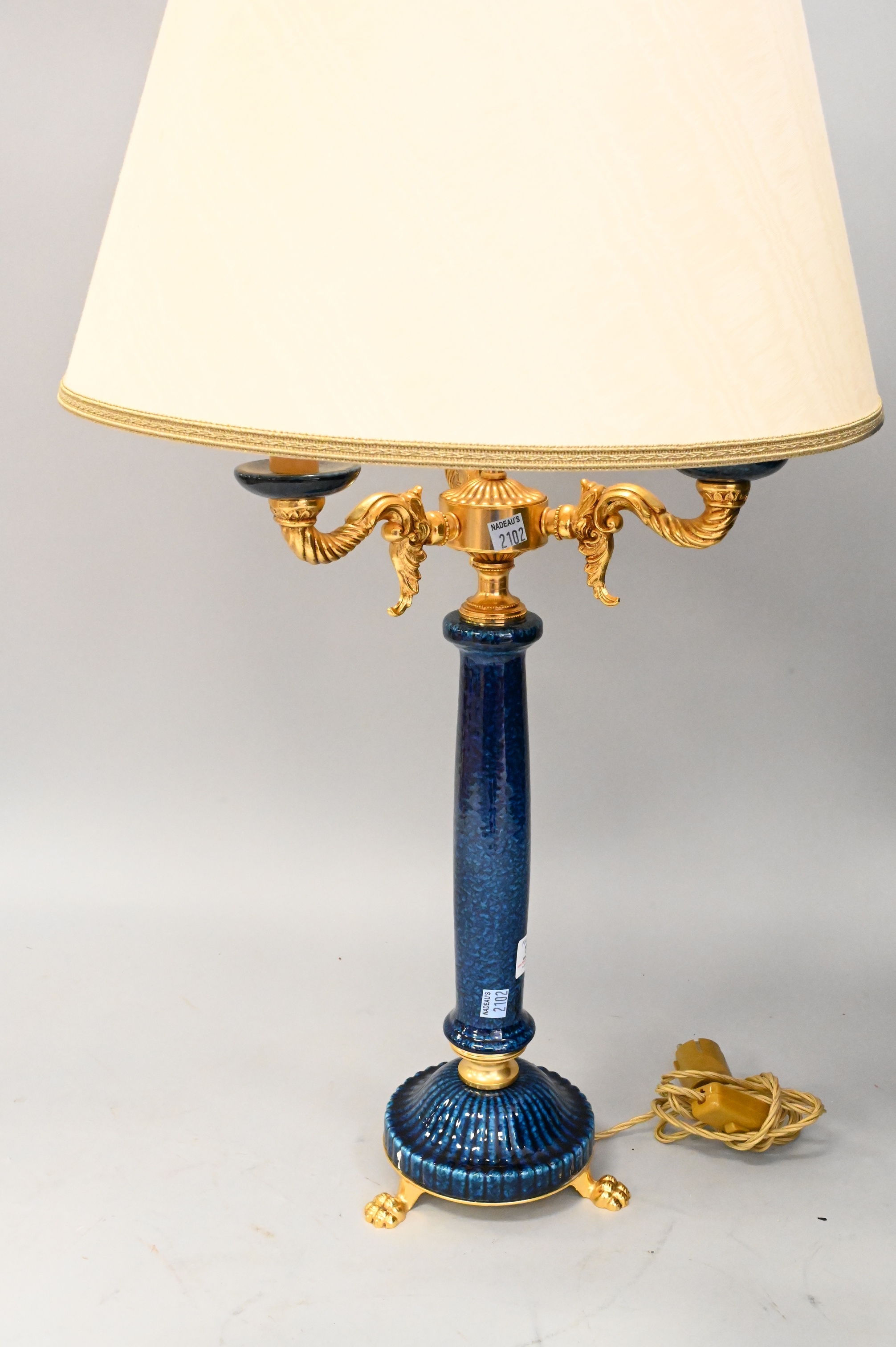 French Porcelain Candelabra Lamp, having a cloth cord, height 30 inches with shade.
