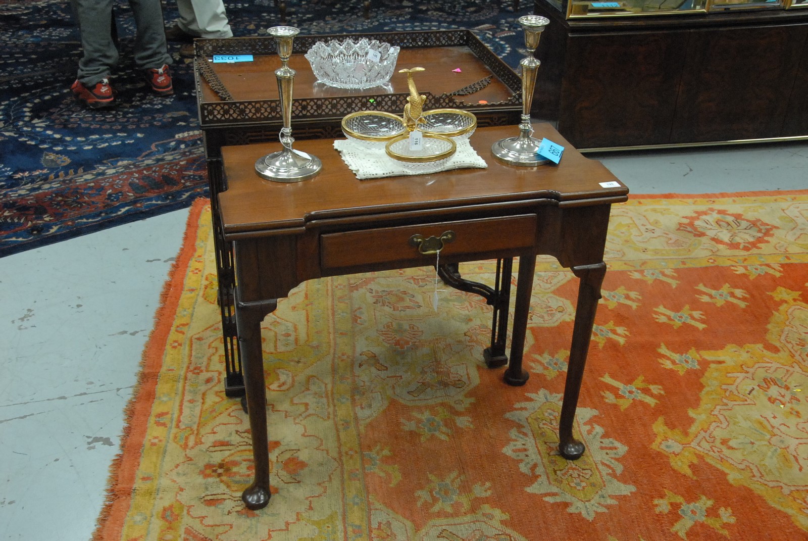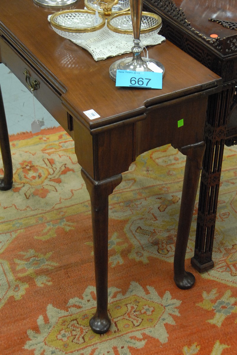 Lot 199: George II mahogany game table having shaped top drawer all set on turned legs and pad feet, 18th century. ht. 29 1/2 in. wd. 30 1/4 in.
