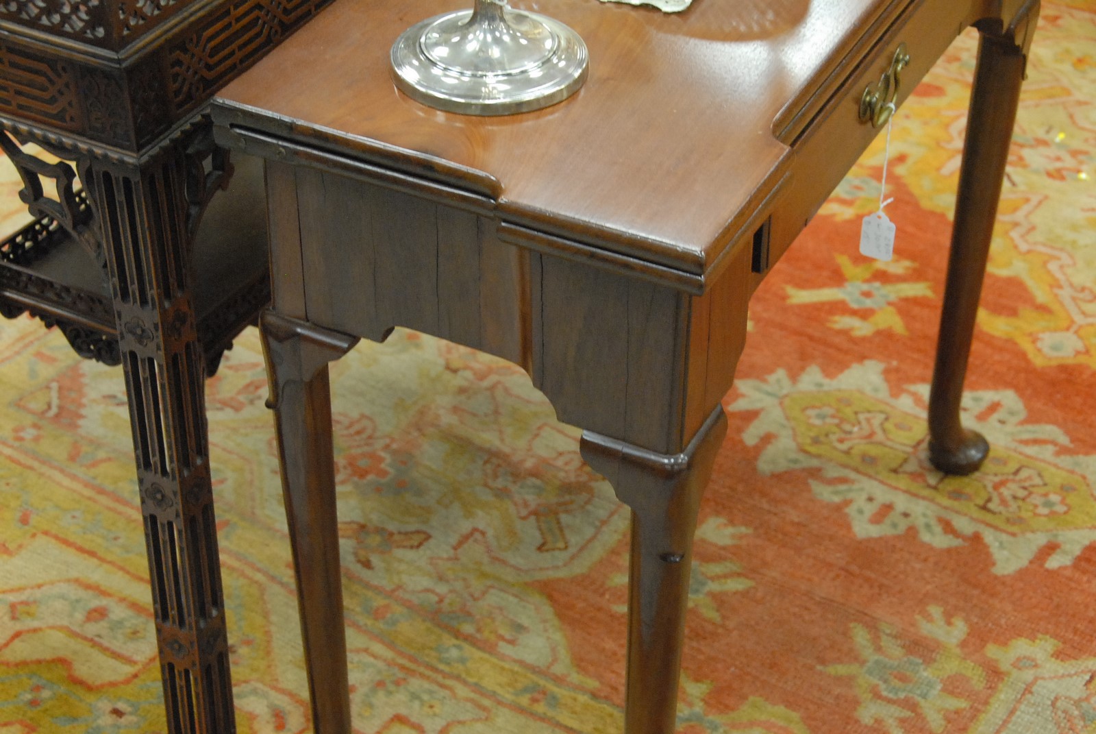 George II mahogany game table having shaped top drawer all set on turned legs and pad feet, 18th century. ht. 29 1/2 in. wd. 30 1/4 in.