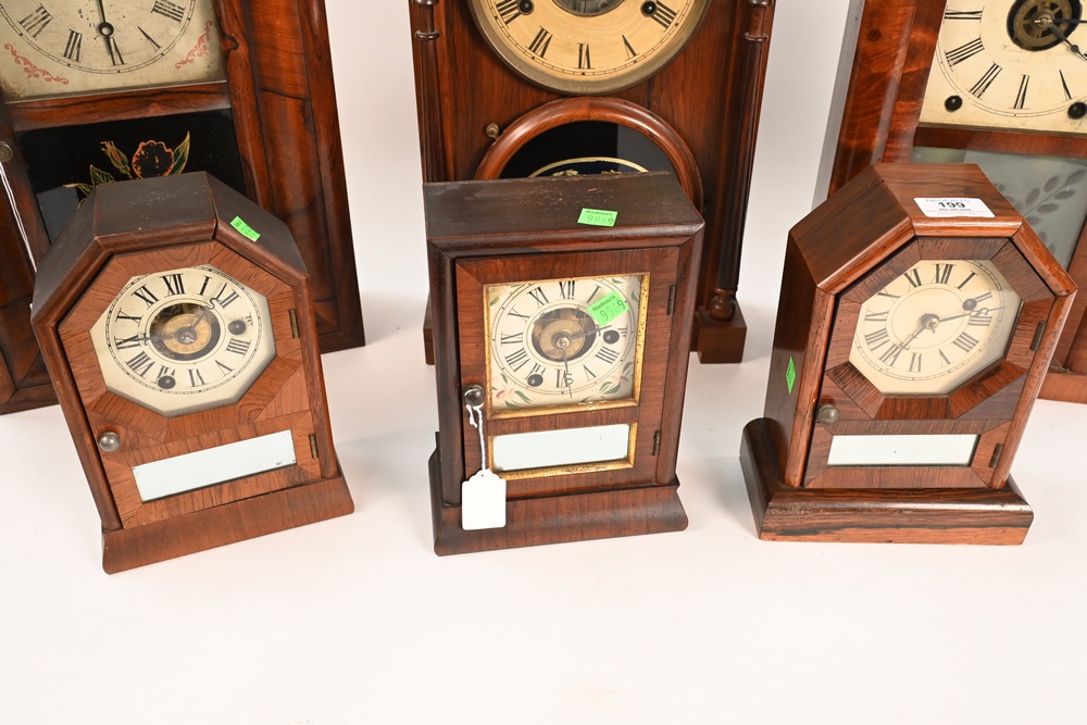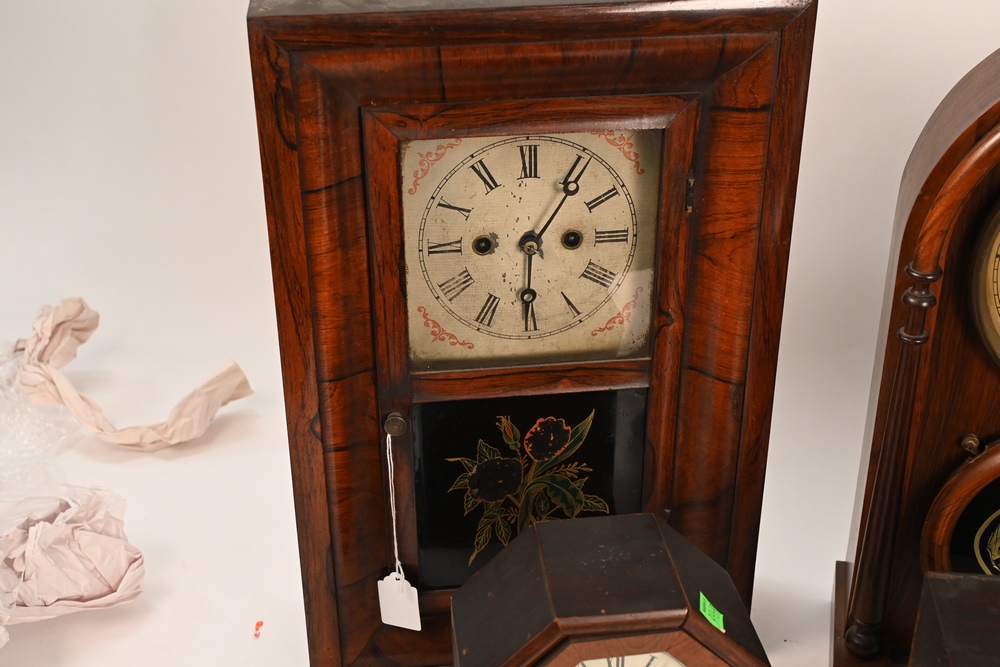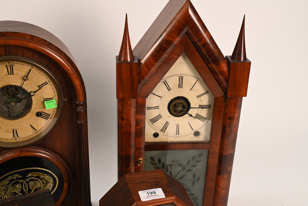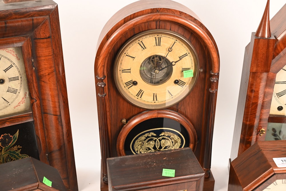 Lot 199: Group of Six Mantel Clocks to include a Brewster & Ingraham mahogany steeple clock; Joseph Ives beehive 8-day clock; three small Seth Thomas shelf clocks, one with rosewood case; along with The Terry Clock one and eight day time pieces and striking height 20 inches Provenance: Fifty Year Personal Collection of Clocks and American Antiques from Thomas Bailey, Manchester, Connecticut.