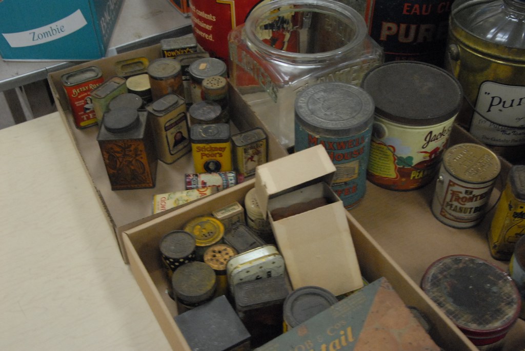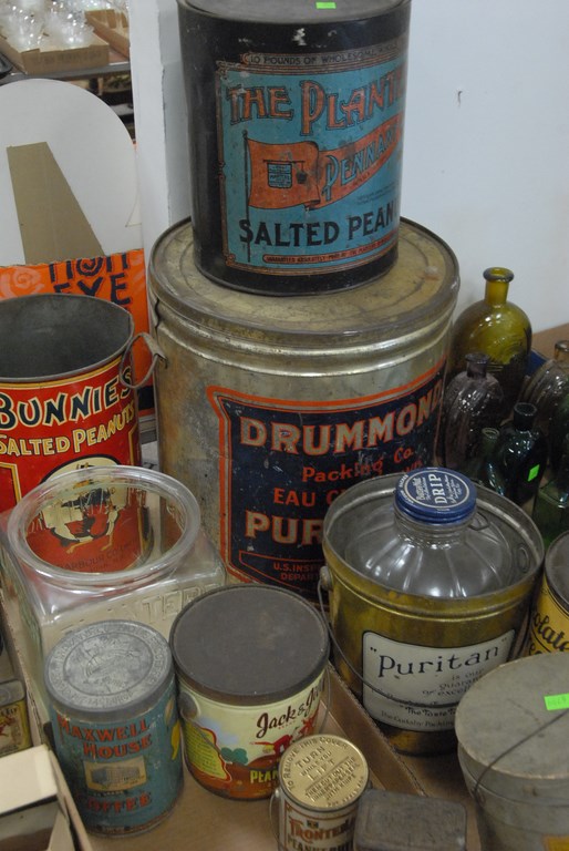 Lot 199: Large grouping of advertising tins including Maxwell House Coffee, Planters, P.J. Ritters Currant, four small boxes and large tins.