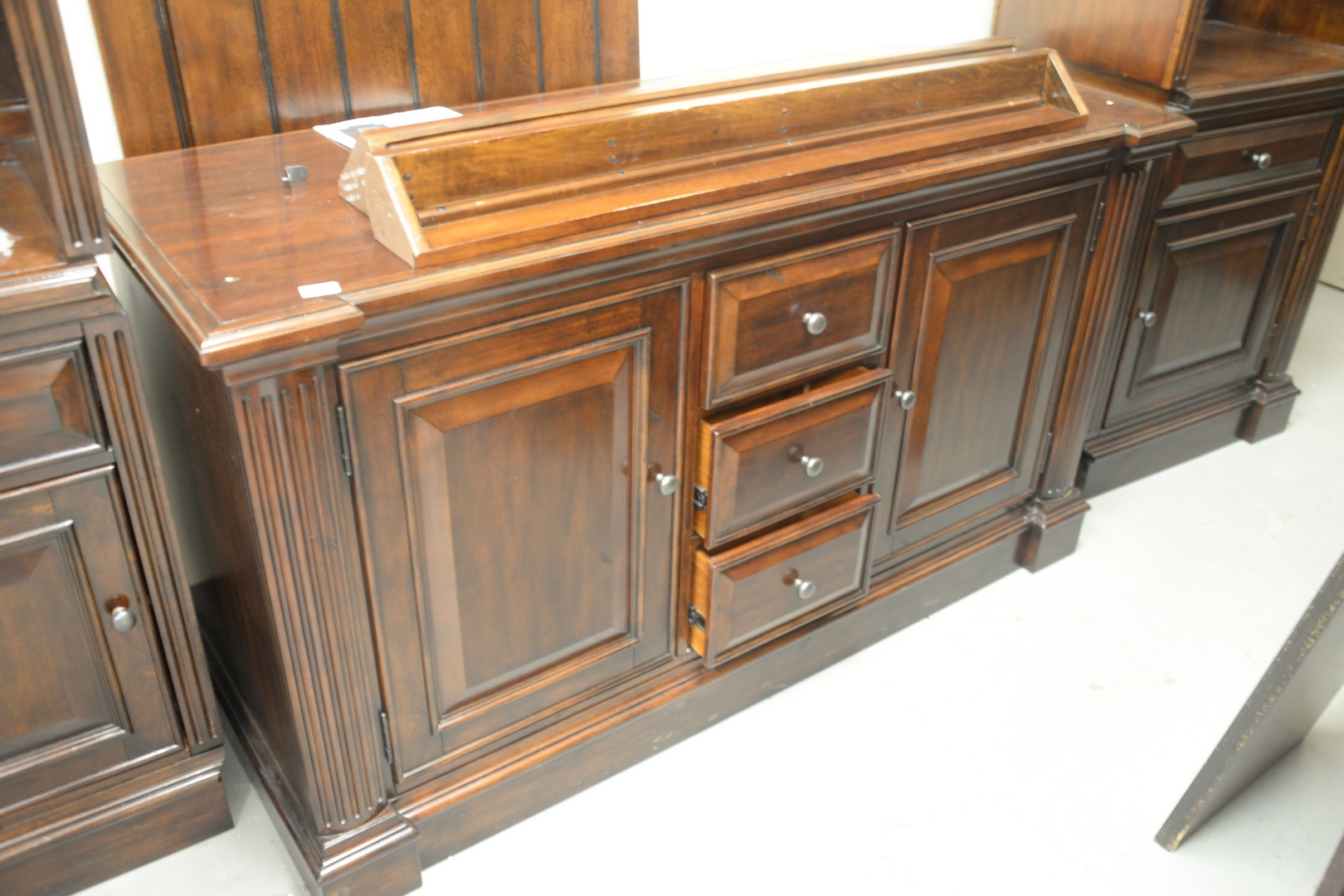 Lot 199: New Castle II Hardwood Three-Part Television Cabinet, birch and cherry veneers, height 104 inches, top width 128 inches.