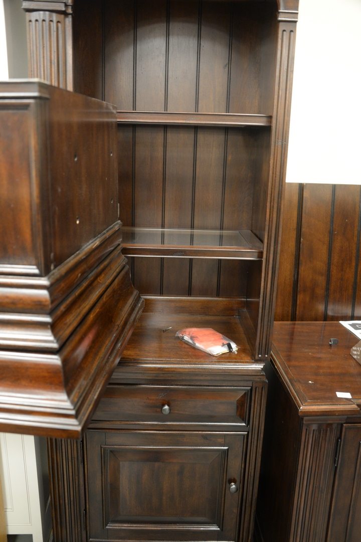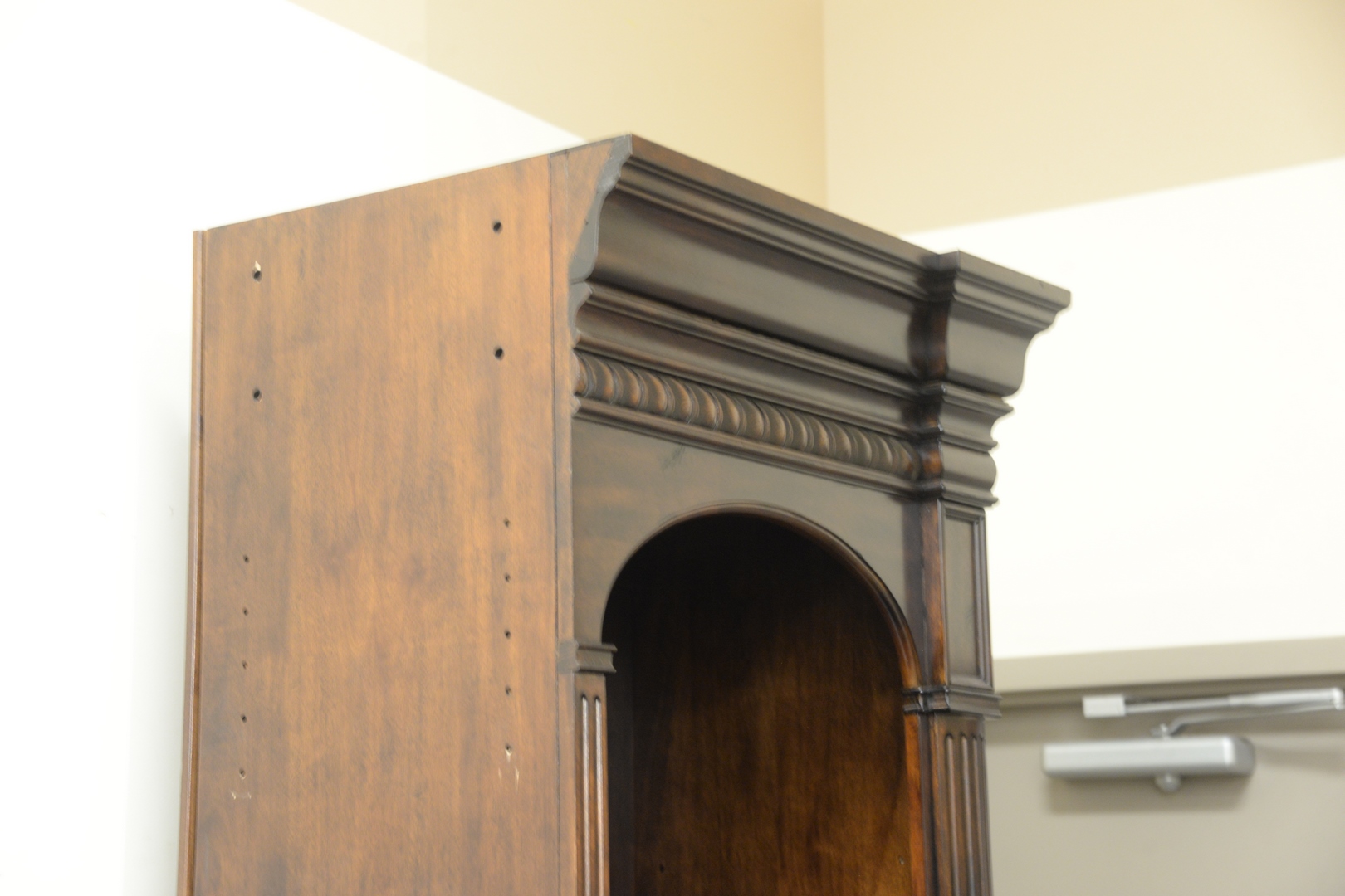 New Castle II Hardwood Three-Part Television Cabinet, birch and cherry veneers, height 104 inches, top width 128 inches.