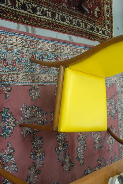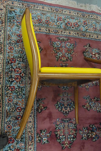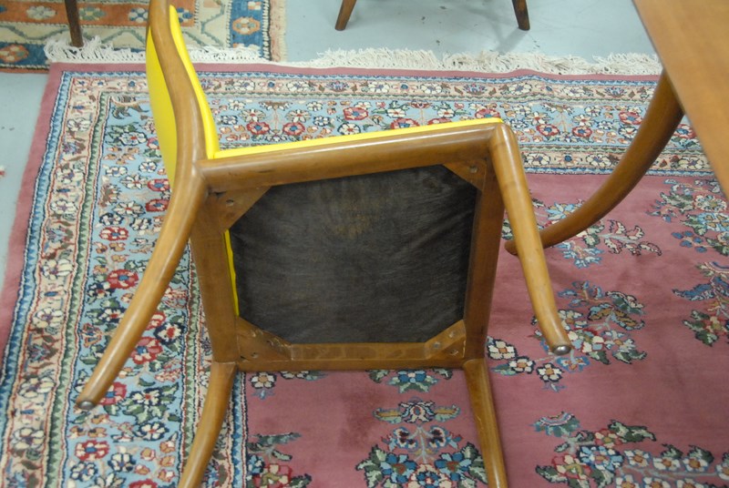 Lot 199: Robsjohn Gibbings Designer, Widdicomb six sabre leg chairs in yellow vinyl, very good condition.