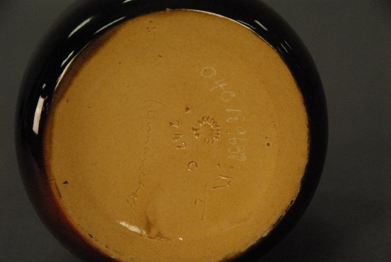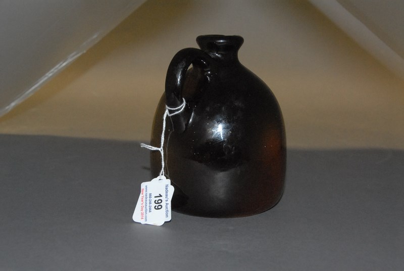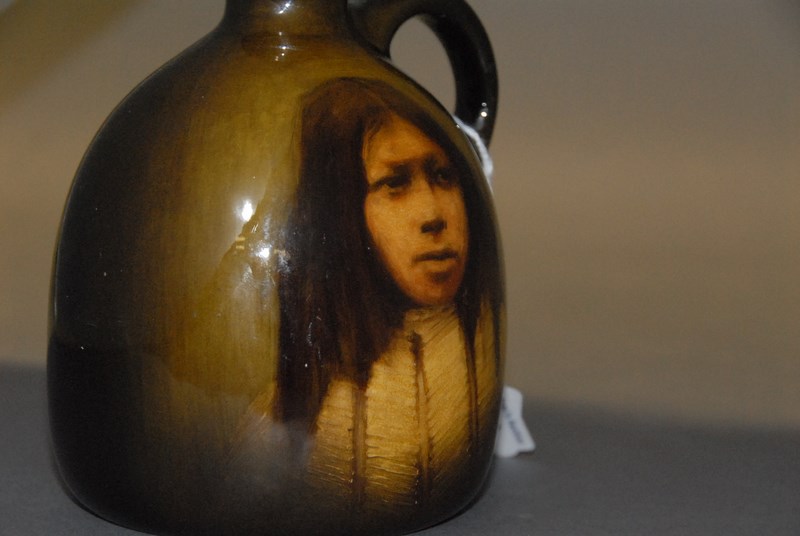 Lot 199: Rookwood pottery jug featuring a young Indian Brave with porcupine breast shield, signed S.M. probably Sadie Markland 1892-1899 Commache, marked on bottom SMI Rookwood 747C. ht. 5 7/8in.