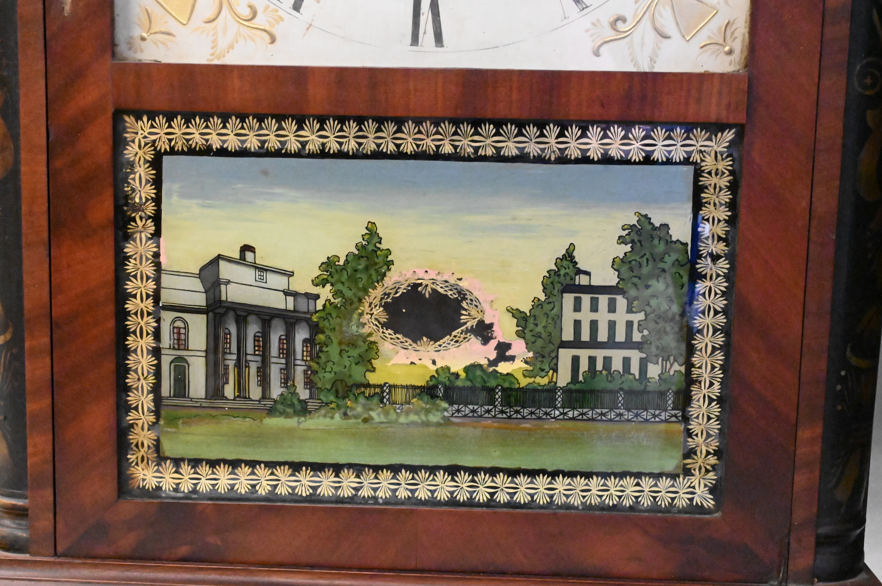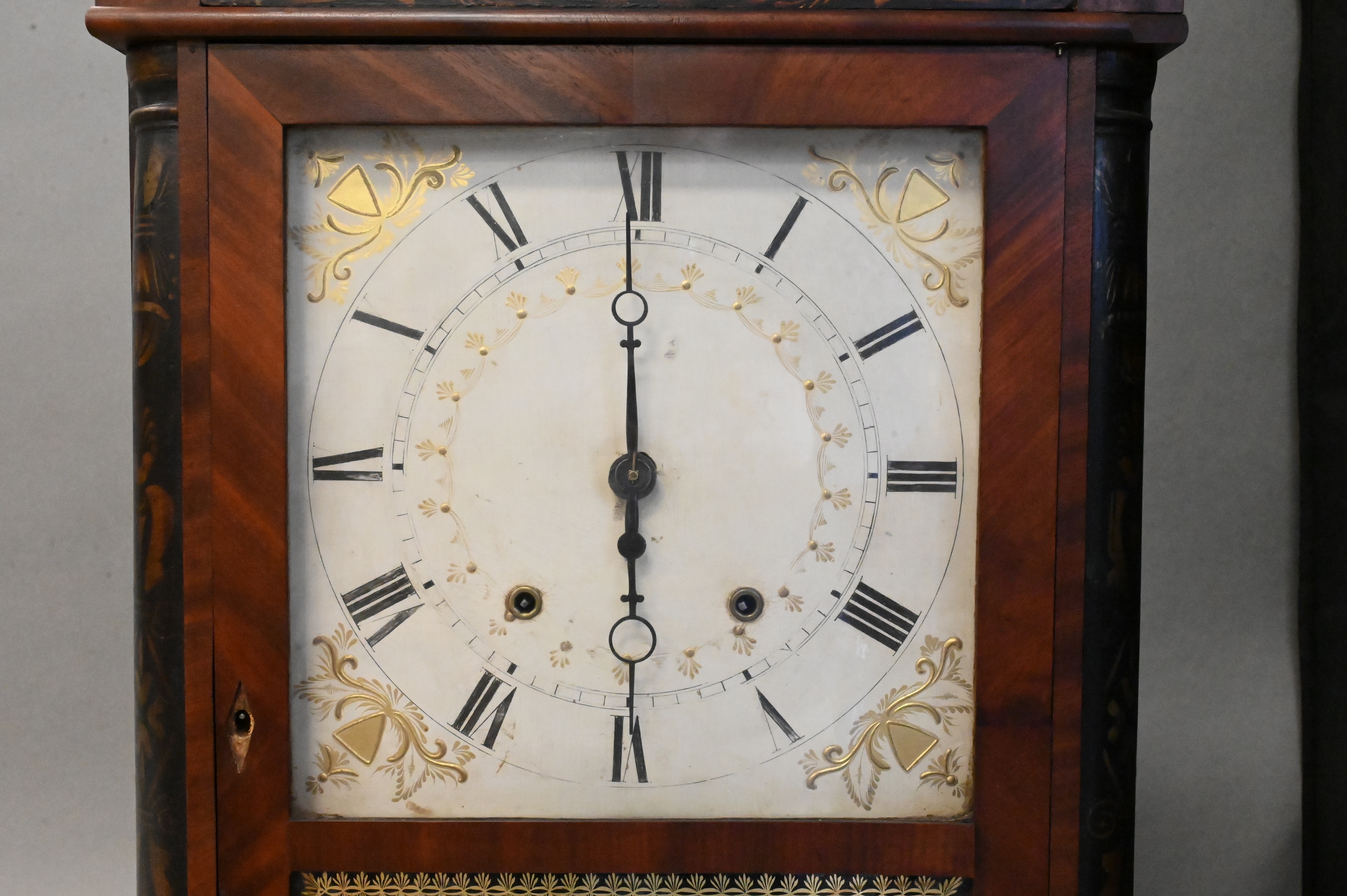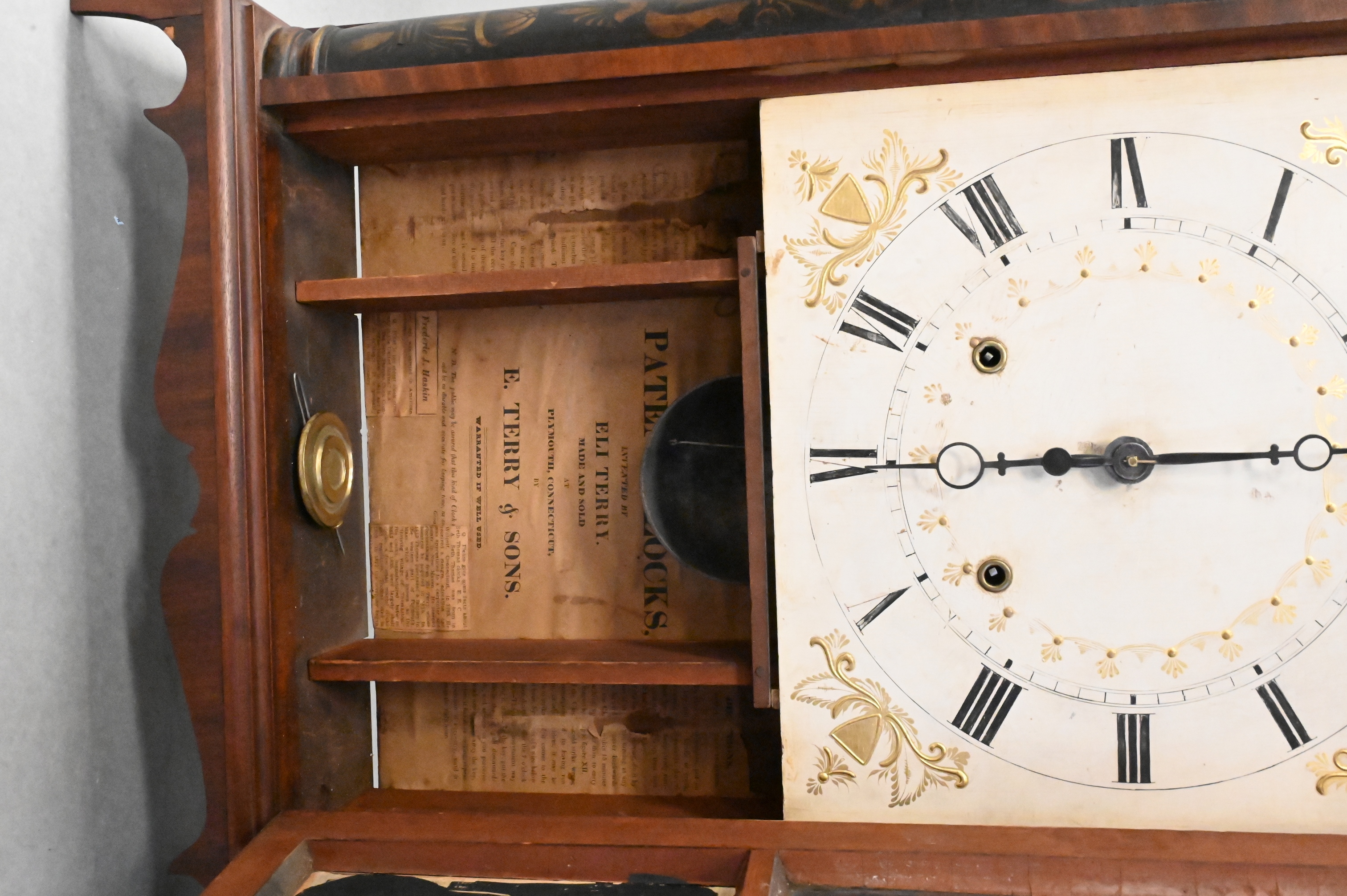 American wall regulator clock by Seth Thomas, with painted Roman numeral dial, single weight–driven movement and brass pendulum, housed in a walnut case with molded surround and carved corner spandrels.