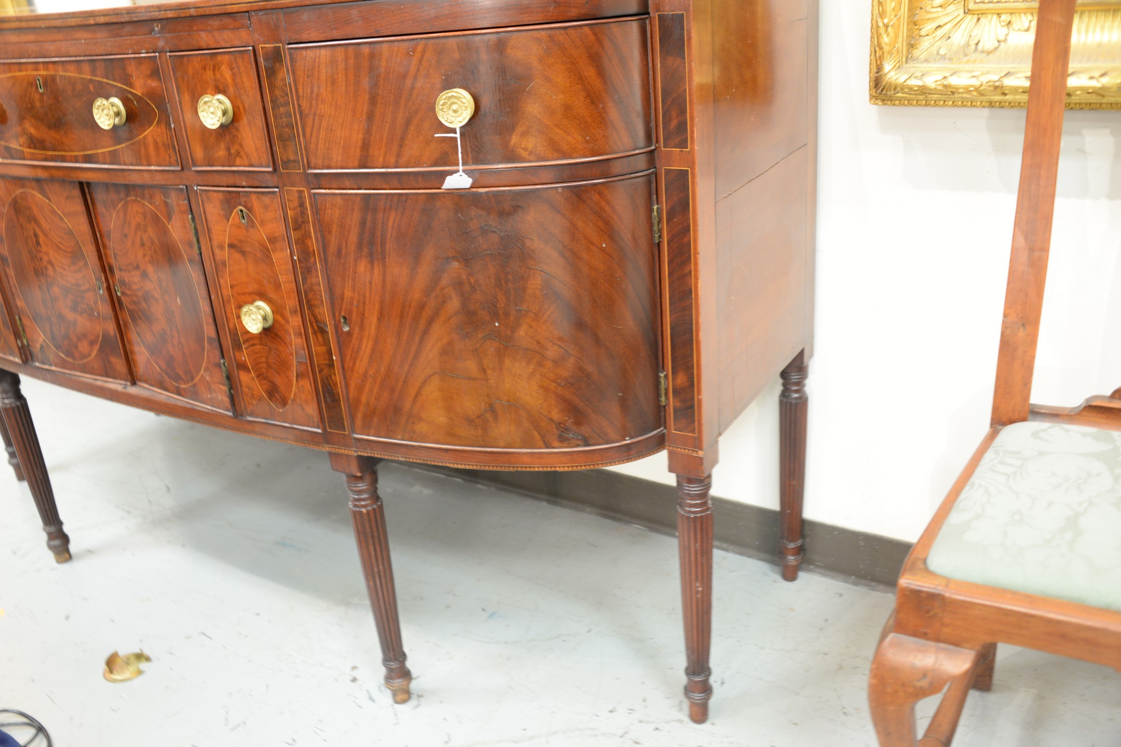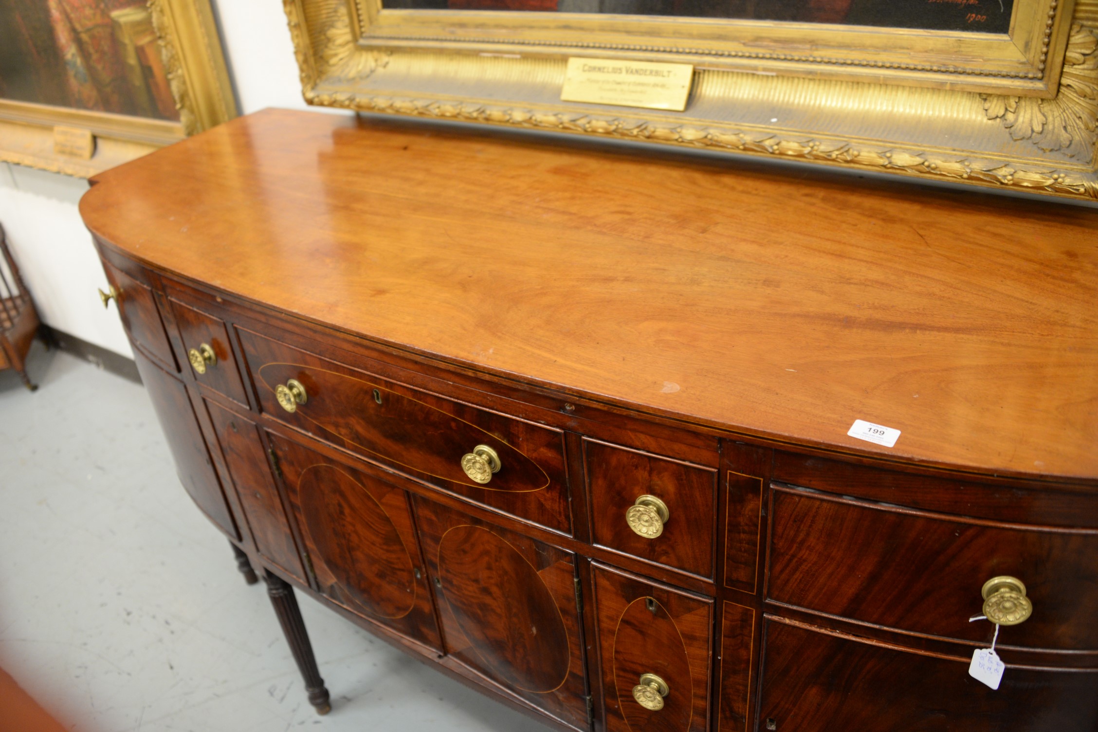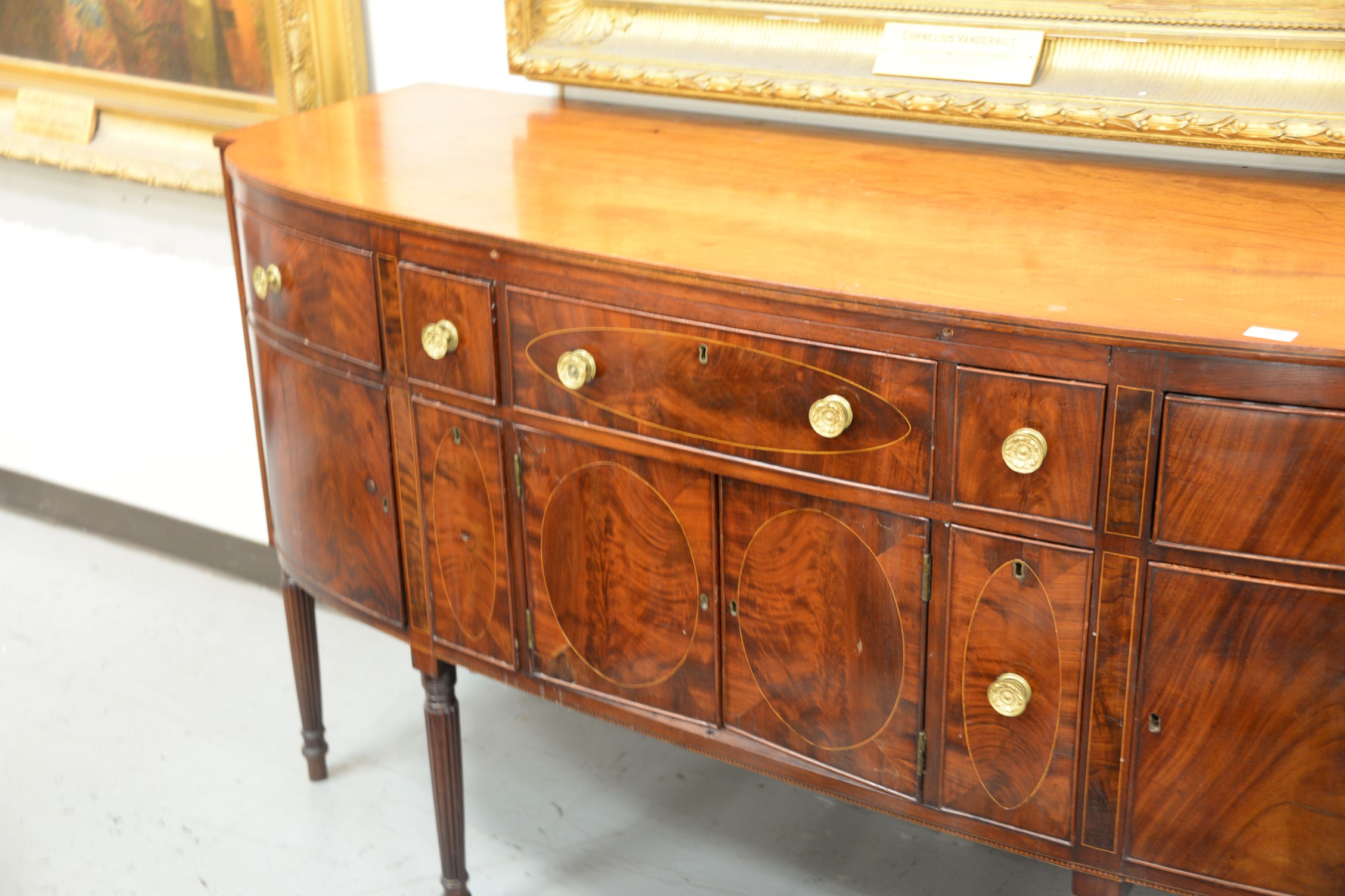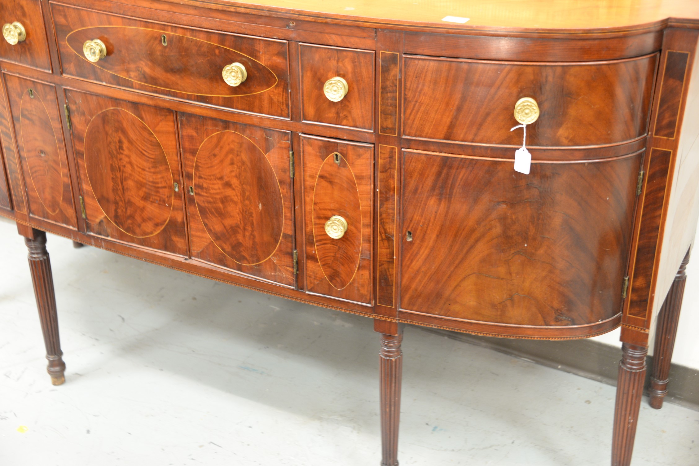 Lot 199: Sheraton mahogany sideboard having D shaped top over pull out slide over center drawer flanked by two small drawers flanked by two b…