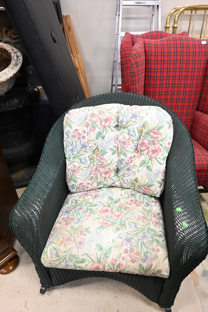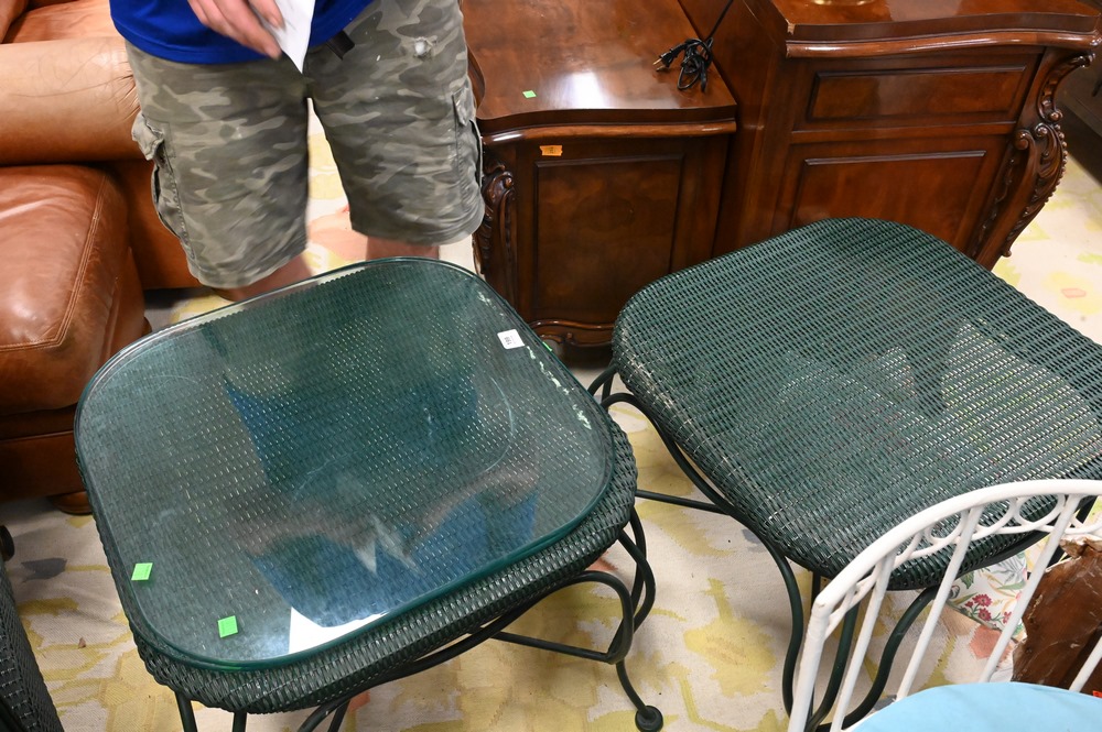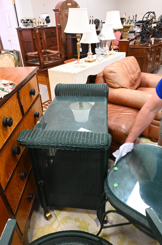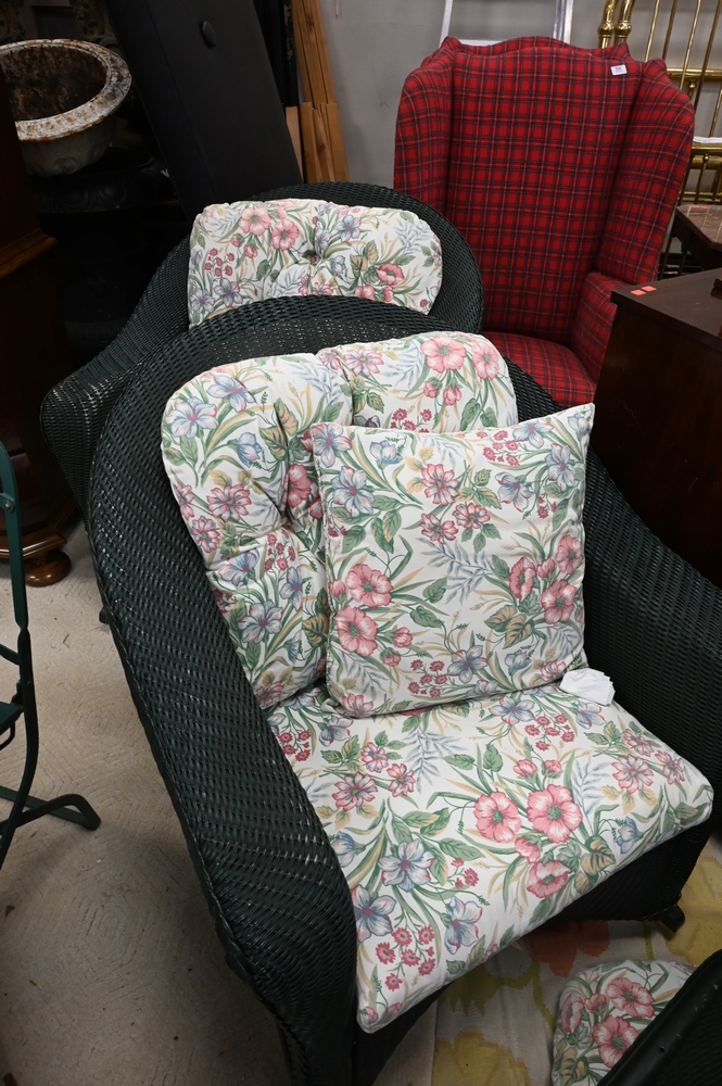 Six Piece Contemporary Wicker Lot, to include three rockers, two glass top tables, along with a tea cart having glass top, with cushions.
