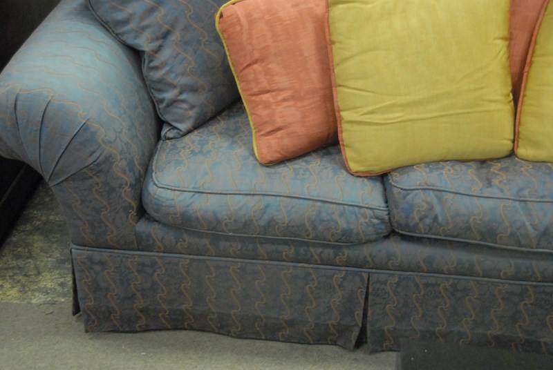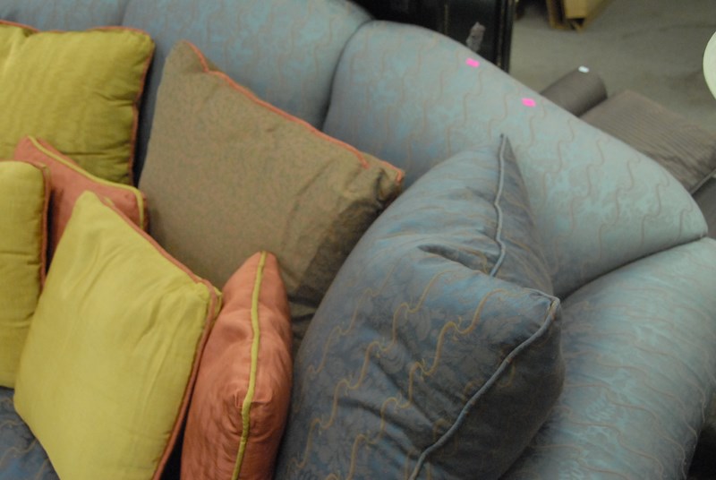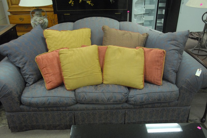 Summer Hill Ltd. upholstered sofa with nine pillows.