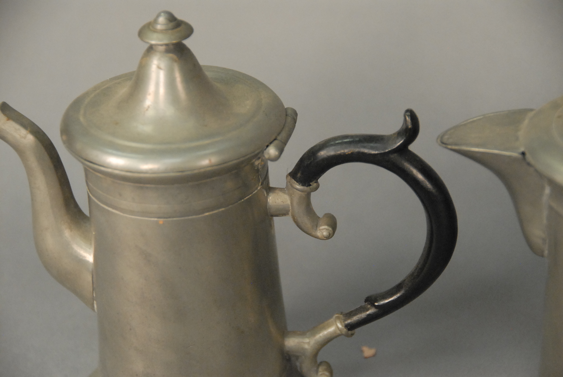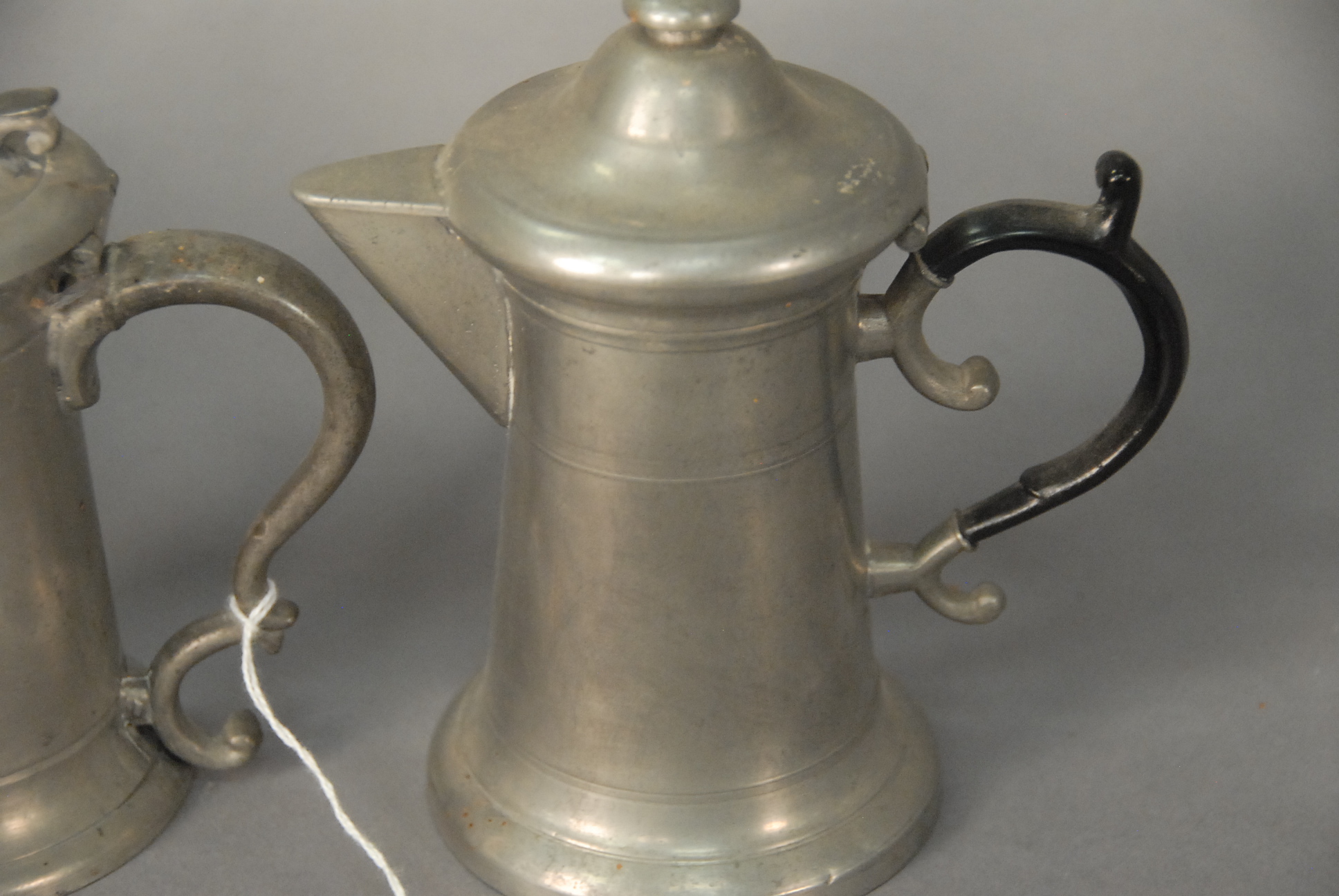Lot 199: Three piece lot to include two small flagons and one teapot, all with scrolled handles. ht. 6 in. to ht. 6 1/4 in.