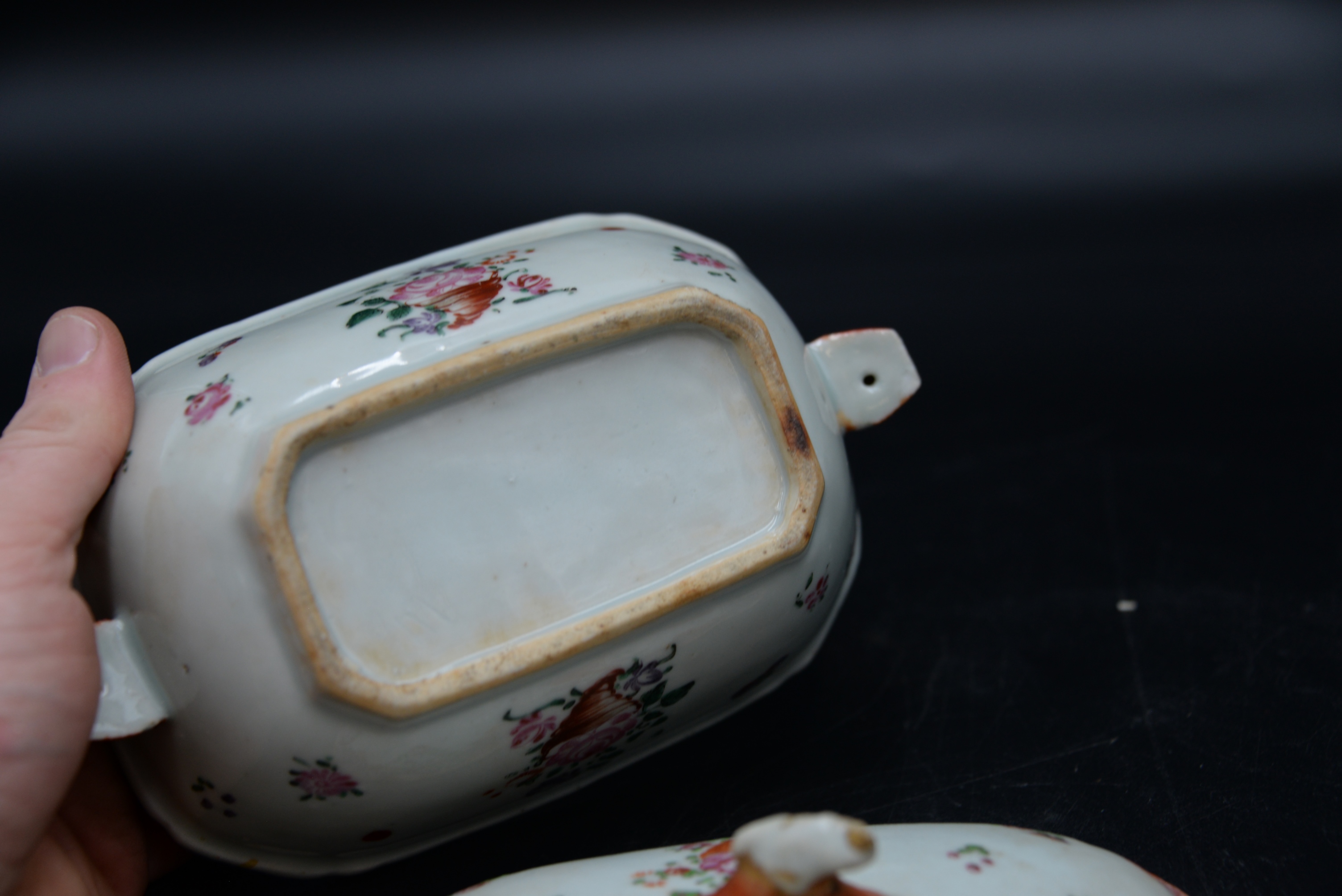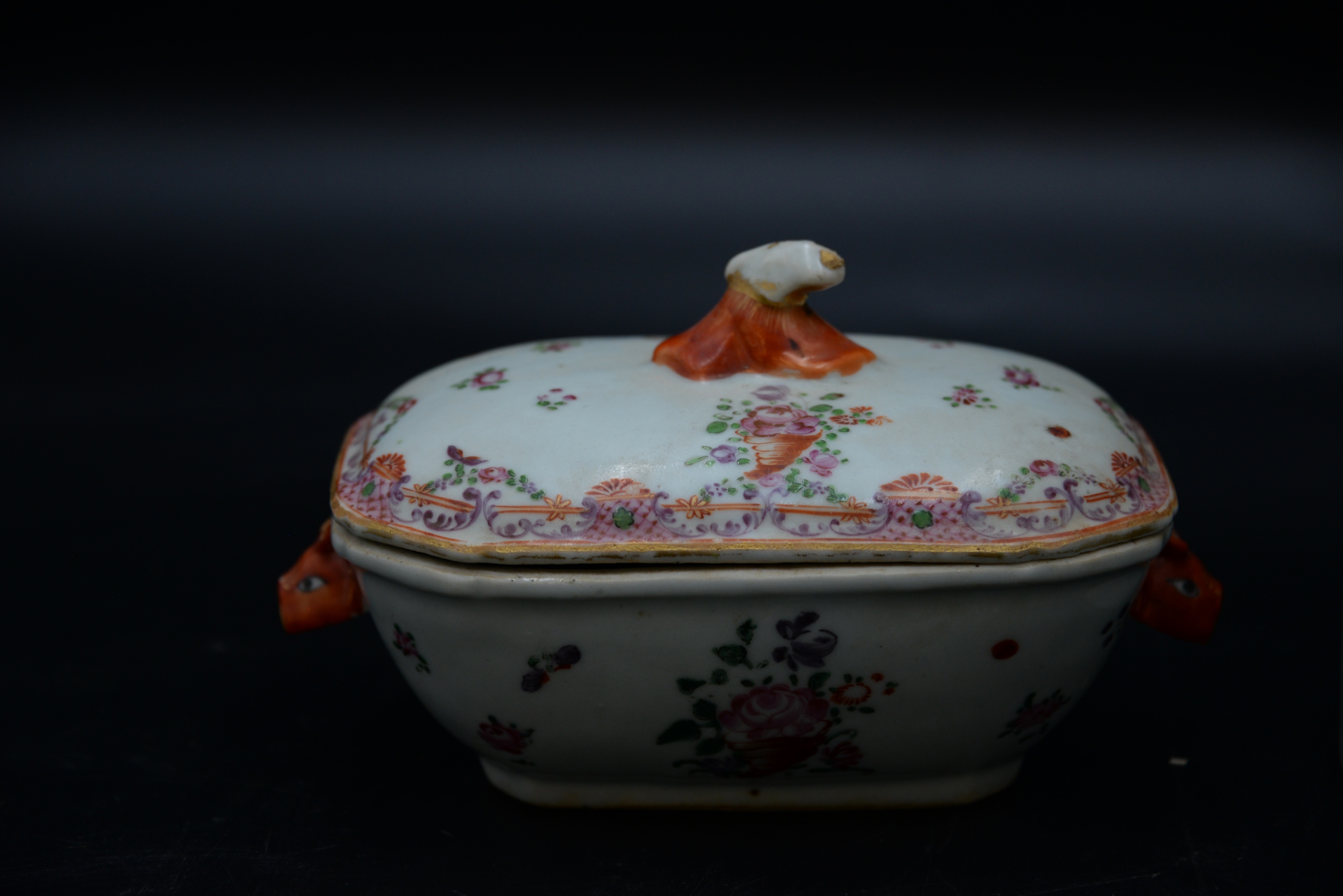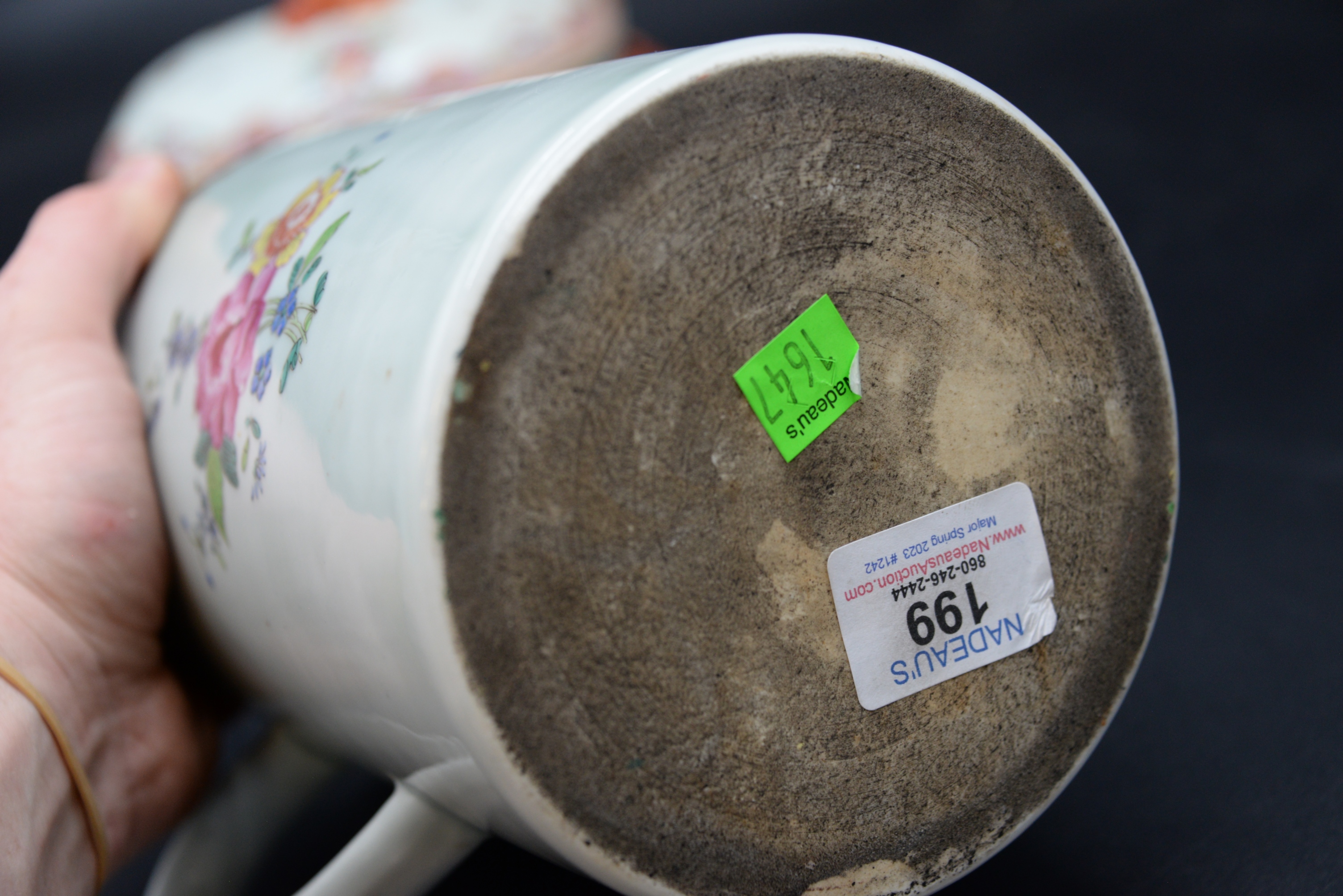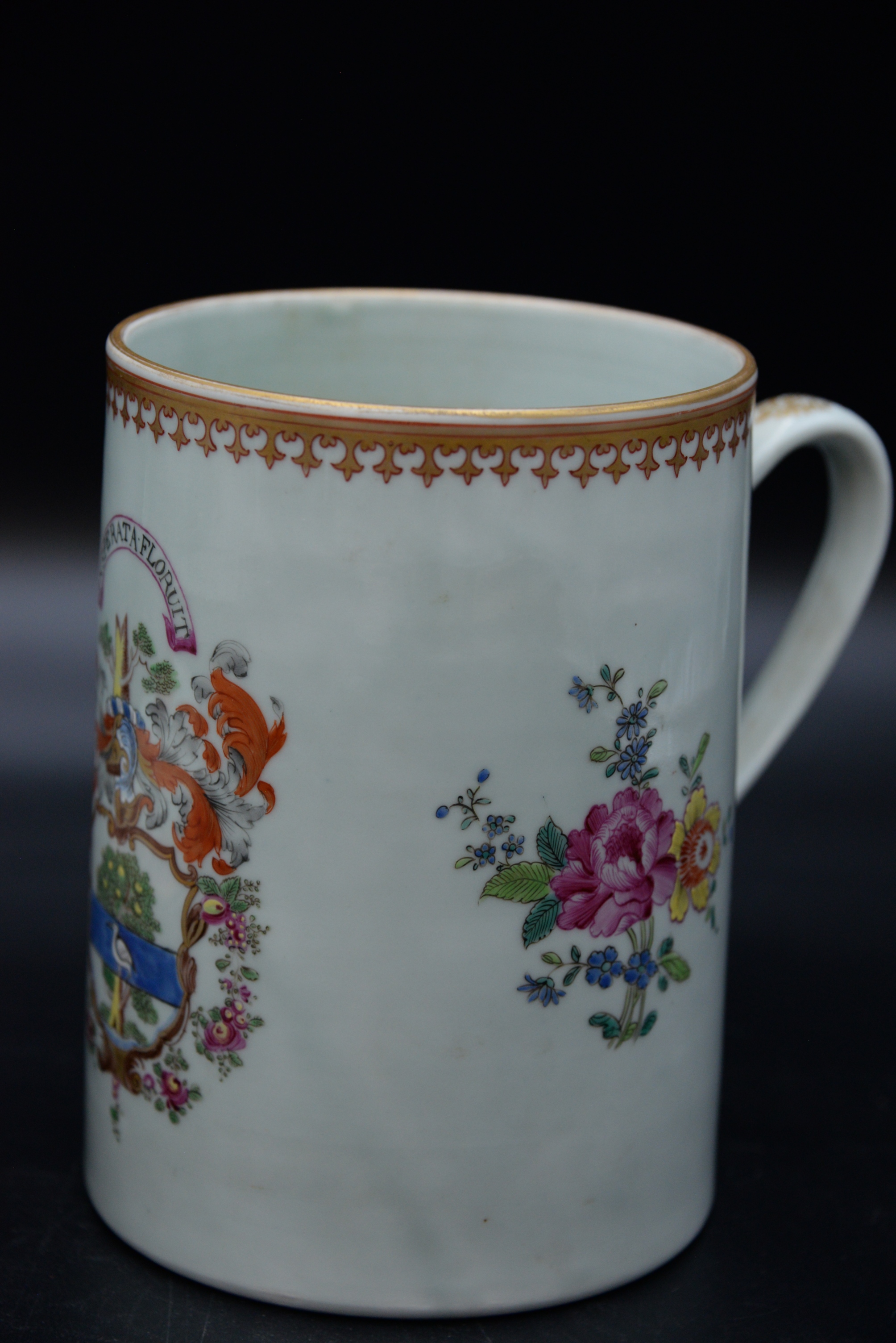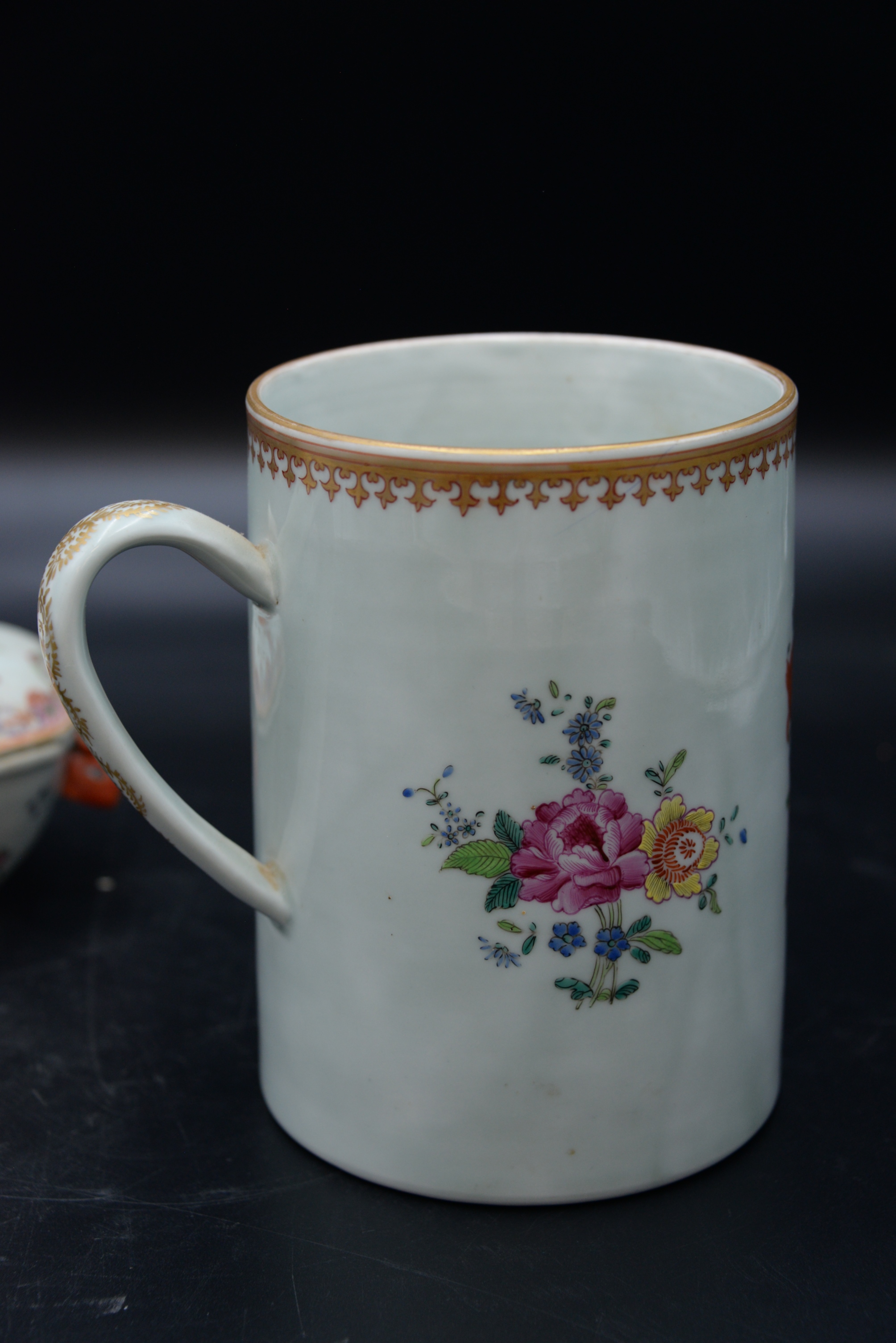 Two Chinese Export Porcelain Pieces, to include a large armorial handle mug marked “Insperata Floruit” with shield, height 7 1/4 inches; along with small tureen having boars head handles and cover, height 4 inches, width 7 inches.