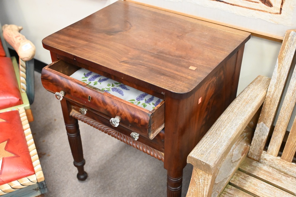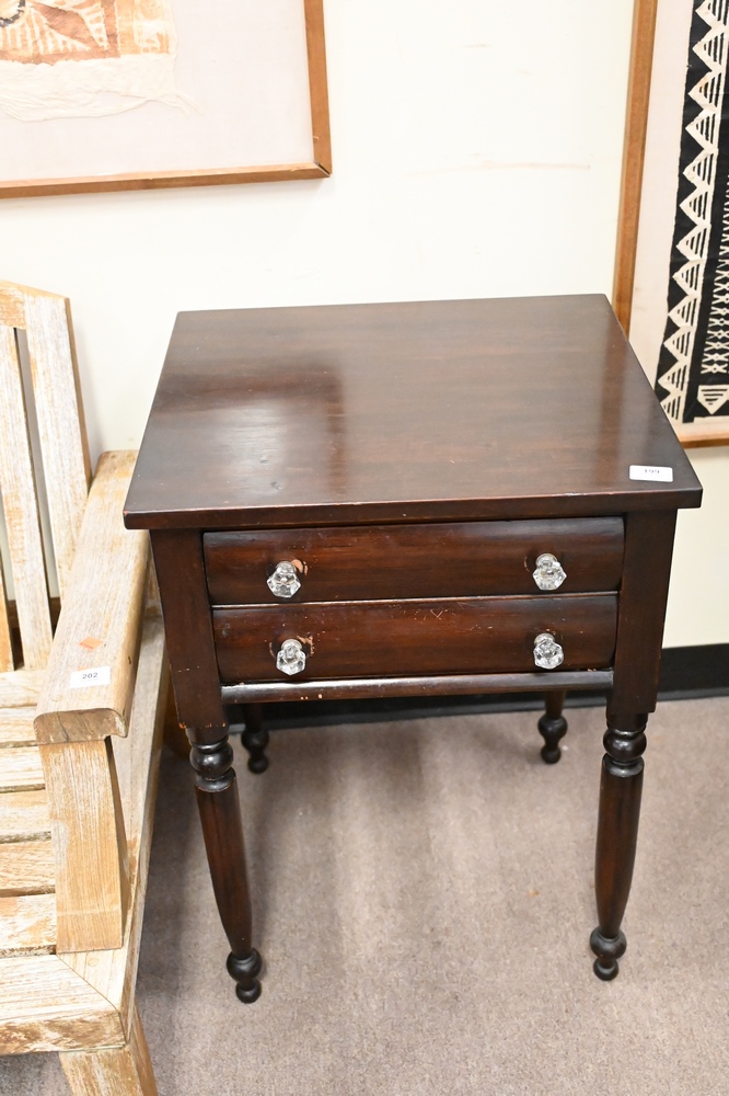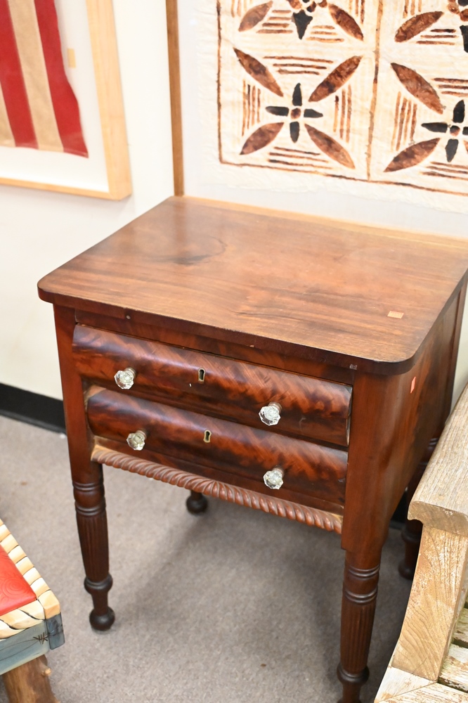 Lot 199: Two Mahogany Empire Stands, each having two drawers with glass pulls, raised over turned legs, height 29 and 29 1/2 inches, tops 18 1/2″ x 24″, and 19″ x 21″.