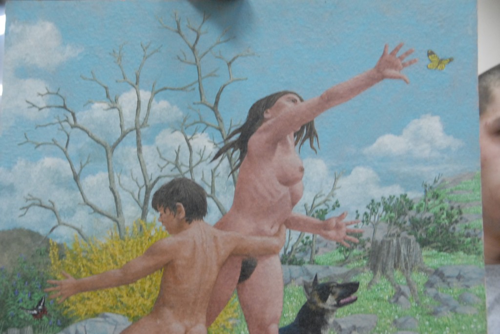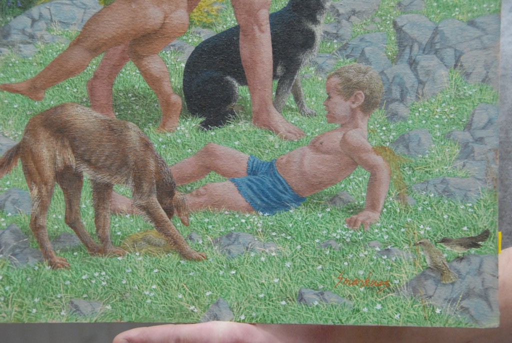 Vincent T. Smarkusz 1919-1974 oil on Masonite with nudes and two dogs., 24 x 19.
