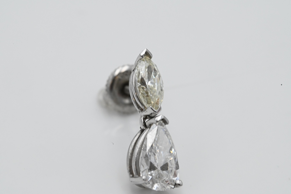White Gold Single Pierced Earring, set with marquise diamond over teardrop diamond; teardrop 8.7 millimeter, 5.5 millimeters at widest, 3.5 millimeters.