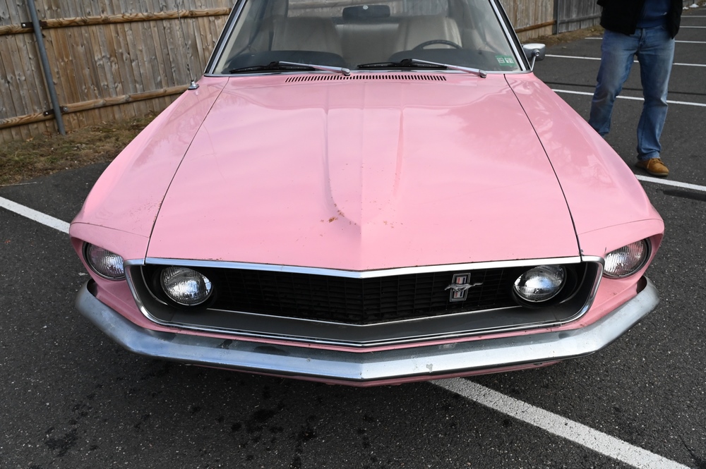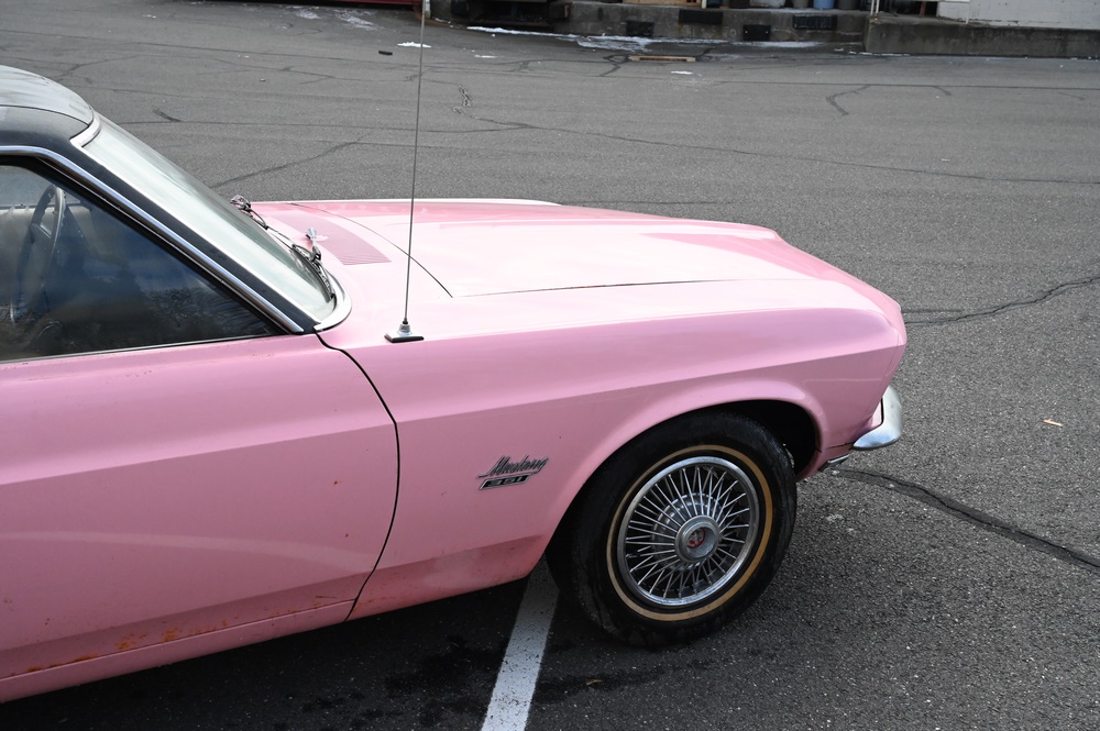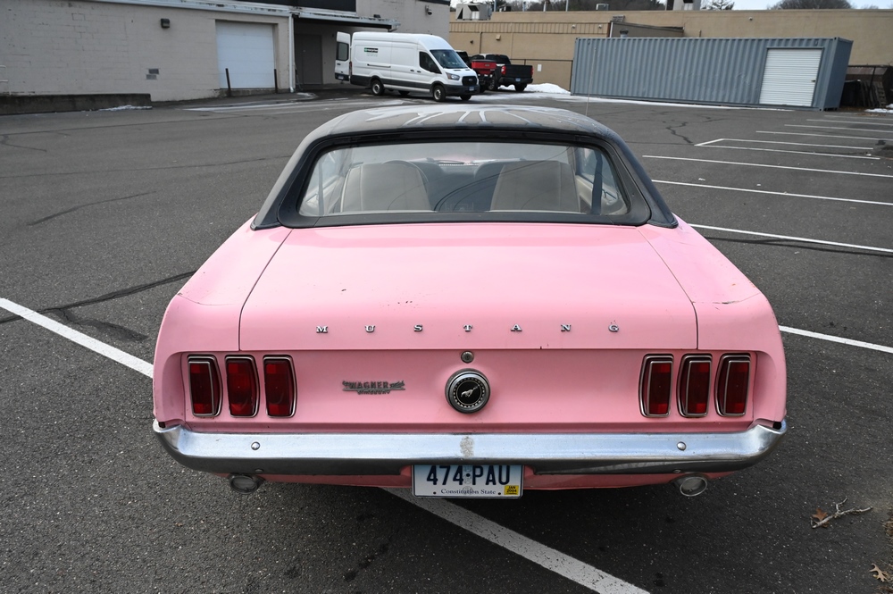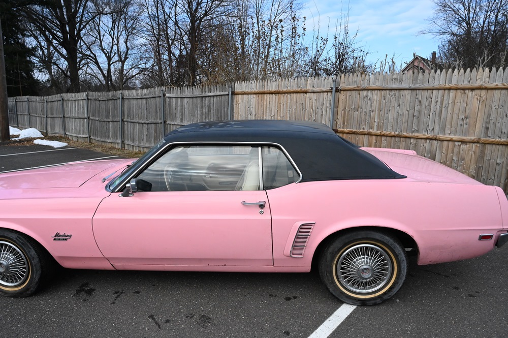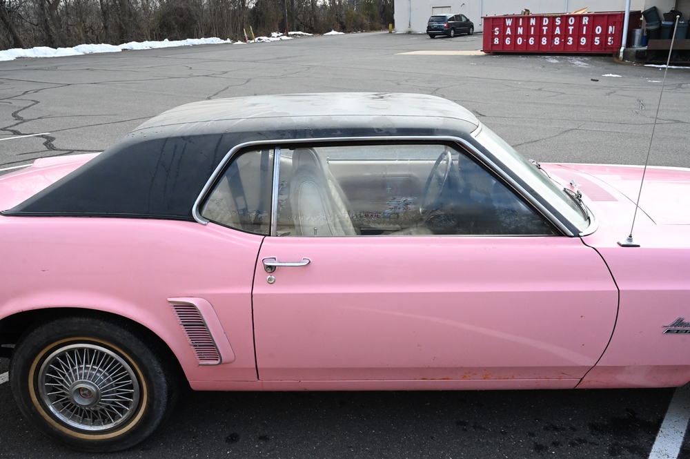 Lot 1A: 1969 351 Ford Mustang, single family owner, having Windsor V-8 5.8L engine with 39,158 miles, with original pink paint job and black vinyl top, VIN T01H141100. ***TERMS: For online participation – once the car sells we require the winning bidder to call our office immediately to make payment or a 20% deposit.**