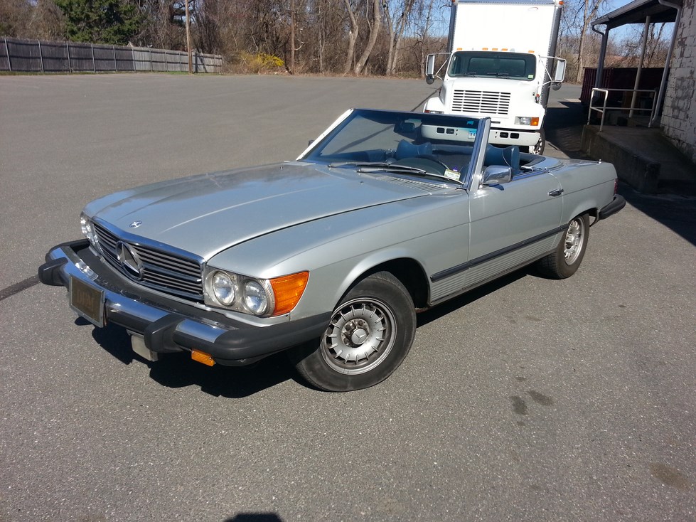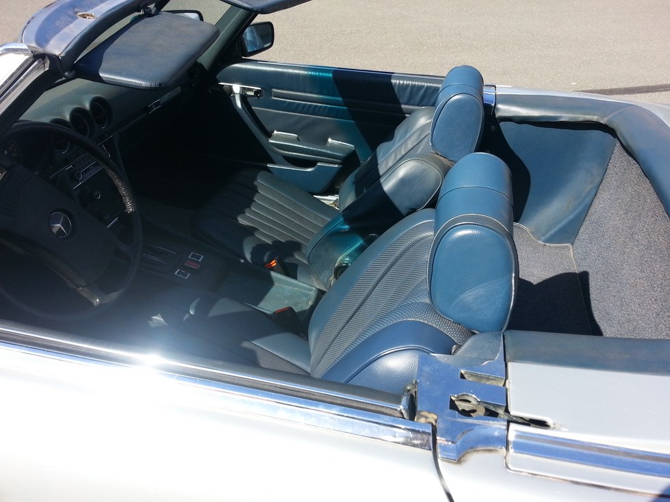 1975 Mercedes 450 SL, silver with navy blue interior having removable top, 132K miles, two owners.