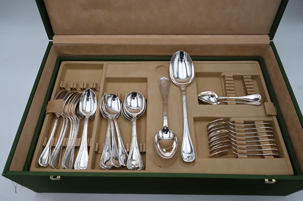 89 Piece Christofle Silver Plated Flatware Setting, in two fitted Christofle boxes, to include 8 dinner forks, 4 luncheon forks, 13 salad forks, 12 tablespoons, 10 teaspoons, 12 soup spoons, 6 serving, 12 dinner knives, along with 12 luncheon knives.