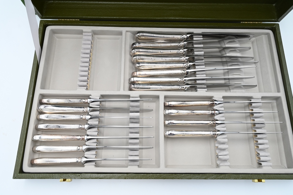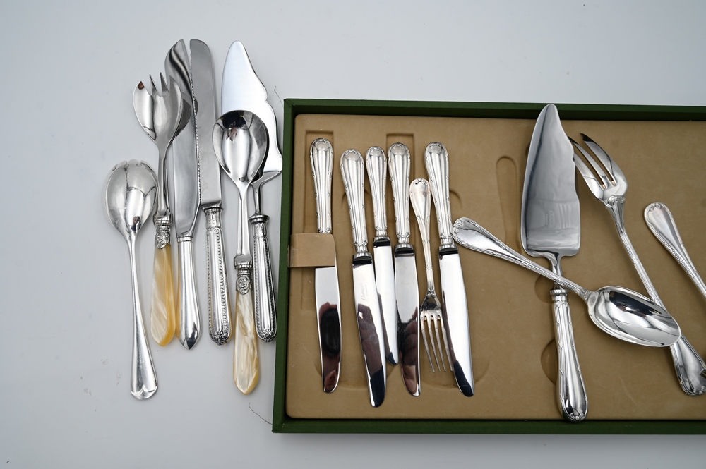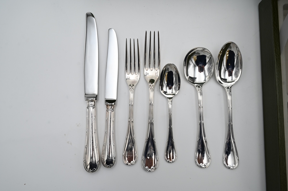 Lot 1A: 89 Piece Christofle Silver Plated Flatware Setting, in two fitted Christofle boxes, to include 8 dinner forks, 4 luncheon forks, 13 salad forks, 12 tablespoons, 10 teaspoons, 12 soup spoons, 6 serving, 12 dinner knives, along with 12 luncheon knives.
