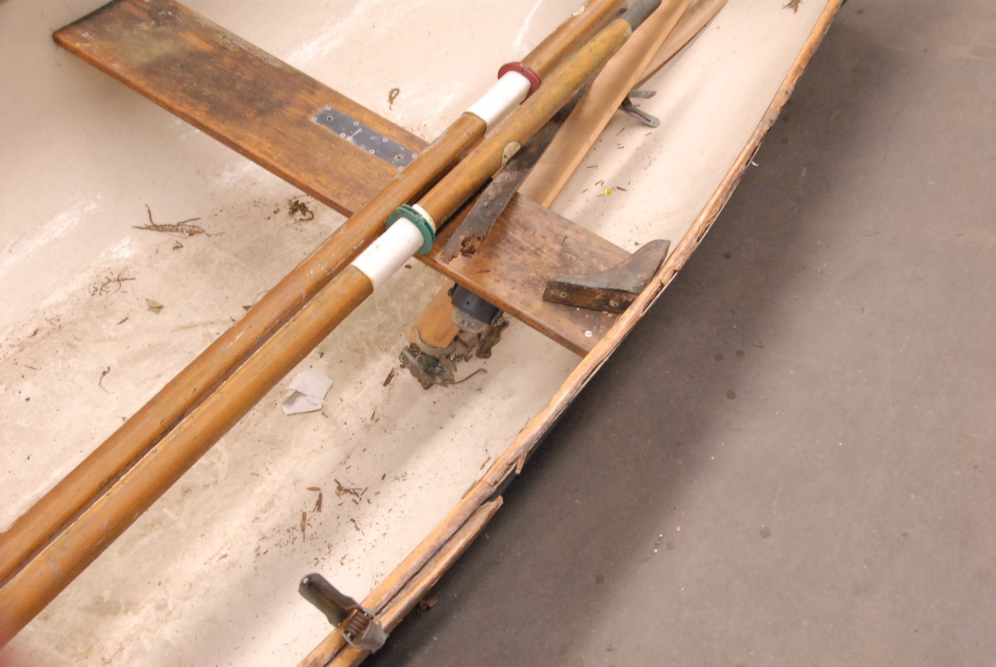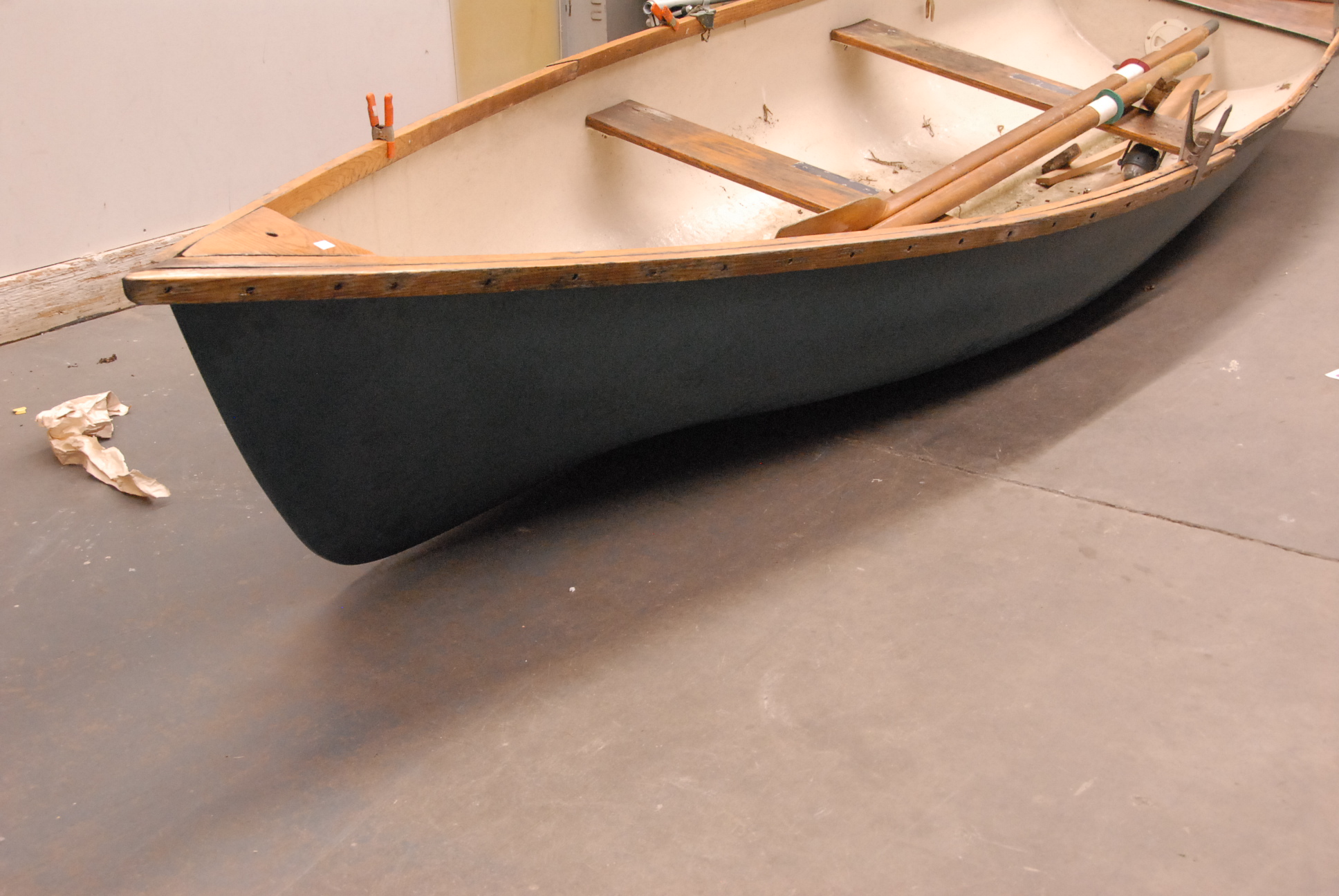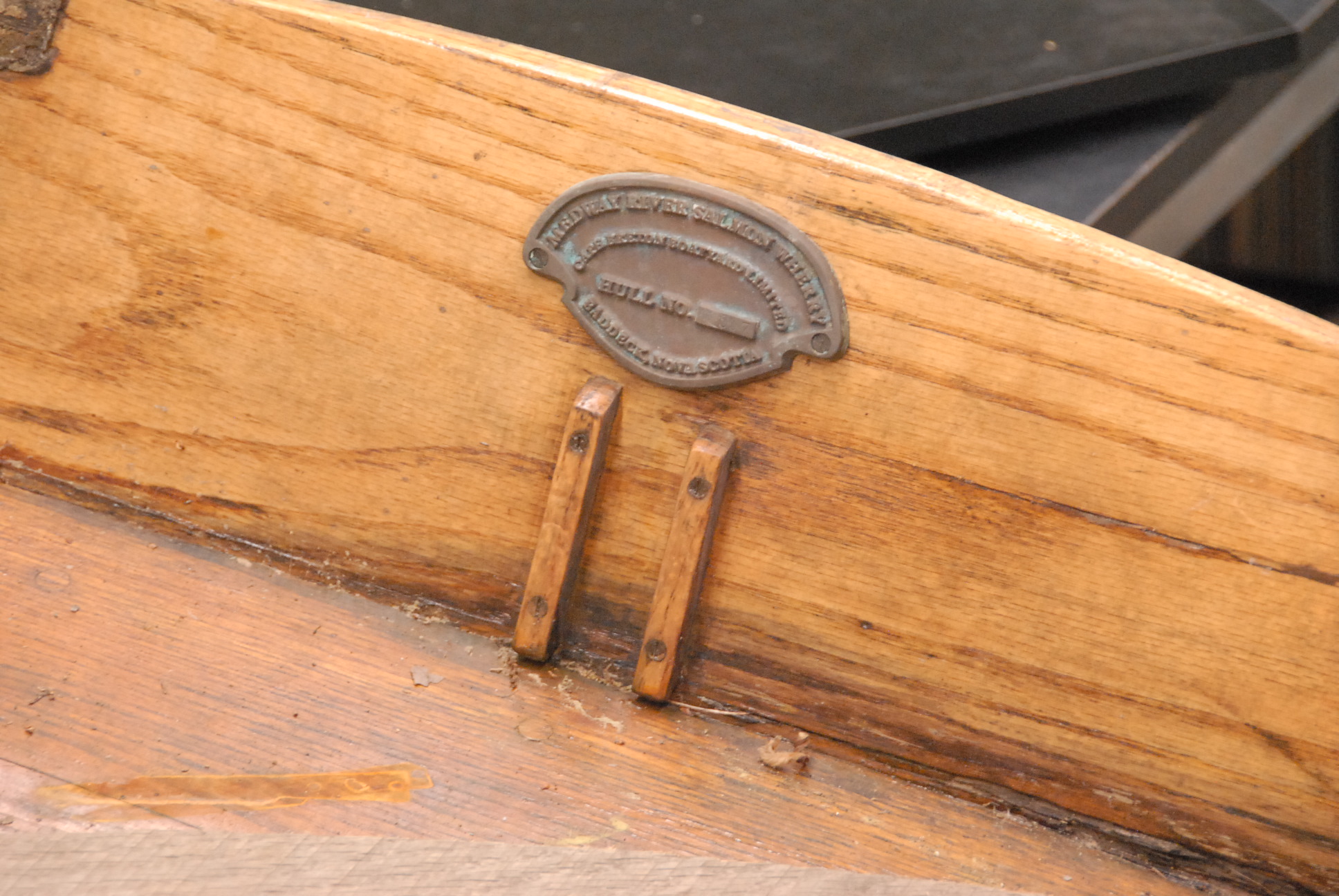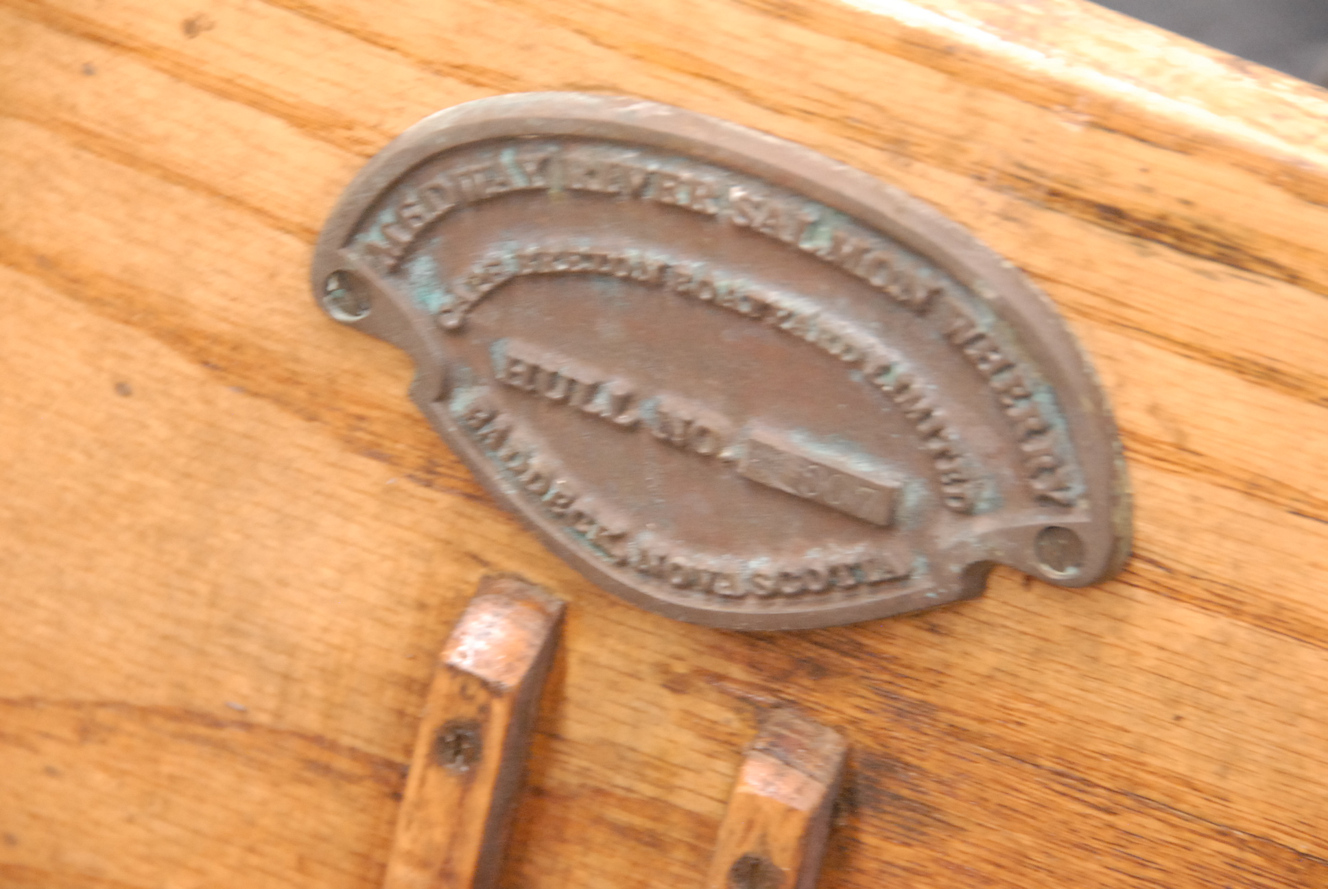 Fiberglass boat with mounted brass plaque that reads Medway River Salmon Wherry, Care Breton Boatyard Limited, Hull No. 007, Baddeck Nova Scotia.