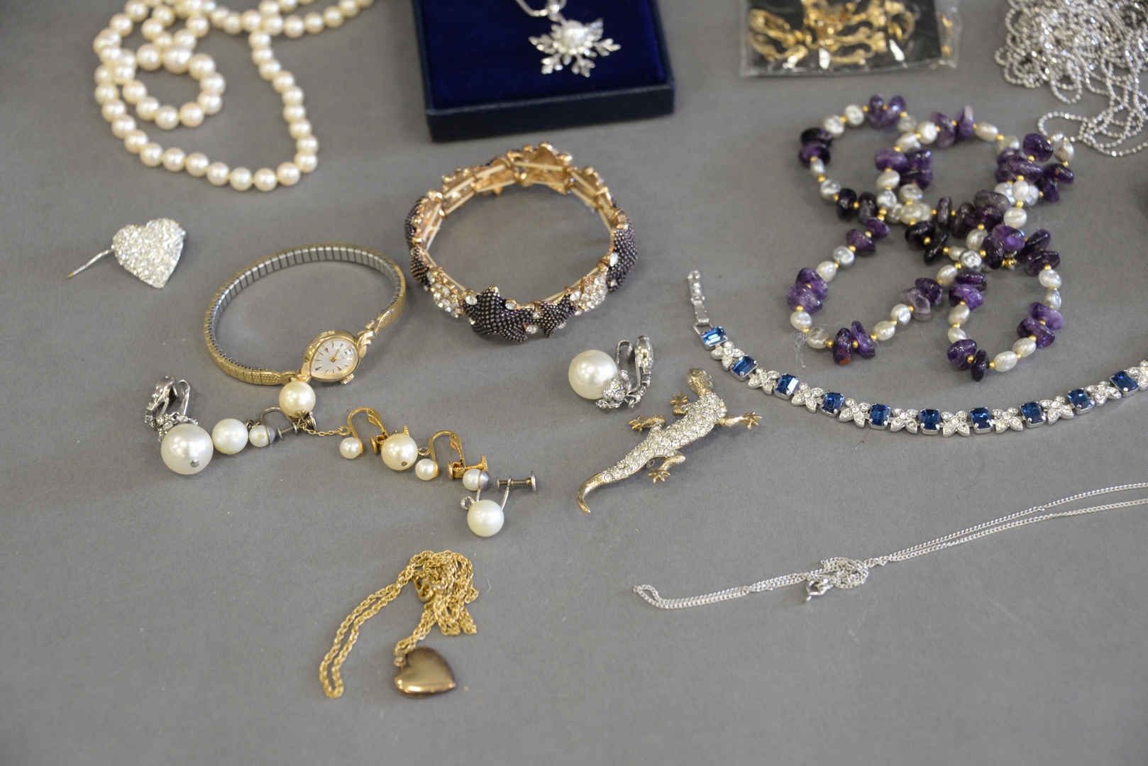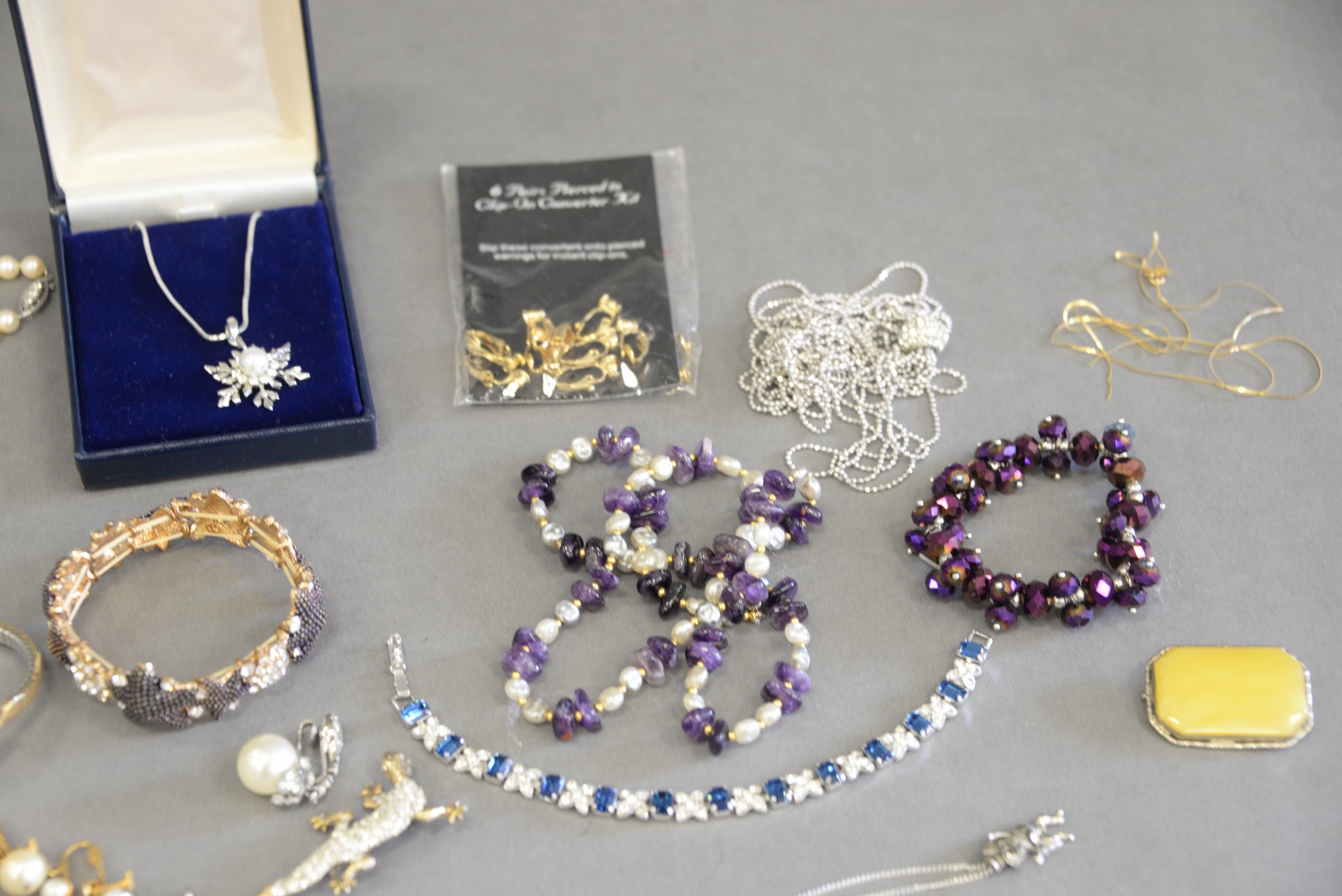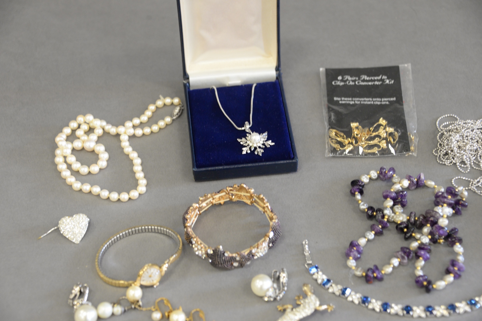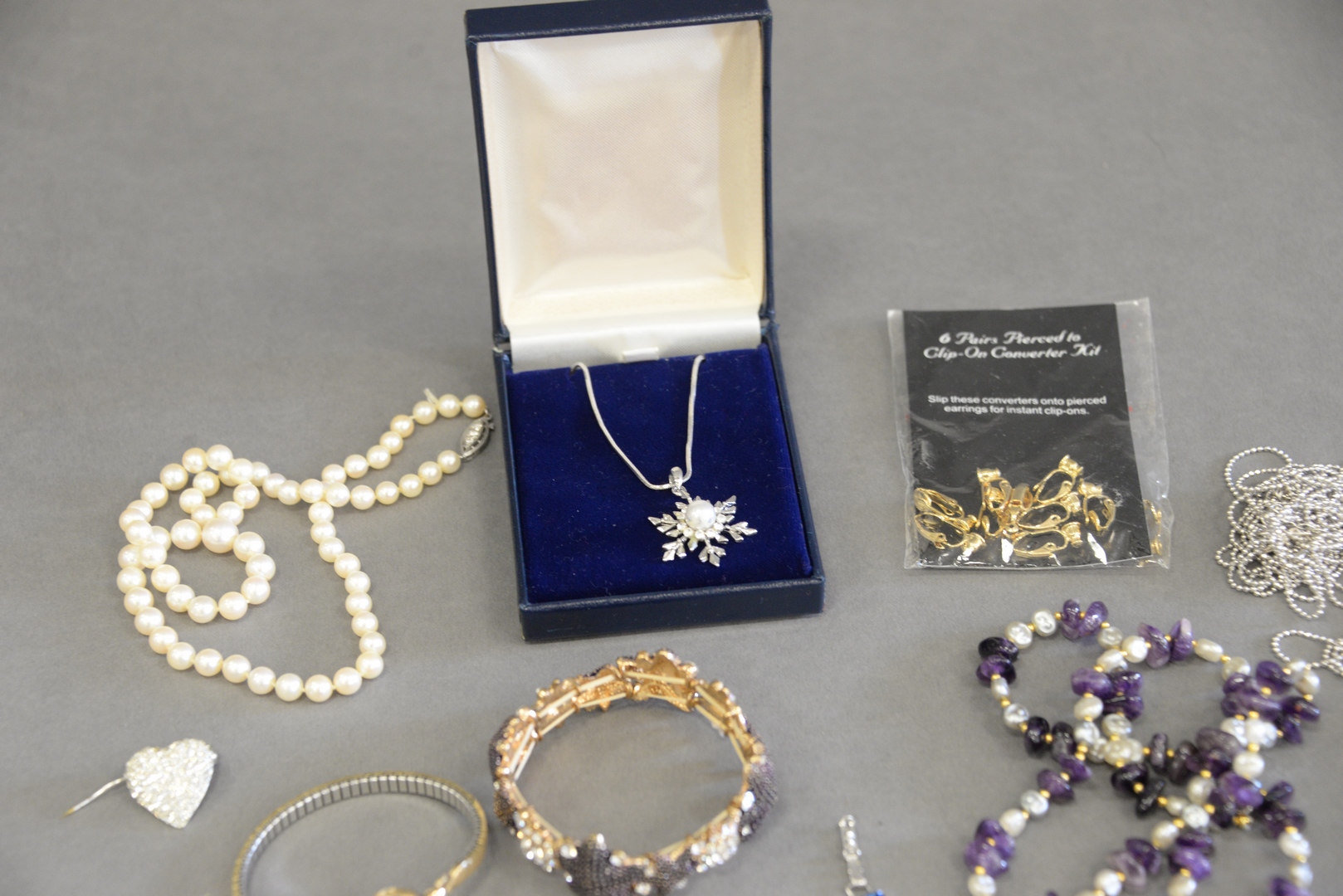 Single String of Graduated Pearls, having 14 karat white gold clas, aloong with several pieces of costume jewelry, length 18 inches, 5.8mm – 9.1mm