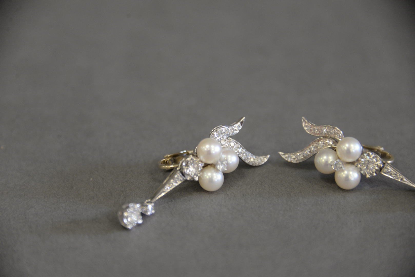 Lot 1H: Pair of 14 Karat White Gold Earrings, set with diamonds and pearls, clip on, length 1 3/4 inches, total weight 10.3 grams.