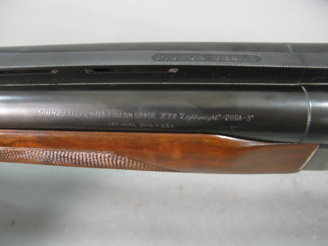 Winchester model 23XTR Pigeon Grade double barrel shotgun, twin ivory beads on matted vent rib, 20 gauge, 3 barrel with scroll engraved factory bright action, trigger guard and break lever with checkered beavertail forearm, marked M/23 Pigeon Grade lightweight, made in Japan. Serial# PWK202785, code 34