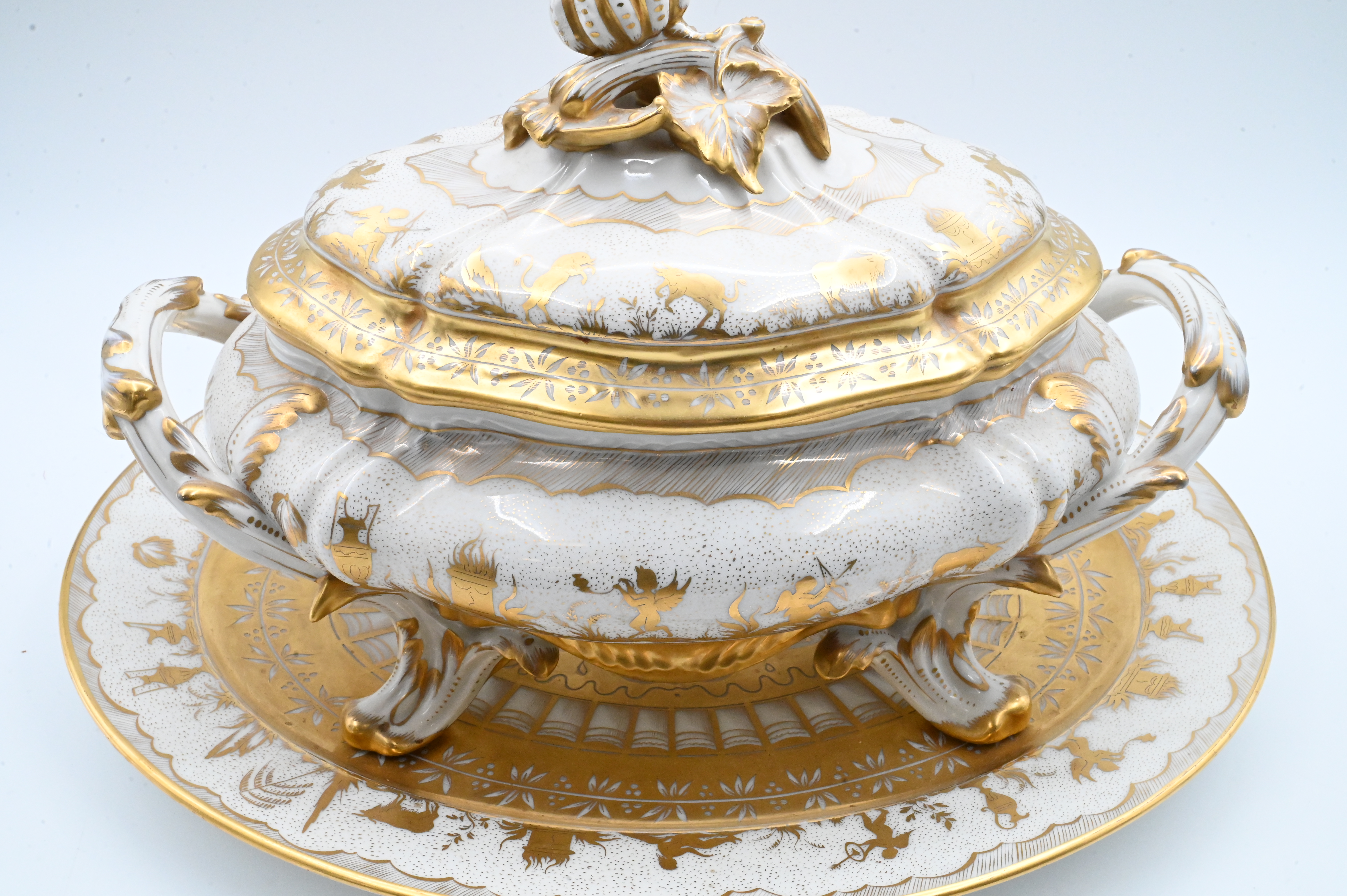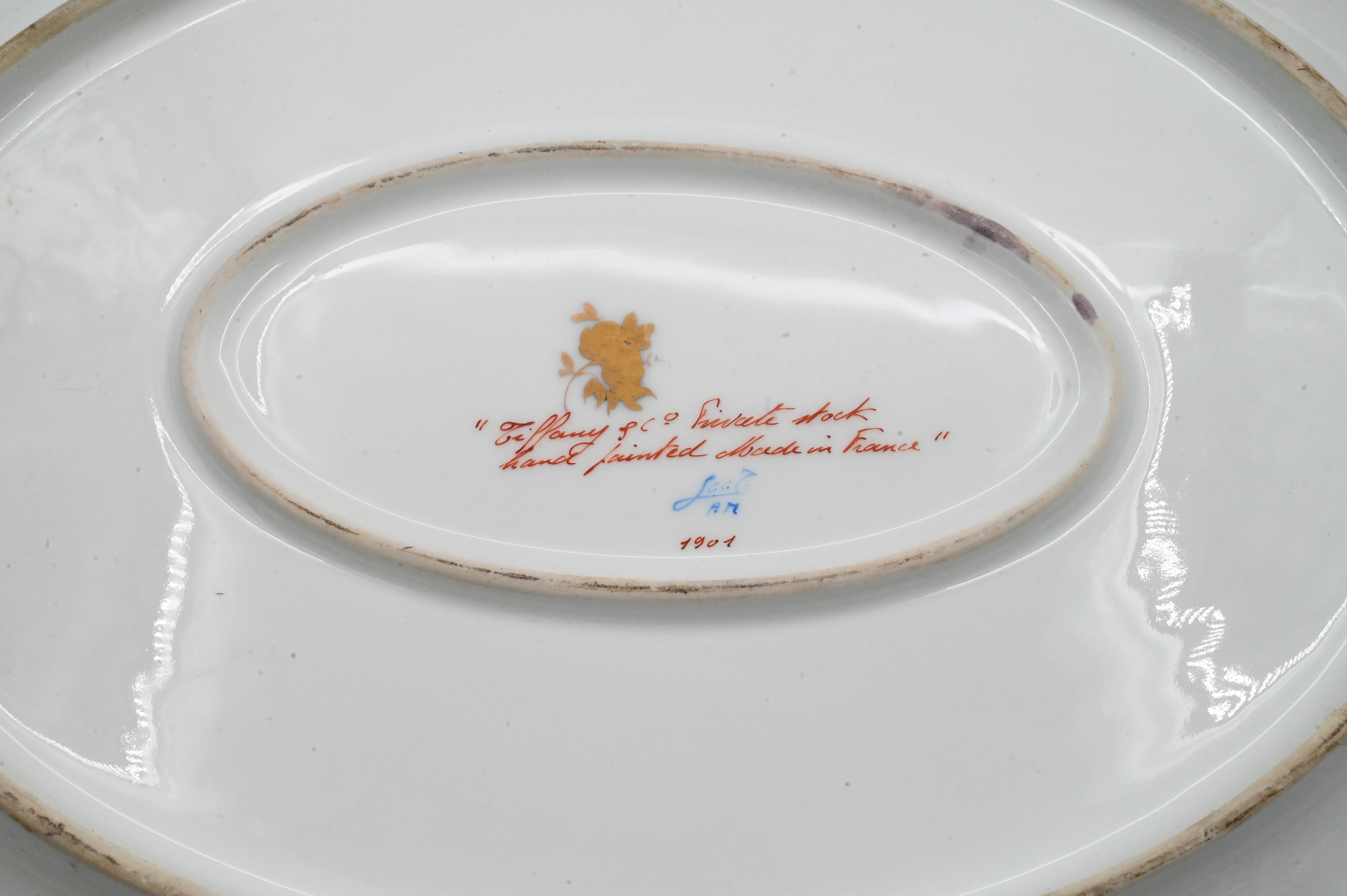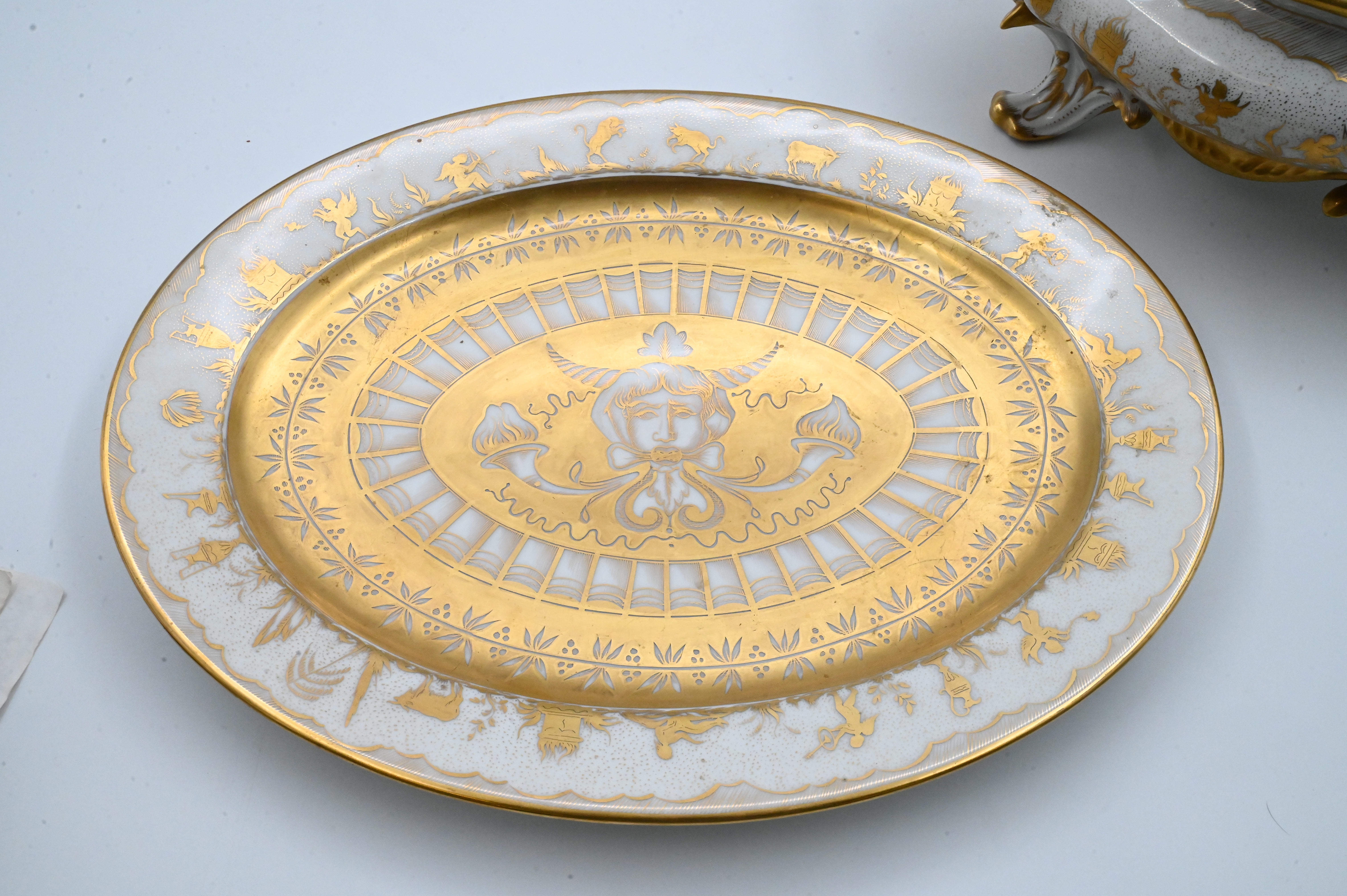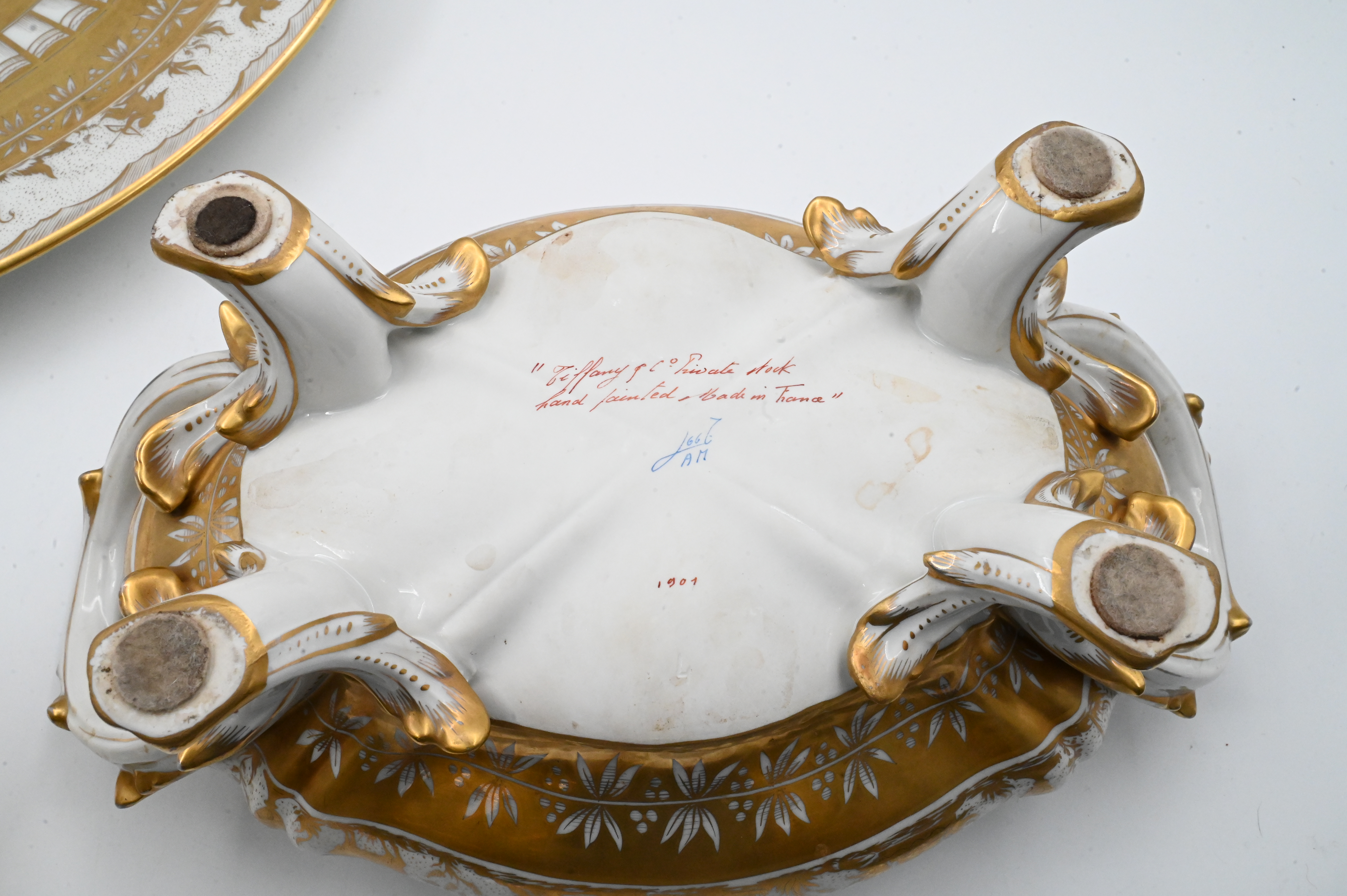 richly decorated hand-painted Limoges porcelain tureen with matching cover and undertray, produced by Atelier Le Tallec for Tiffany & Co. in the elaborate “Horoscope” pattern, the platter and tureen are decorated throughout with raised and burnished gilt, incorporating zodiac symbols and neoclassical motifs, the tureen features a detailed cover surmounted by an openworked gilded gourd-and-leaf finial, and branch-form handles extending into gilt feet, both the platter and the tureen are marked underneath “TIFFANY & CO. PRIVATE STOCK / HANDPAINTED / MADE IN FRANCE”, together with the Le Tallec blue mark and additional impressed and painted marks