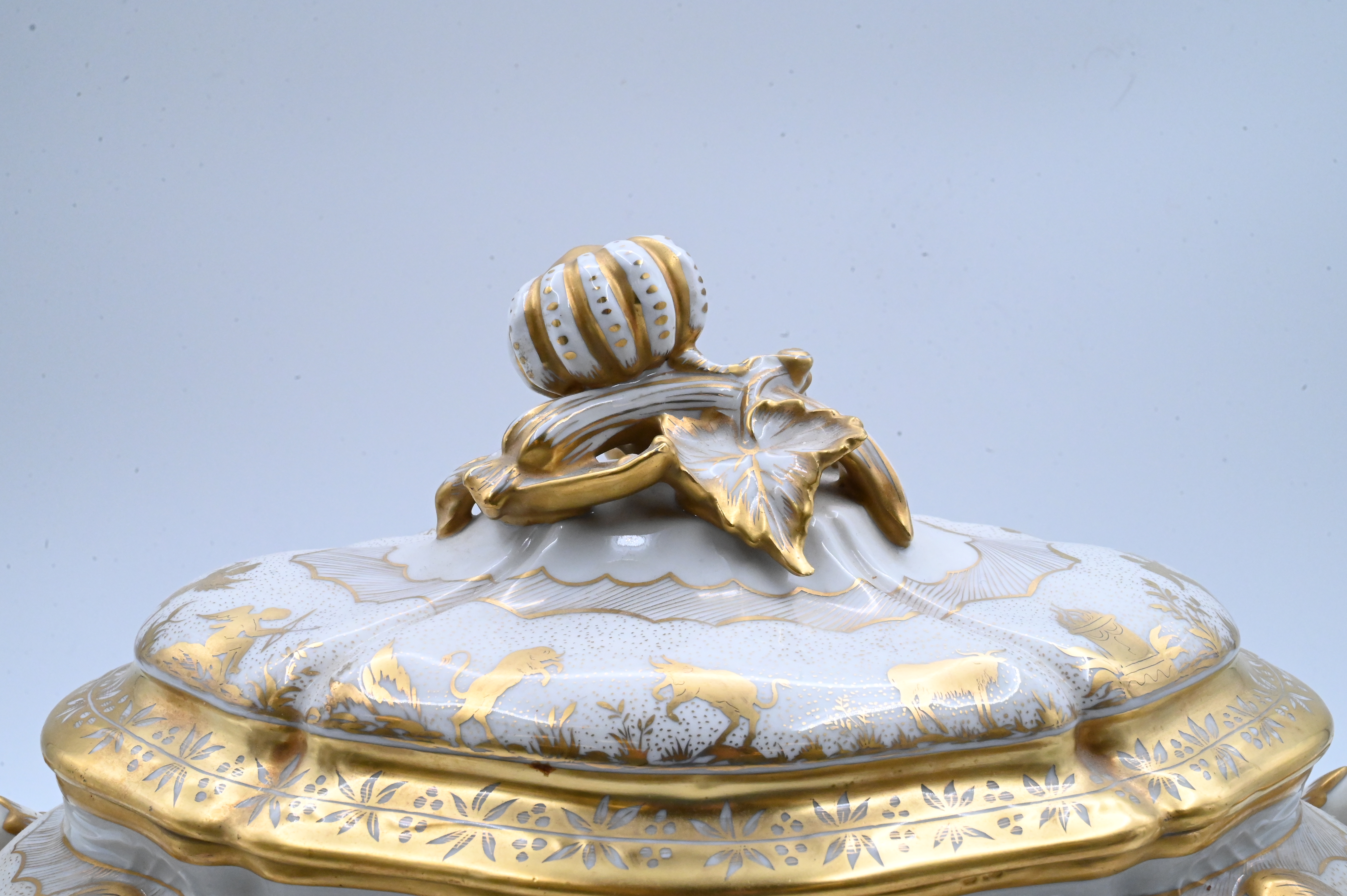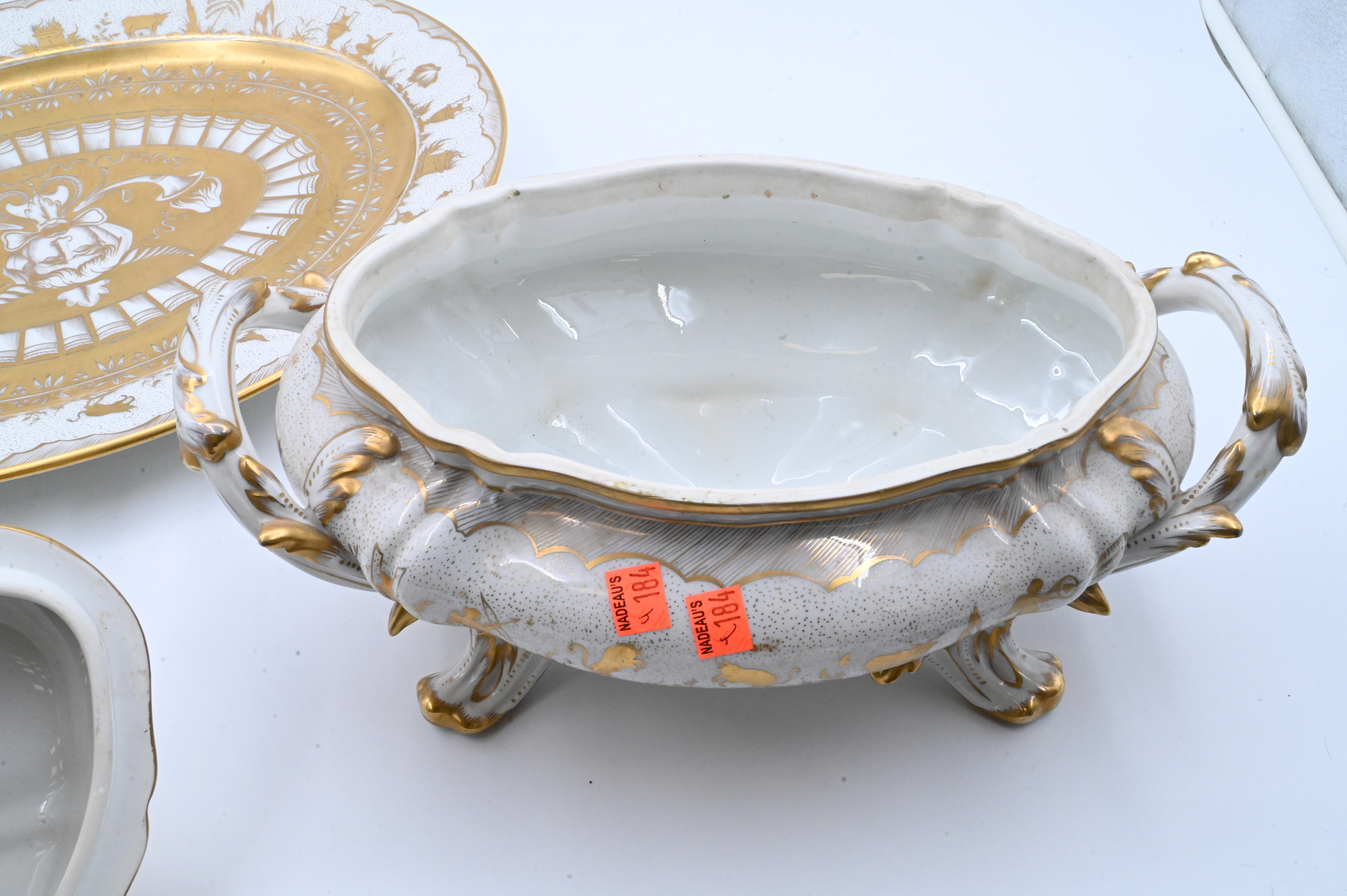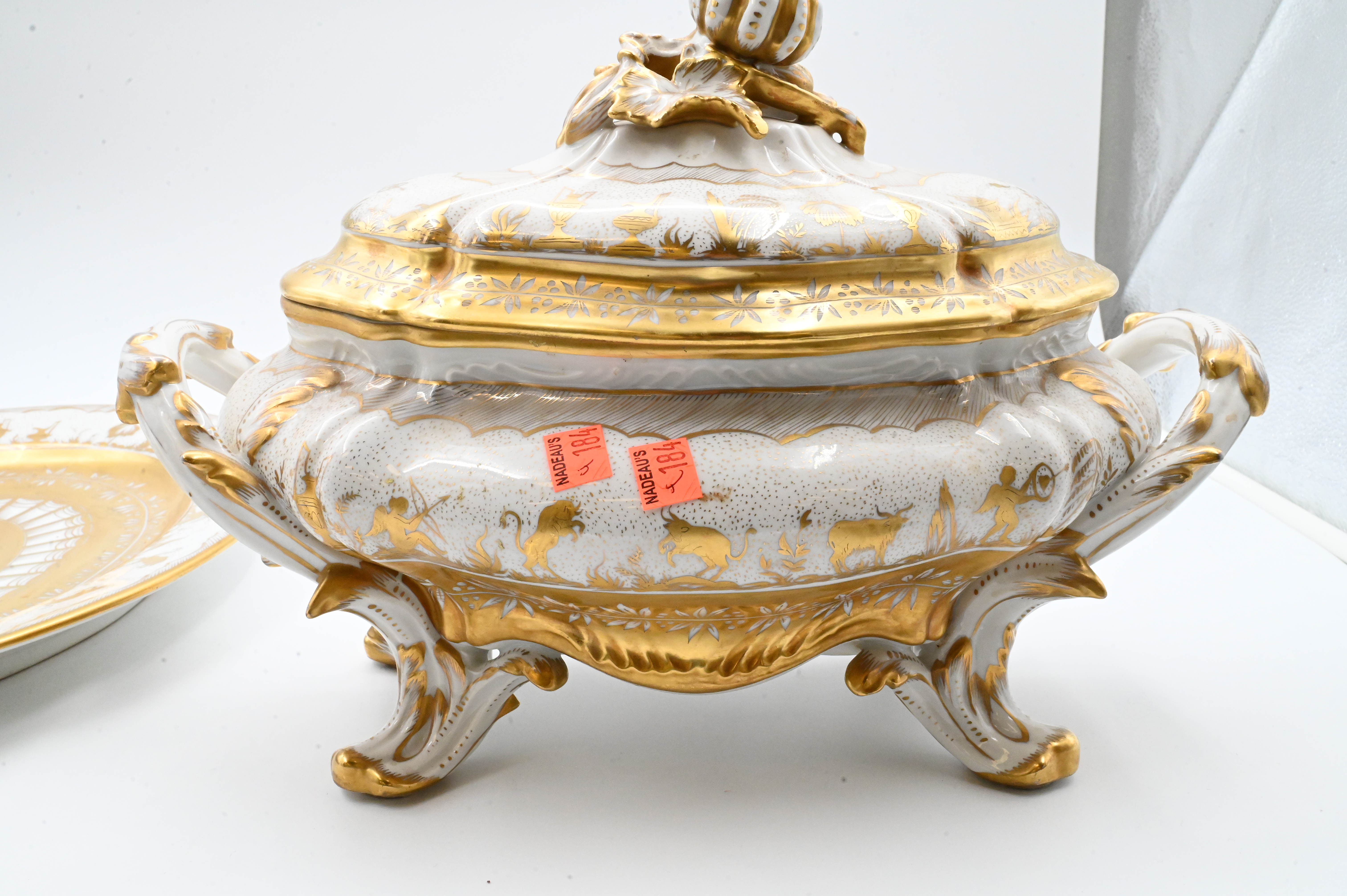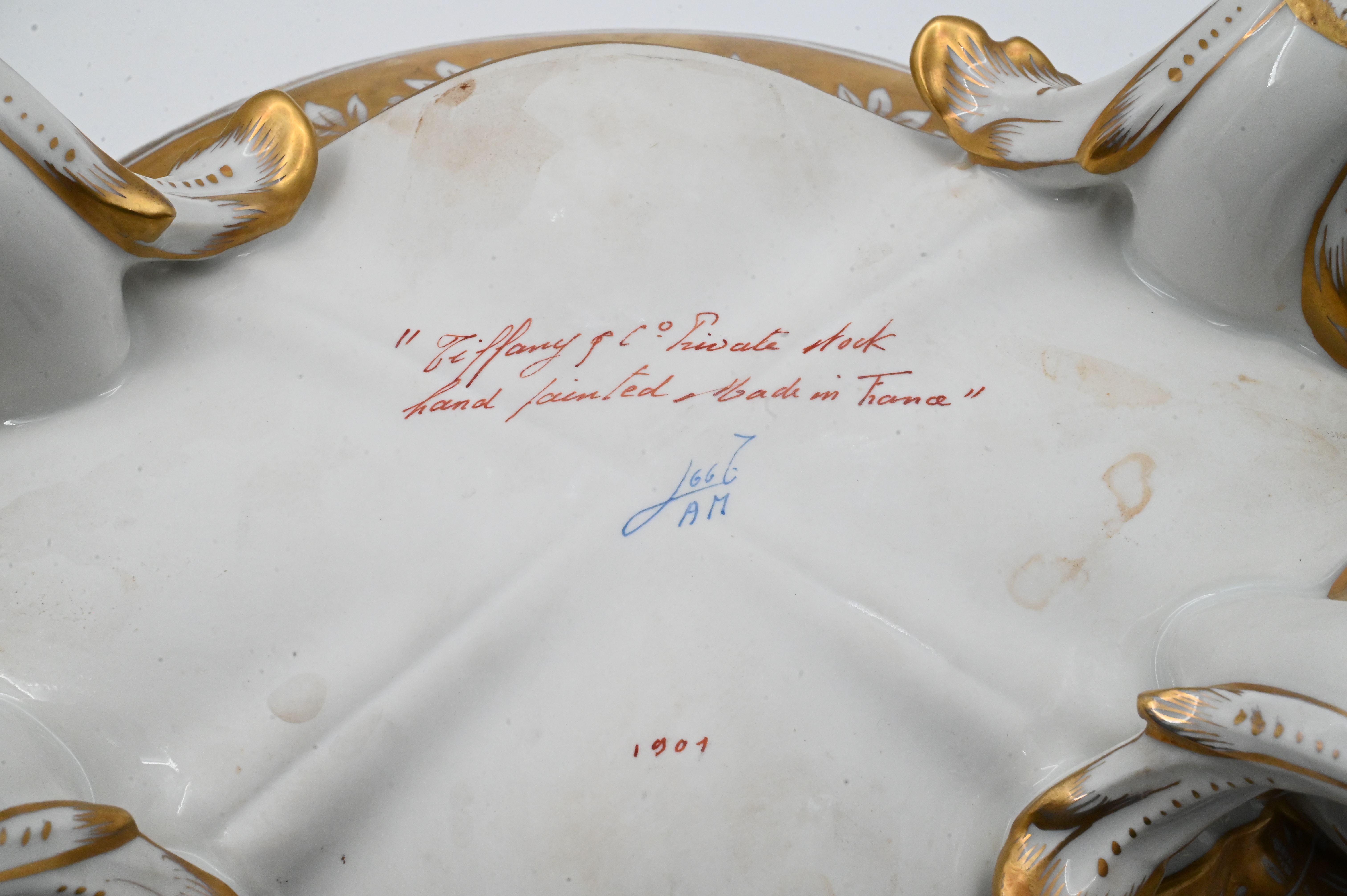 richly decorated hand-painted Limoges porcelain tureen with matching cover and undertray, produced by Atelier Le Tallec for Tiffany & Co. in the elaborate “Horoscope” pattern, the platter and tureen are decorated throughout with raised and burnished gilt, incorporating zodiac symbols and neoclassical motifs, the tureen features a detailed cover surmounted by an openworked gilded gourd-and-leaf finial, and branch-form handles extending into gilt feet, both the platter and the tureen are marked underneath “TIFFANY & CO. PRIVATE STOCK / HANDPAINTED / MADE IN FRANCE”, together with the Le Tallec blue mark and additional impressed and painted marks