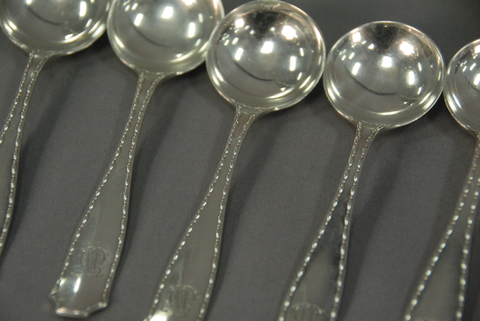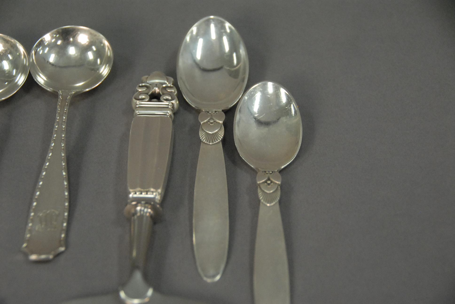 Lot 2: Five Tiffany soup spoons, pair of Georg Jensen spoons, small fork, cheese slicer, and Michelsen spoon, 7.8 t oz.