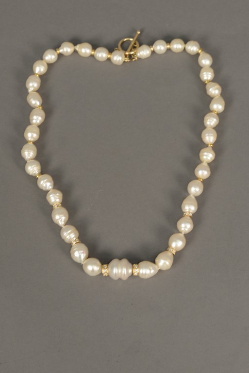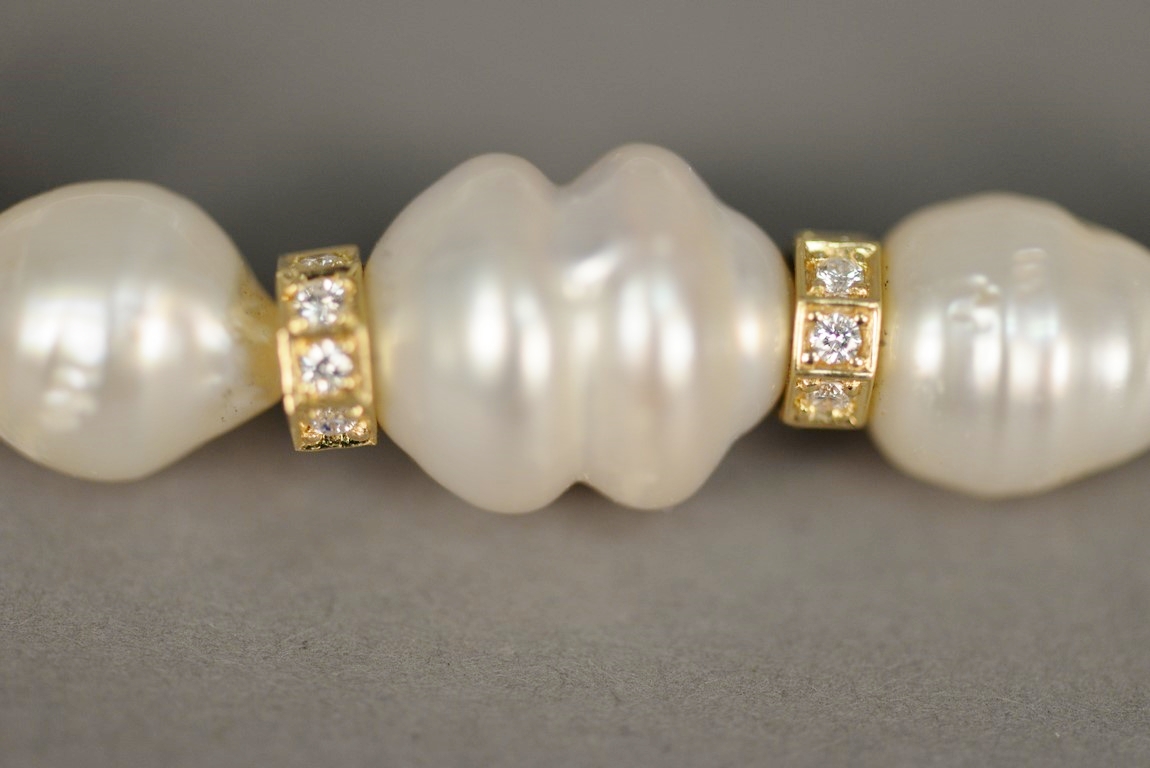 Lot 2: Graduated strand of individually knotted baroque South Sea cultured pearls with yellow gold and bead set diamond spacers and a yello…
