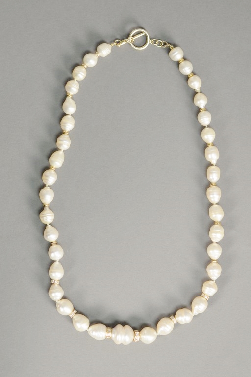 Graduated strand of individually knotted baroque South Sea cultured pearls with yellow gold and bead set diamond spacers and a yellow gold rondelle toggle clasp. The strand measures approximately 21 3/4 in length and contains thirty-six 36 cultured pearls ranging in size from 10-13.5mm each, cream color with rose overtone, moderately to heavily blemished with fourteen rondelle spacers and six bead set diamond spacers. Total estimated diamond weight: 1.32 carats, color G-H, clarity SI