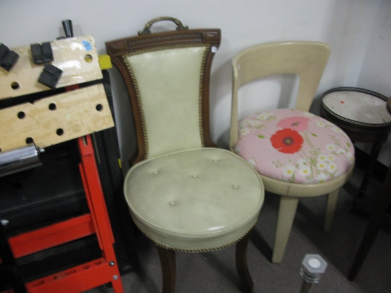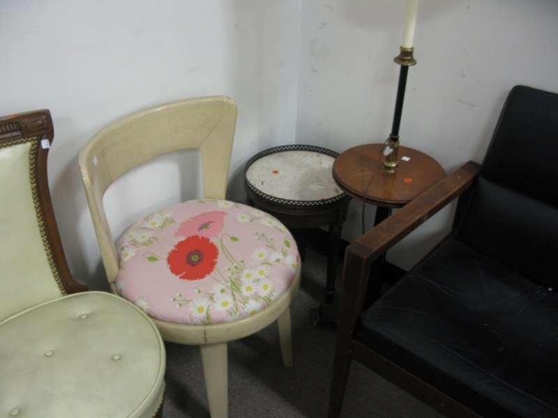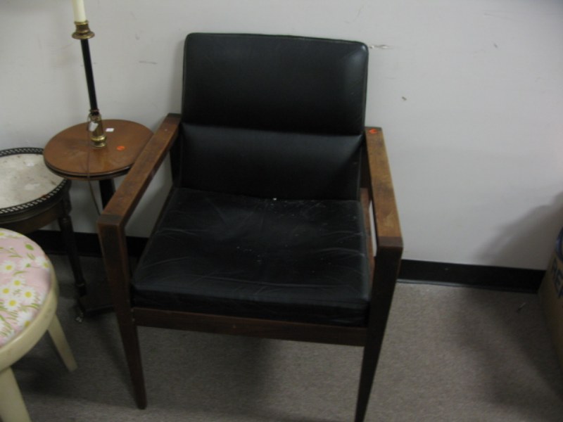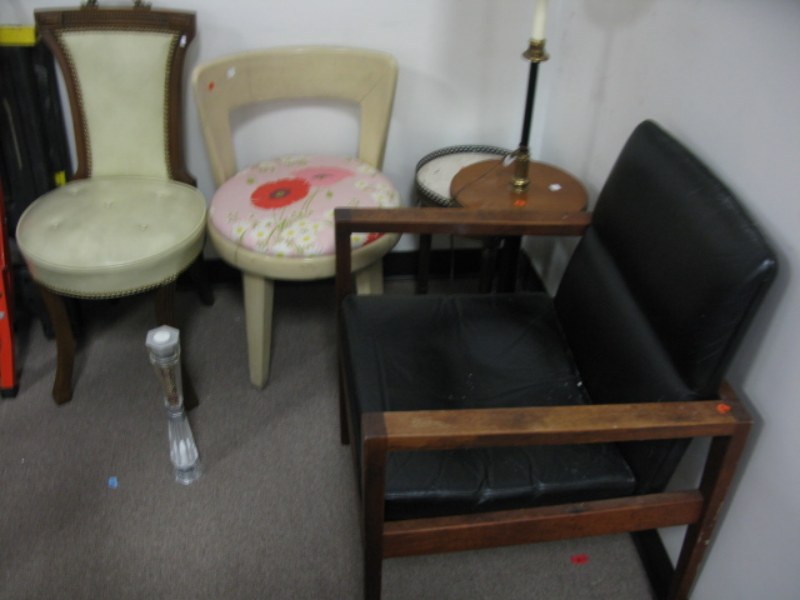 Group lot to include Danish modern chair, 2 stands, 2 small chairs, box of pocketbooks, pillows, and blankets.