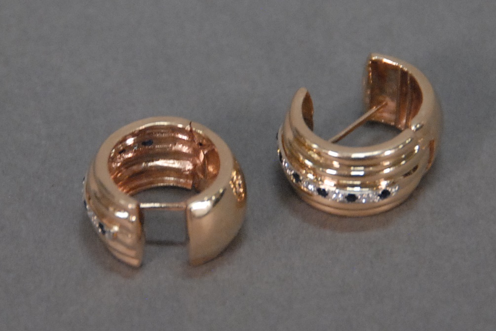 Pair of 14K earrings set with small diamonds and sapphires, 14 grams.