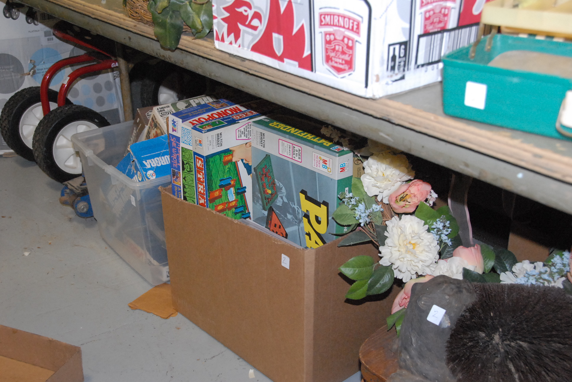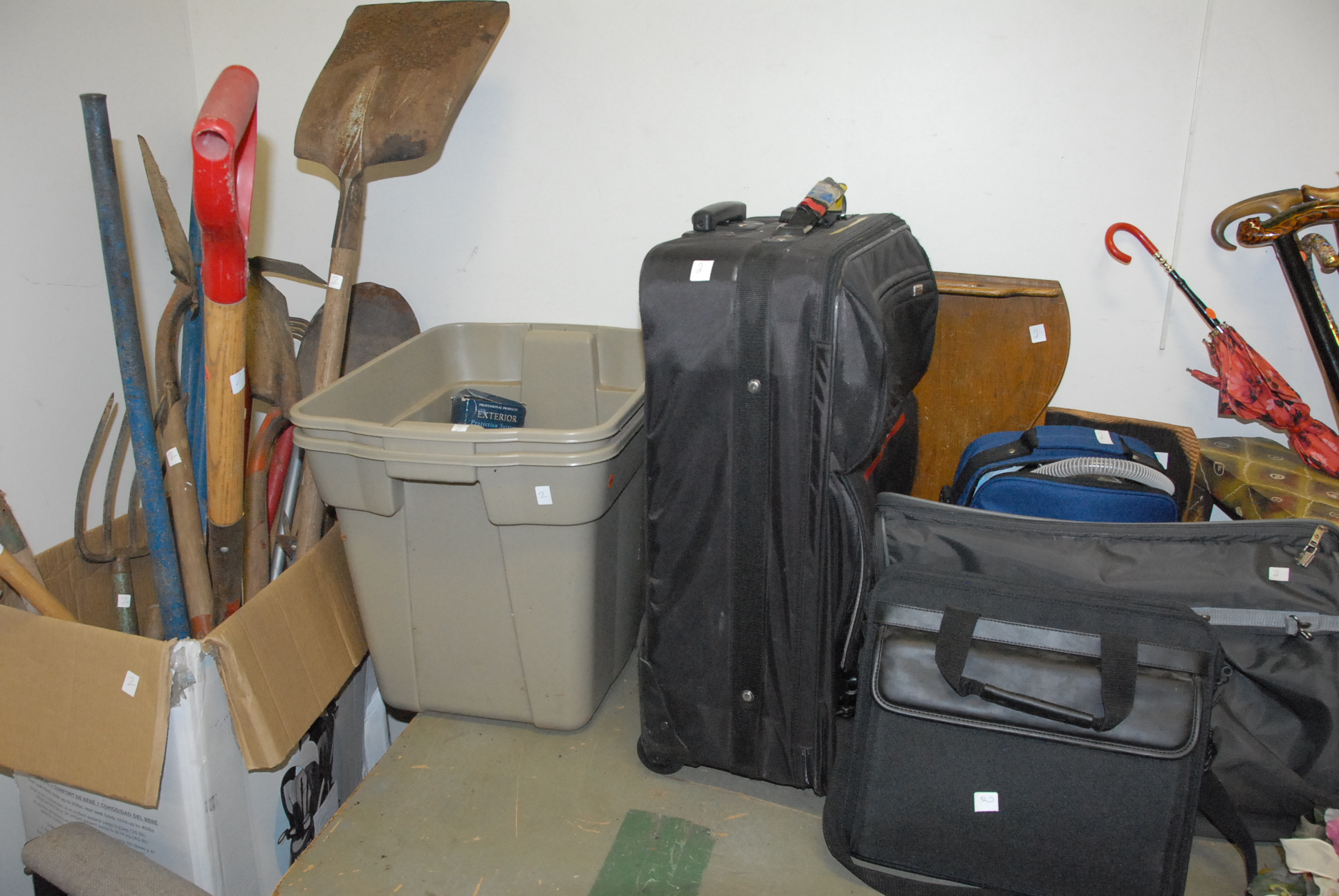 Table lot and under table to include an enlarger, tackle box, knife sharpener, suitcases, a stool, jumper cables, games, a jack, gardening tools, and a garden scooter with wheels, etc.