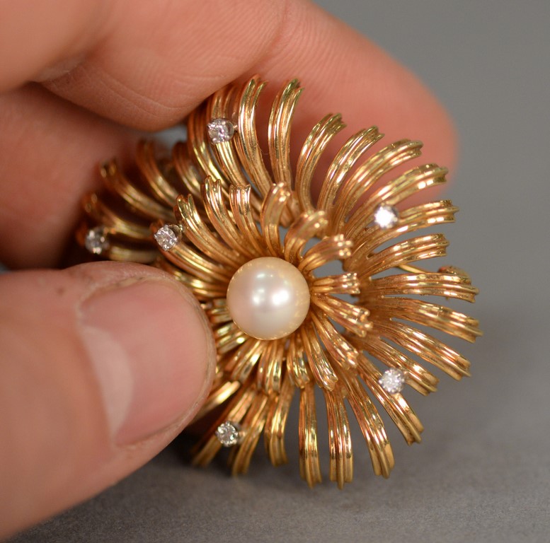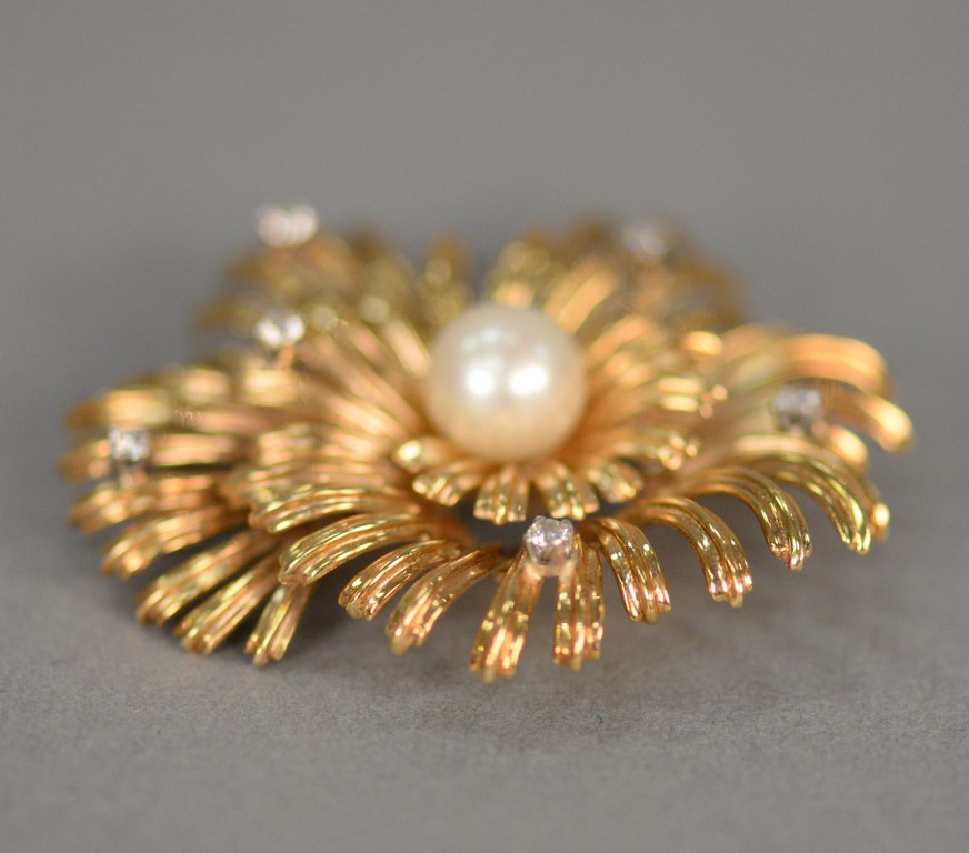 Lot 2: Tiffany 14K gold flower brooch set with center pearl and six small diamonds. 16.9 grams dia. 1 1/2 in.