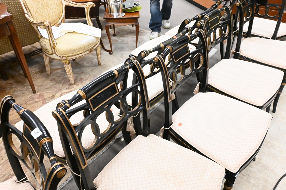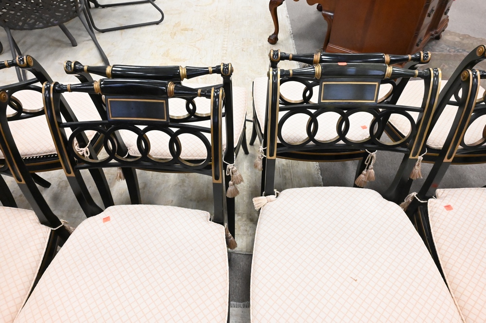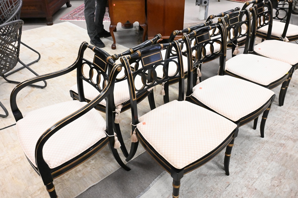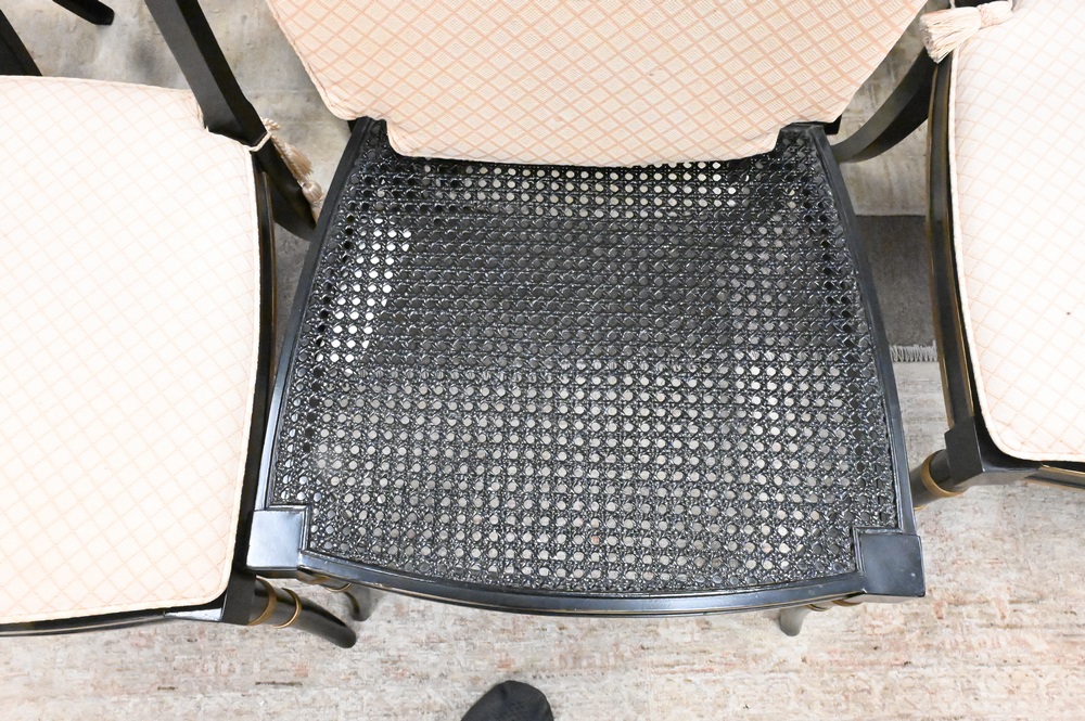 Lot 20: Baker Set of 10 Historic Charleston Chairs, to include 2 arm and 8 side, all with custom cushions over caned seats, height 32 inches, width 20 inches.