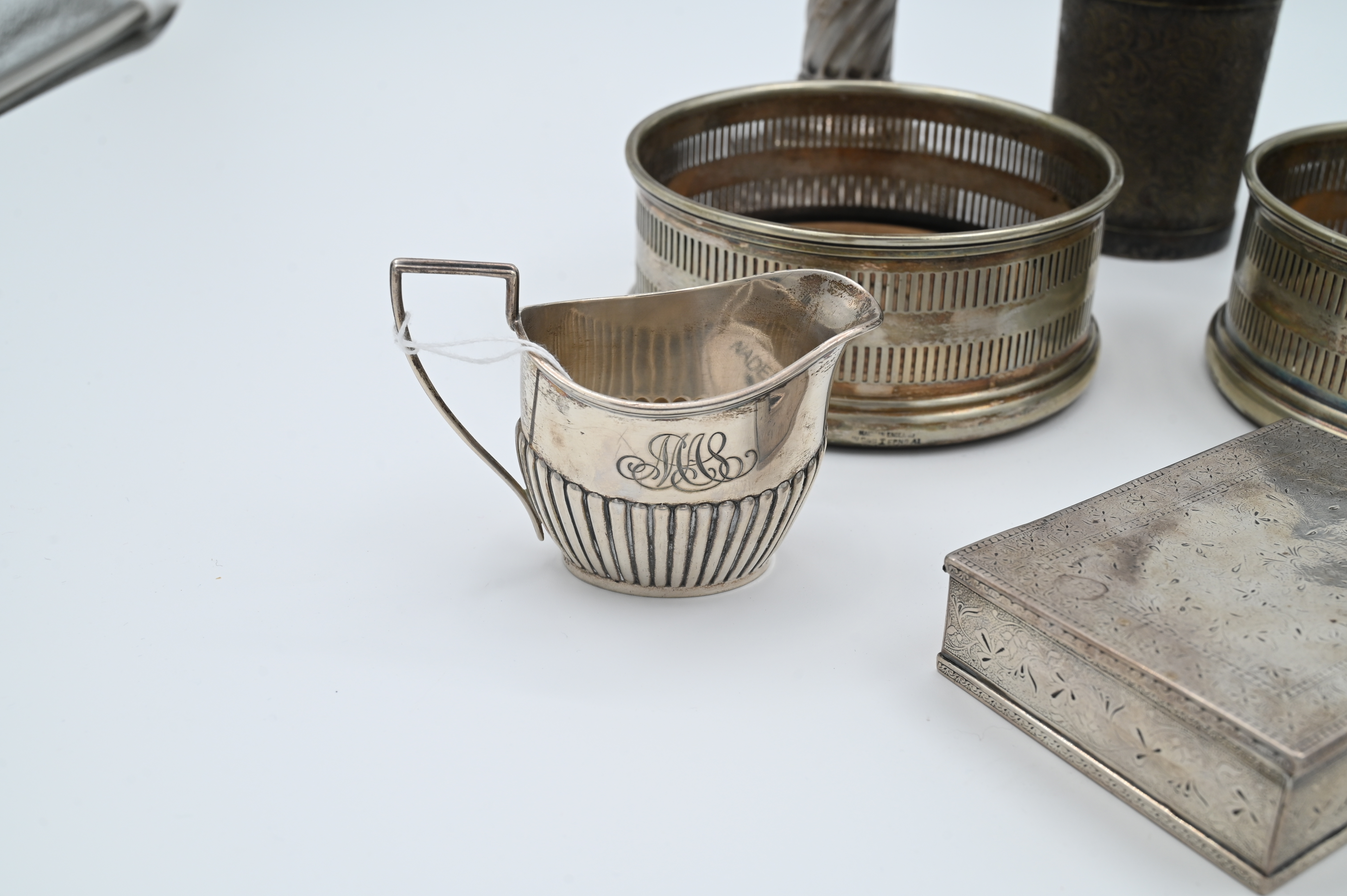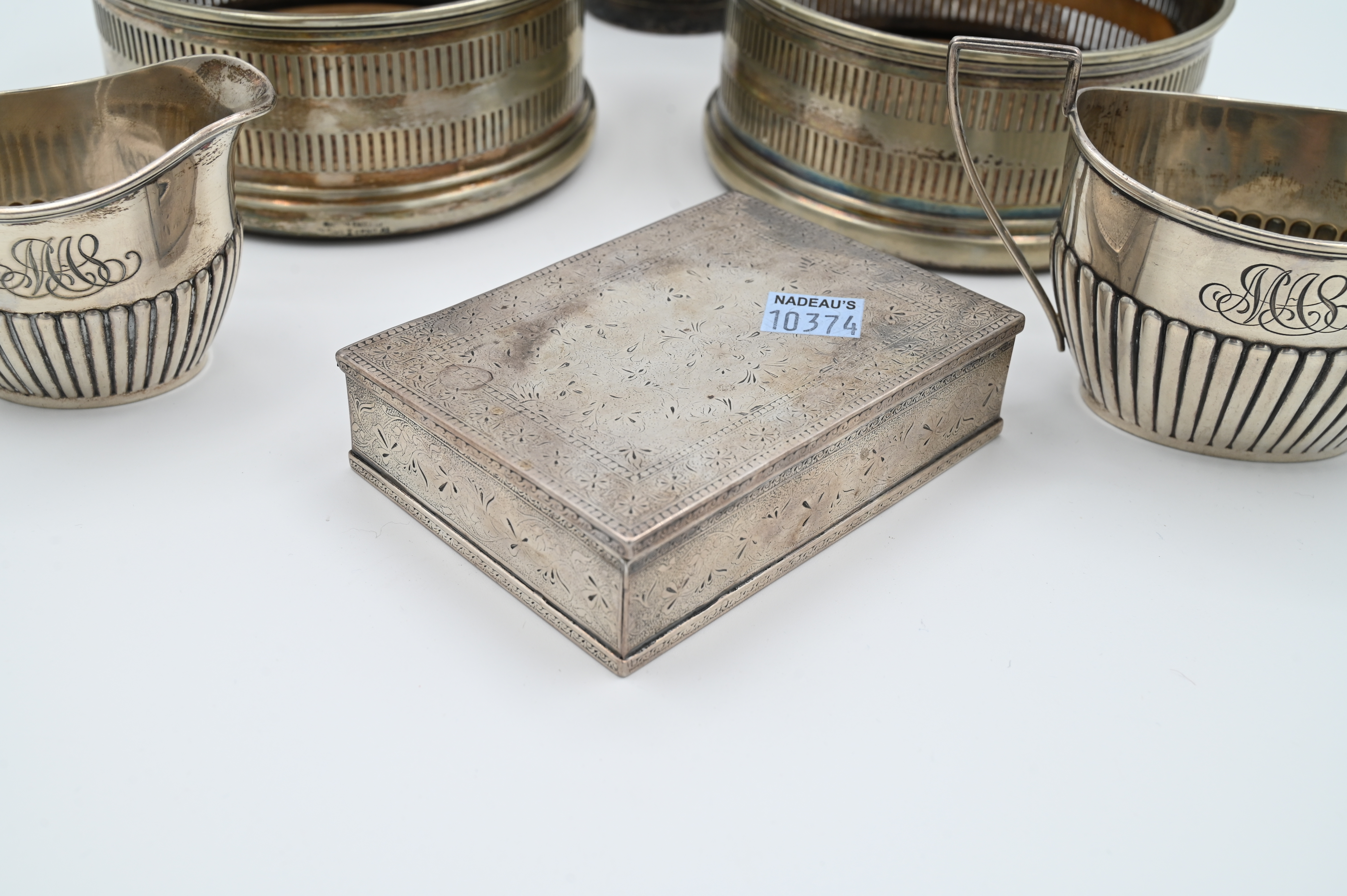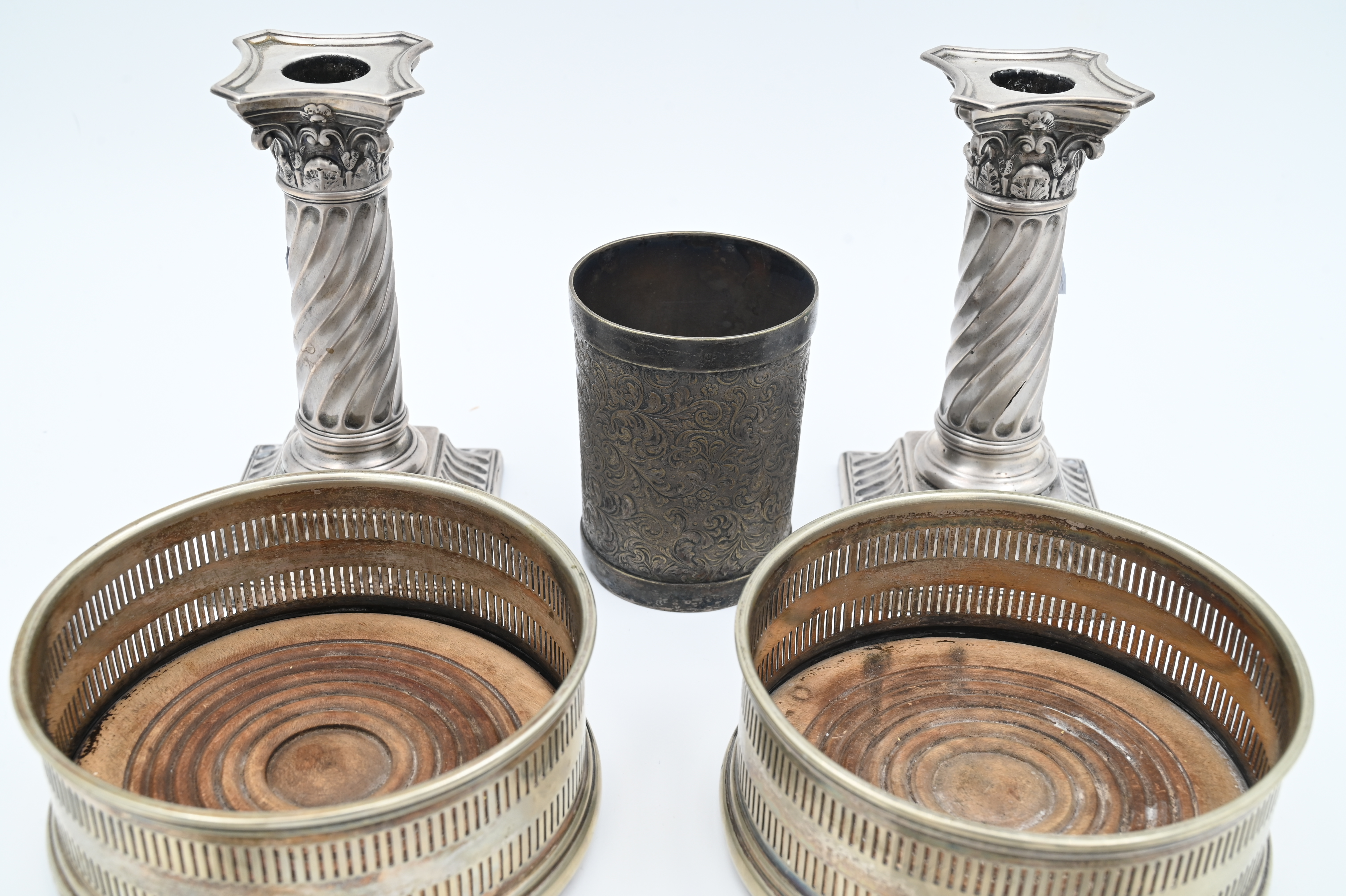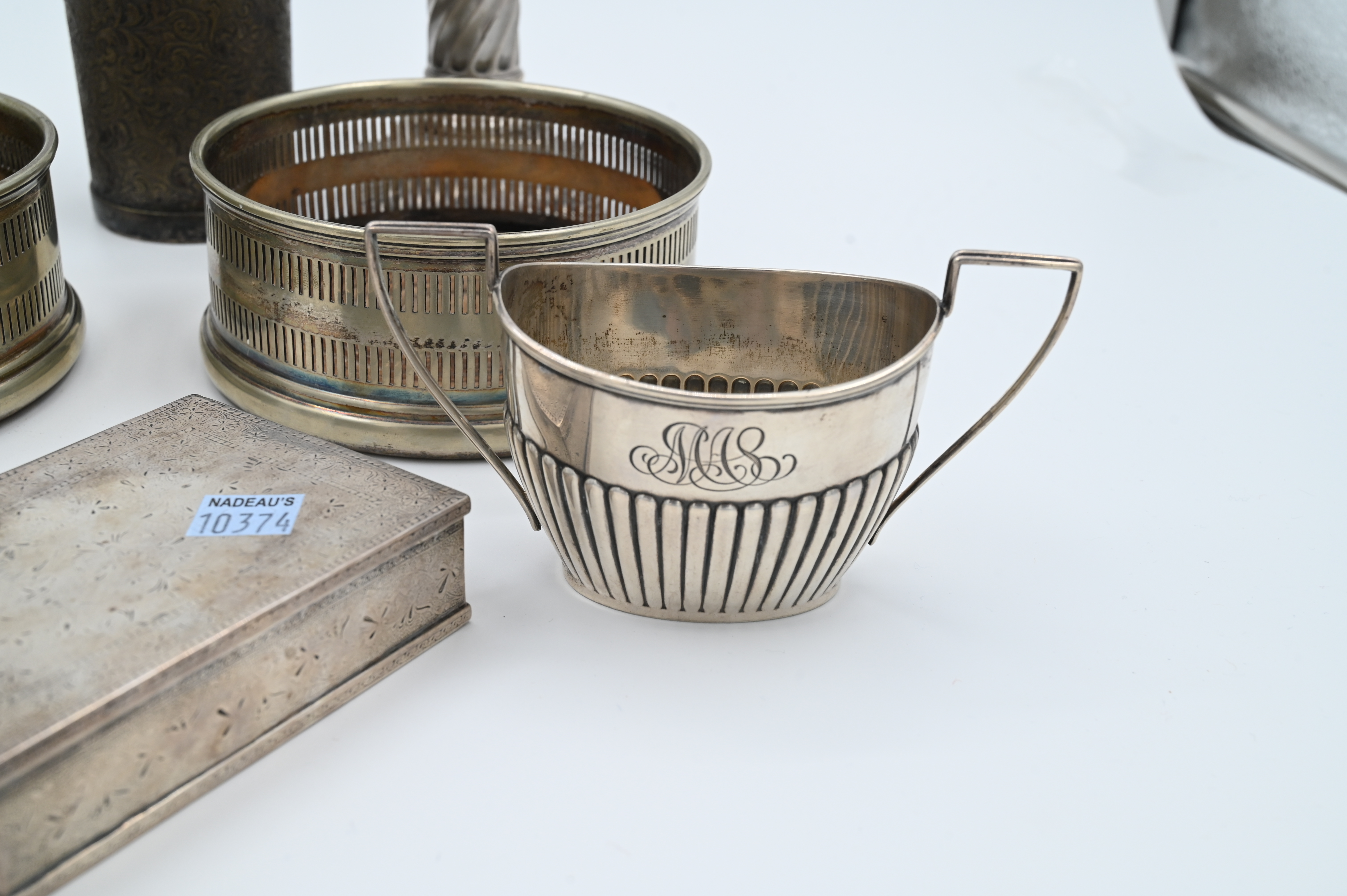 to include pair of weighted English sterling candlesticks in the form of columns, Black Starr sugar and creamer, a continental silver box, silver plate wine coasters and cup