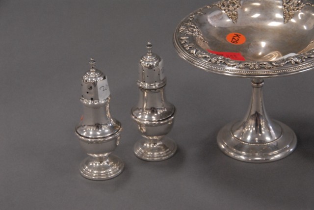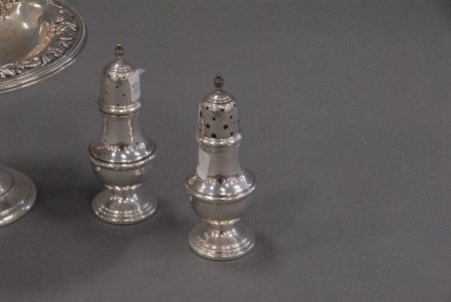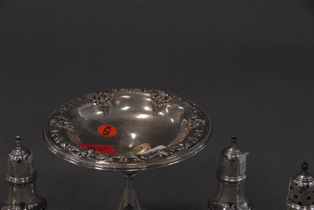 Five pieces sterling silver lot to include Grand Baroque compote and 4 pepper shakers