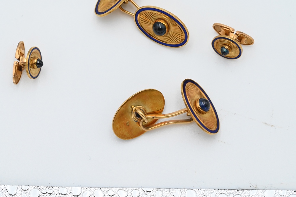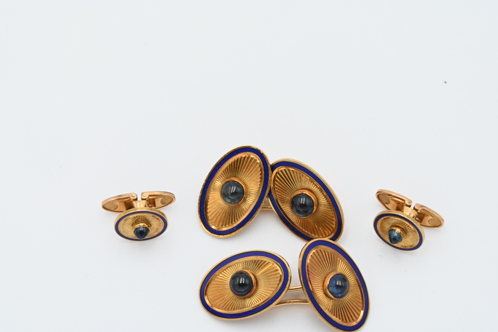 Four Piece Lot, to include a pair of gold cufflinks, oval with blue enamel surround and center sapphire; along with two matching shirt buttons; 13 grams.