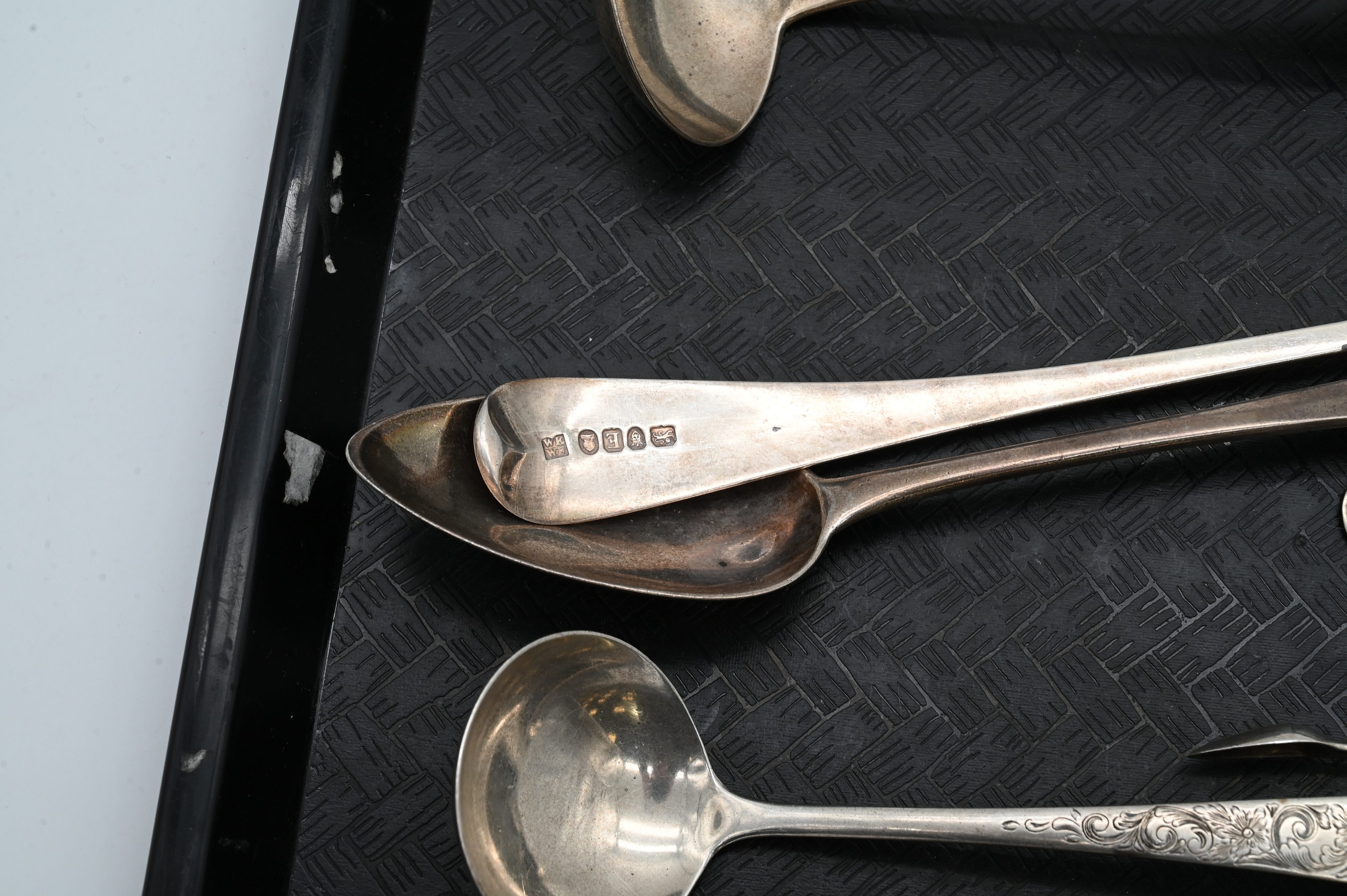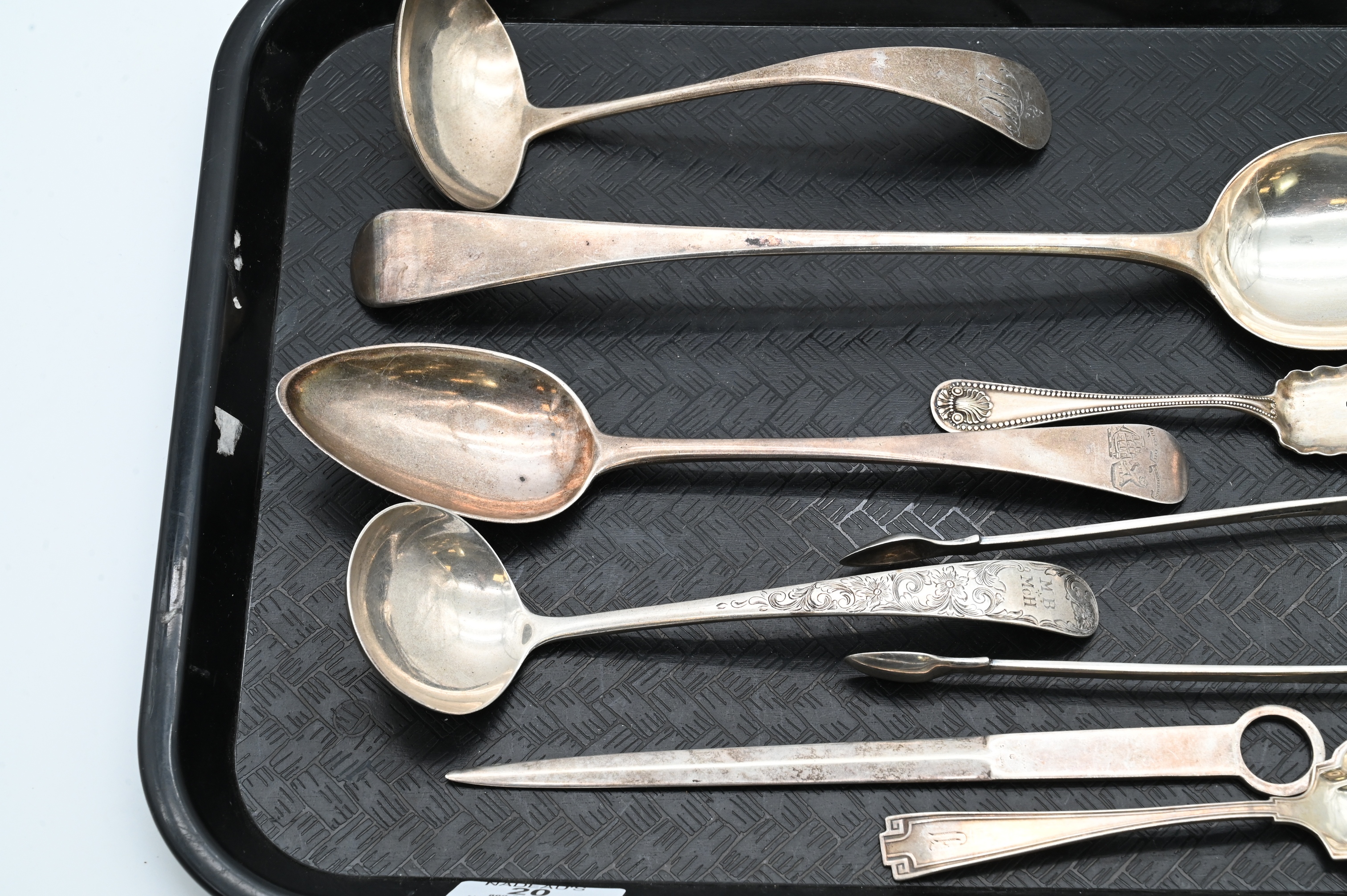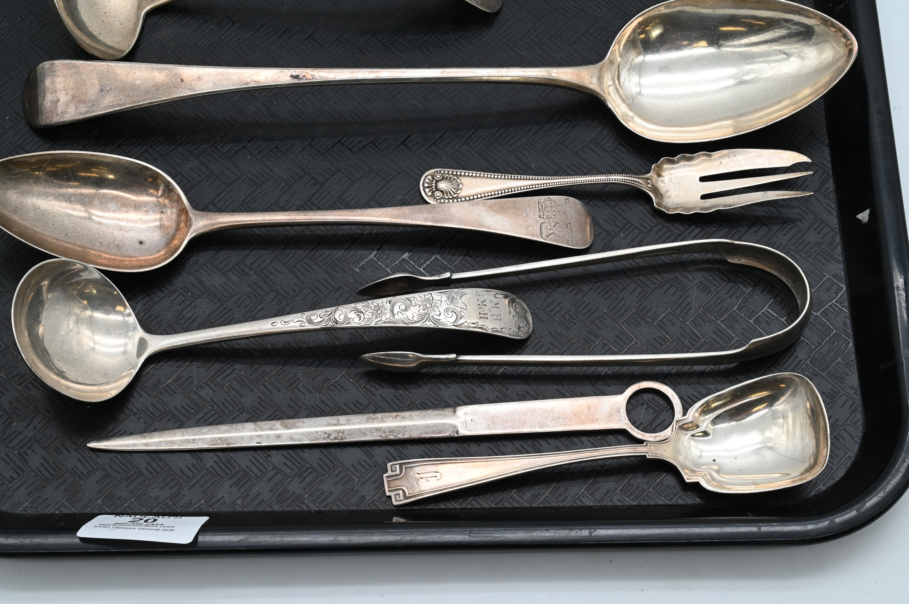 to include large serving spoon by William Eley and William Fearn circa 1800, place spoon by William and Patricia Cunningham circa late 18th early 19th century, and a pair of coin silver tongs by Samuel Williamson