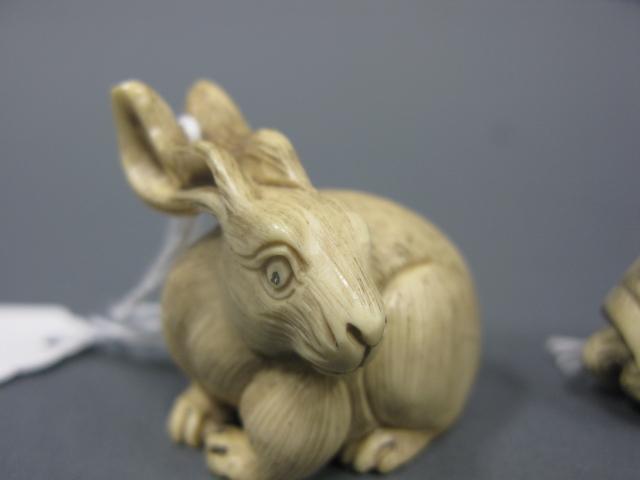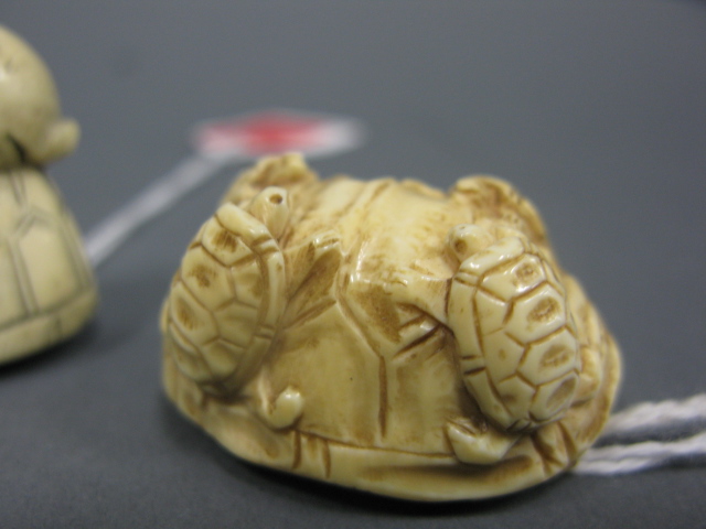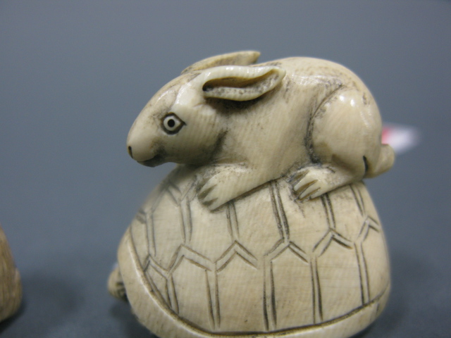 Group of three carved ivory netsukes rabbit, turtle with four small turtles on it and turtle with mouse on it.