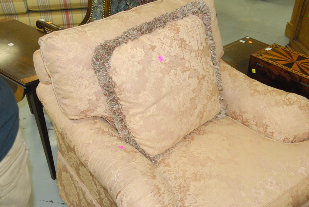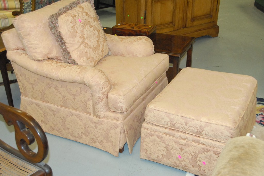 Henredon upholstered easy chair and matching ottoman and matching pillow.