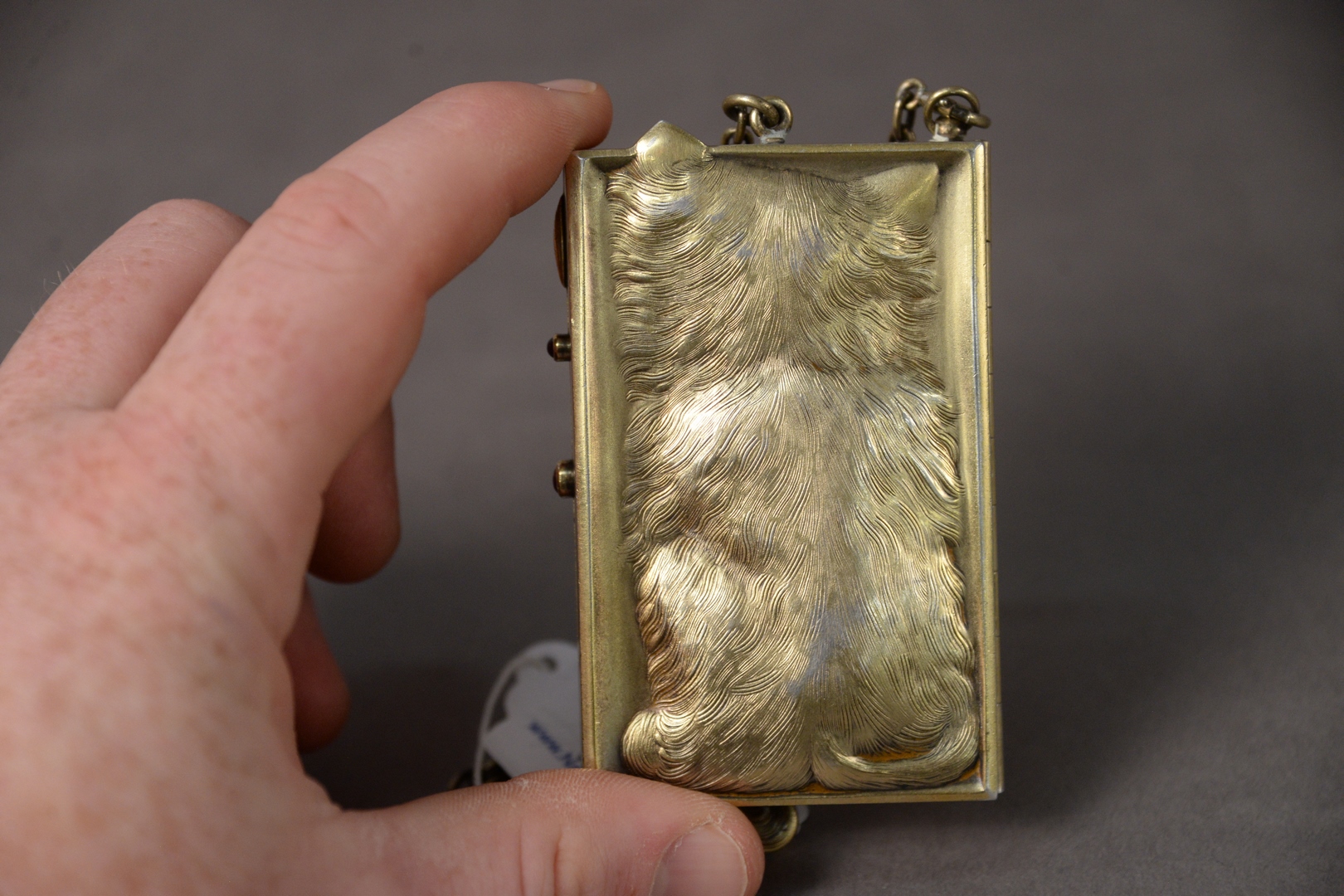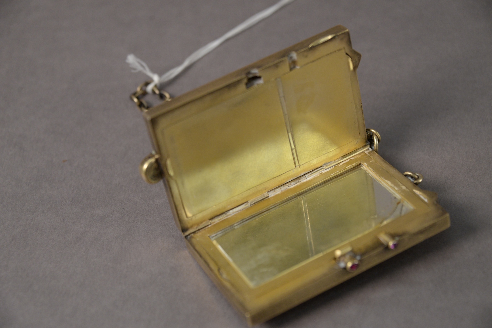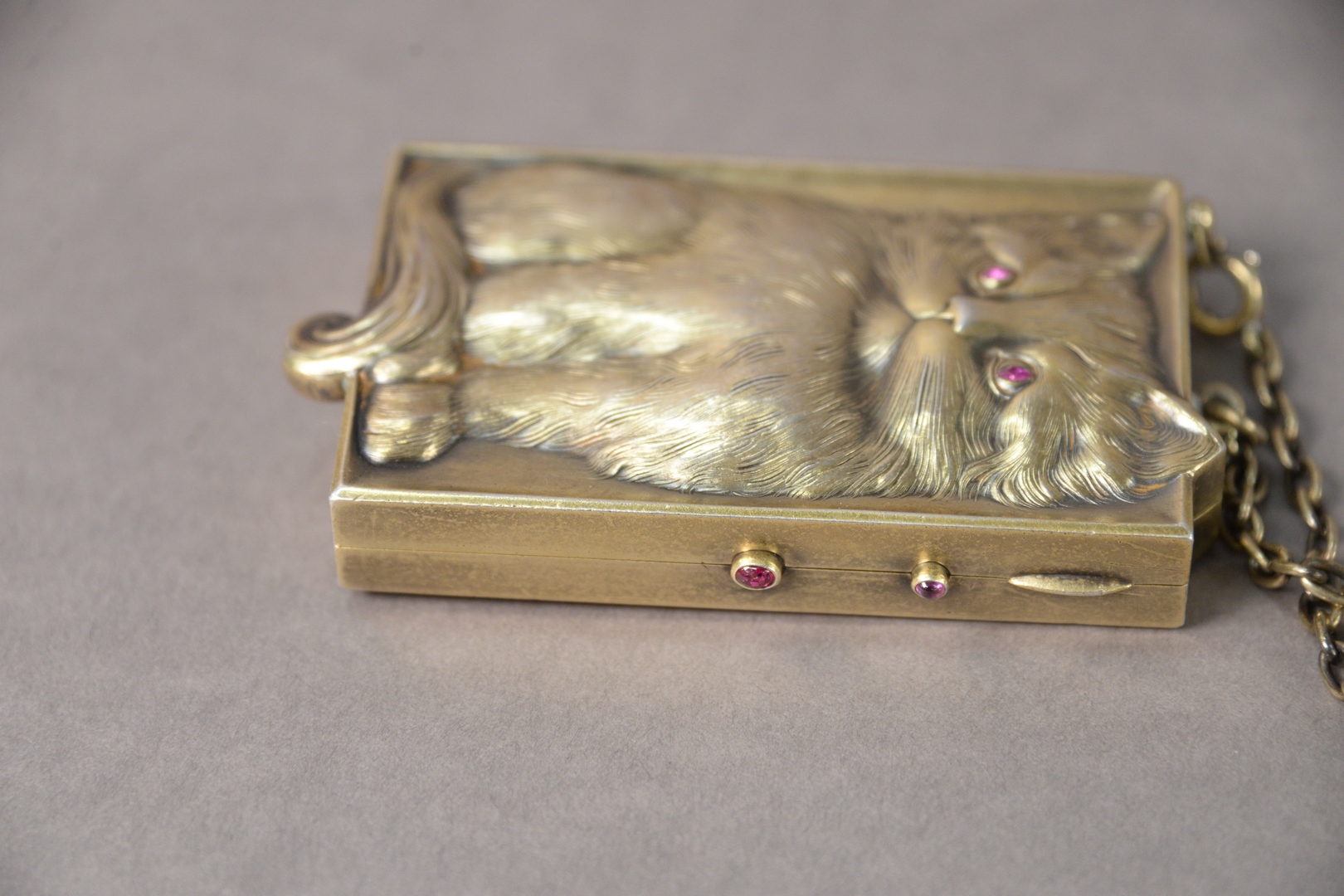 Lot 20: Kuppenheim Silver Cat Purse, having red eyes, interior with compartments, mirror backing scratched, 2 x 3 1/2.