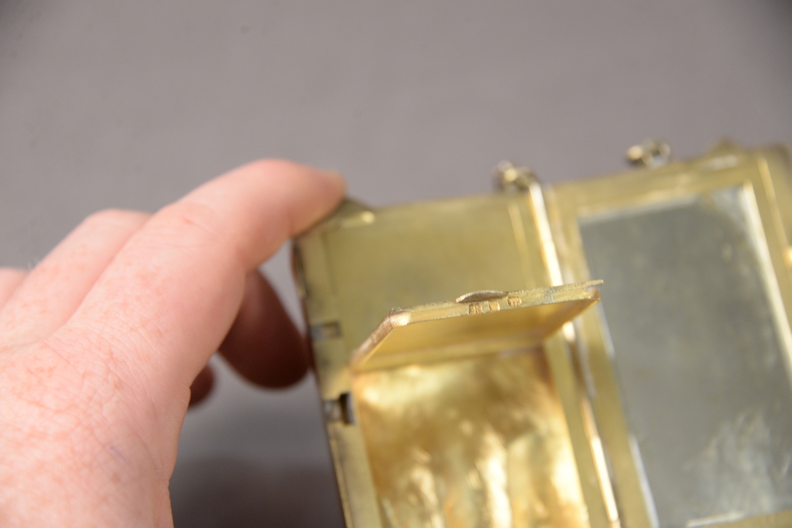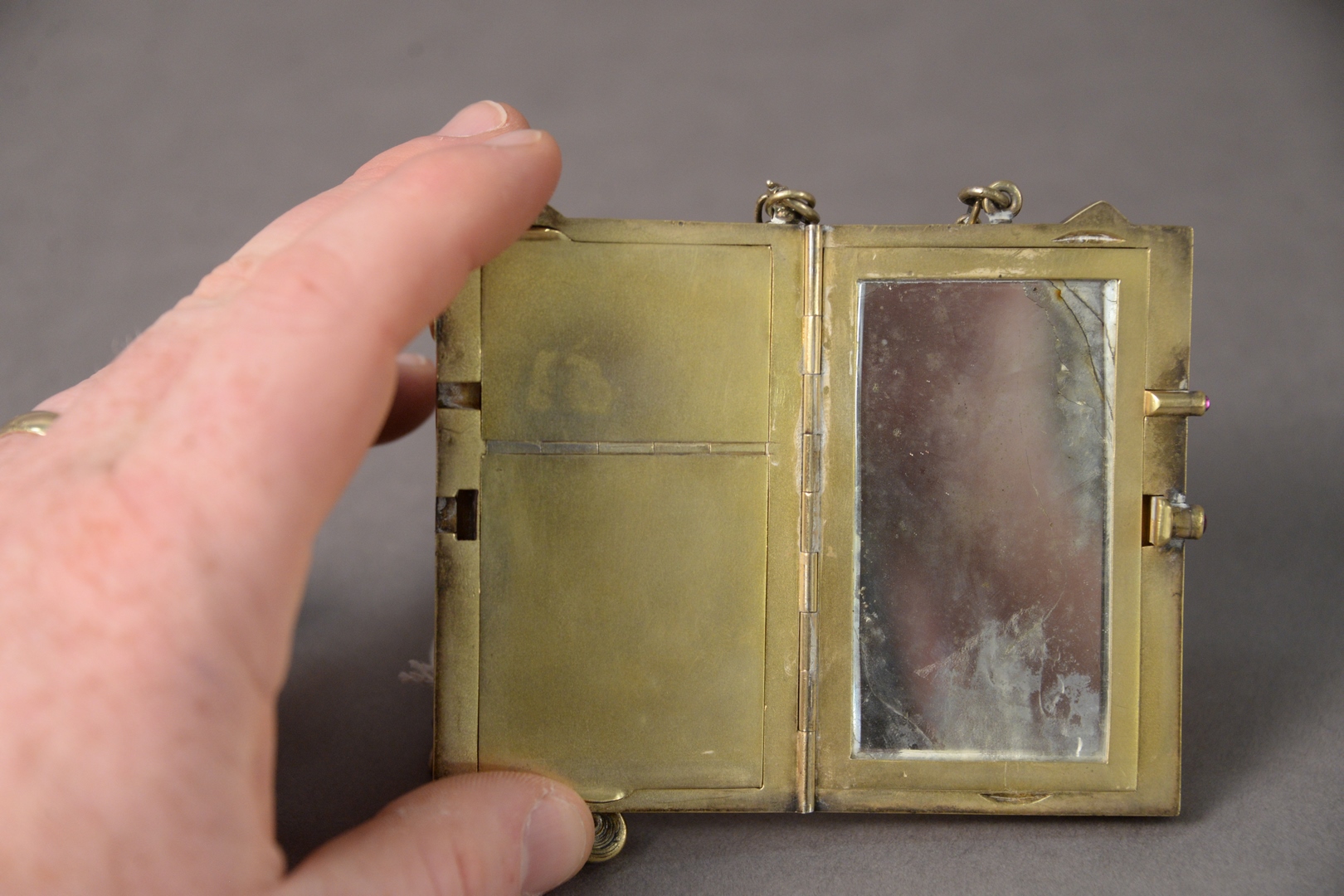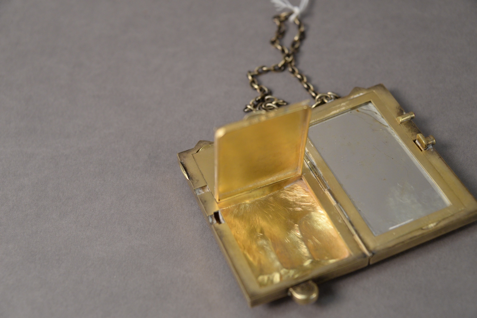 Lot 20: Kuppenheim Silver Cat Purse, having red eyes, interior with compartments, mirror backing scratched, 2 x 3 1/2.