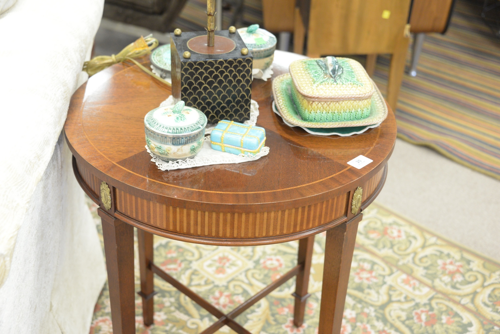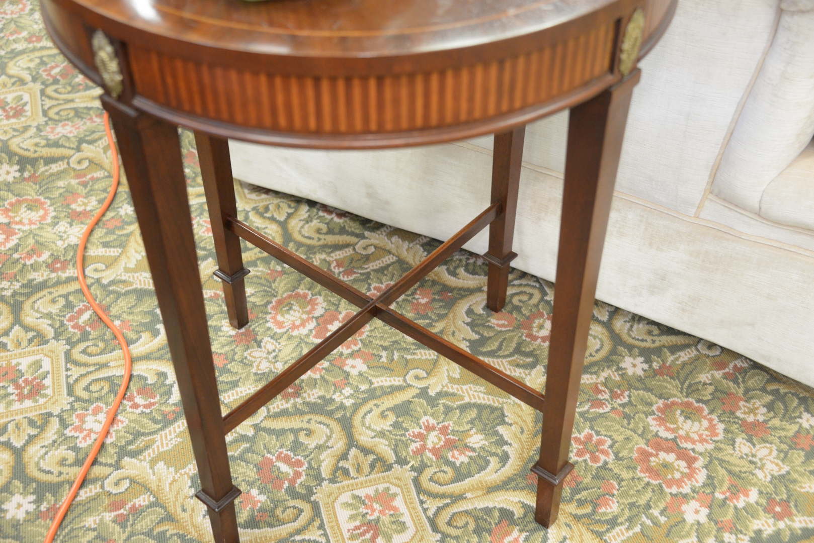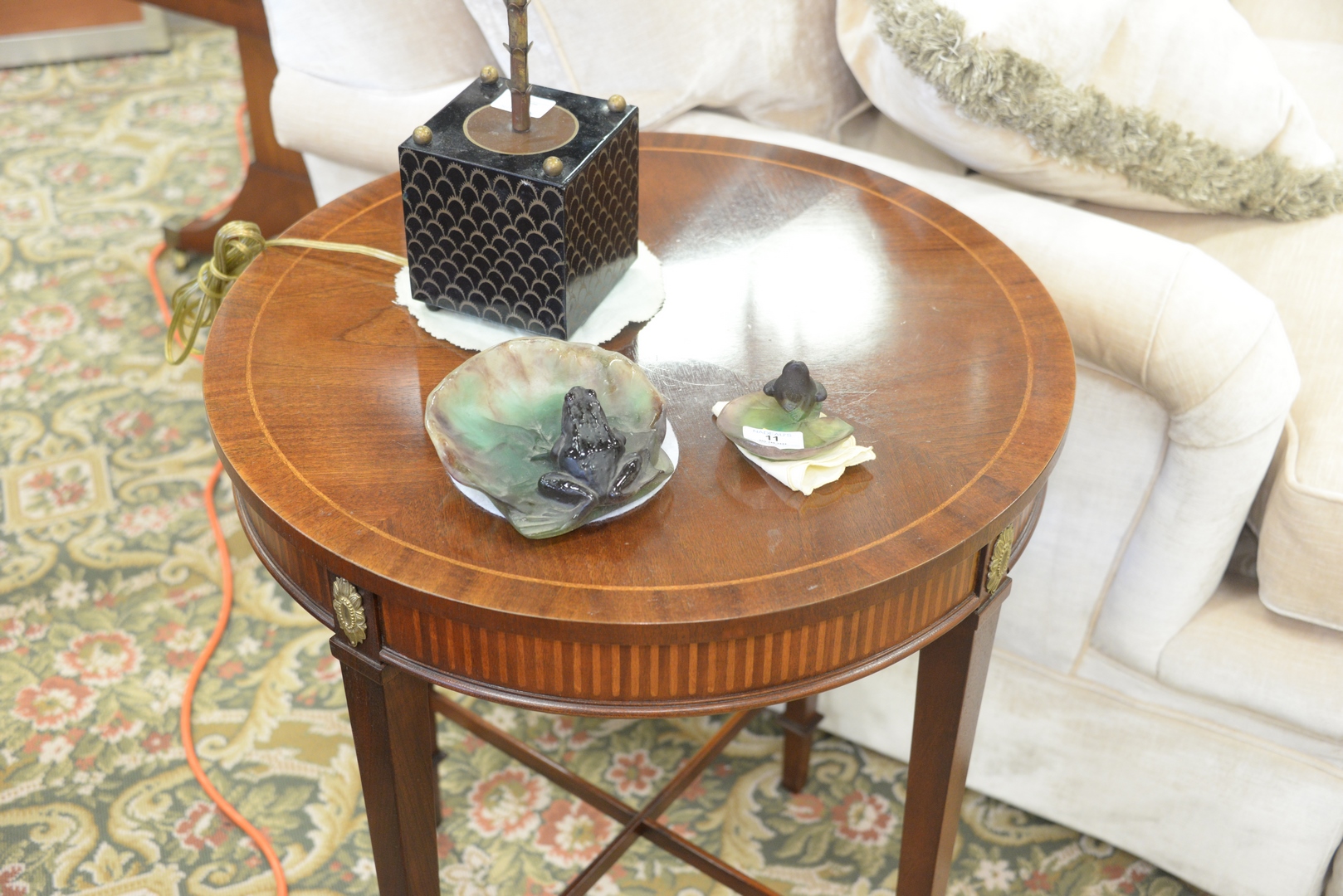 Lot 20: Pair of Baker Round Mahogany Inlaid Tables having X stretcher base, height 27 1/2 inches, diameter 23 1/2 inches.