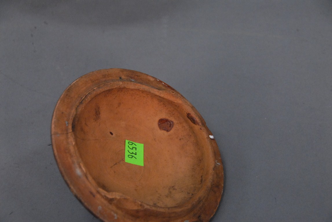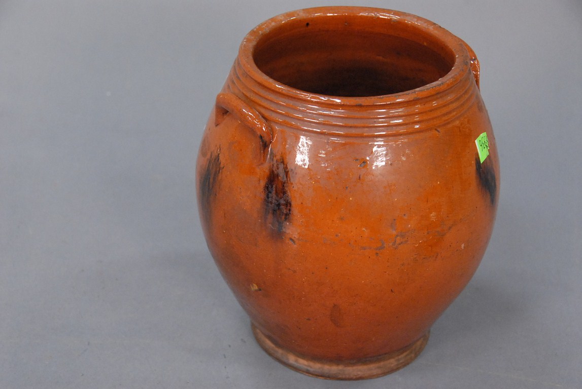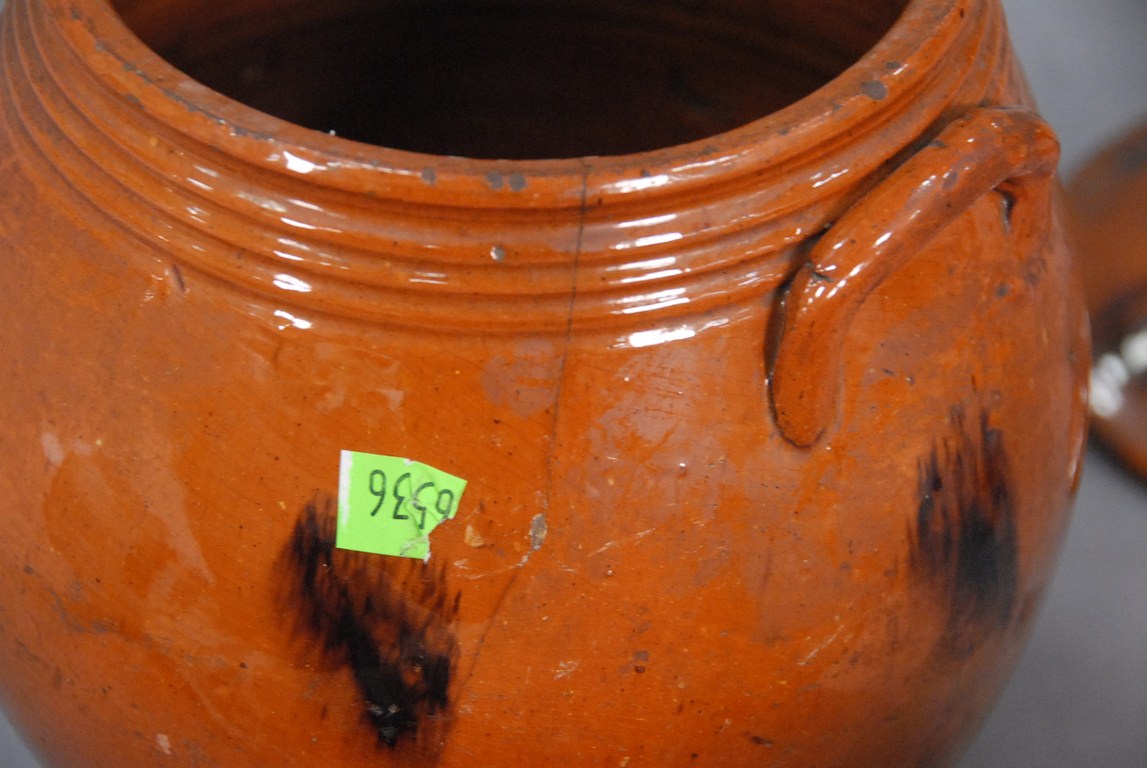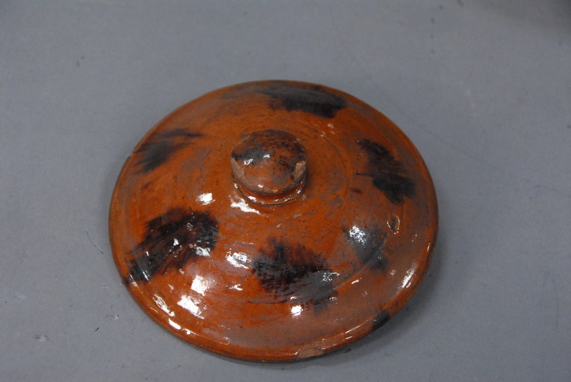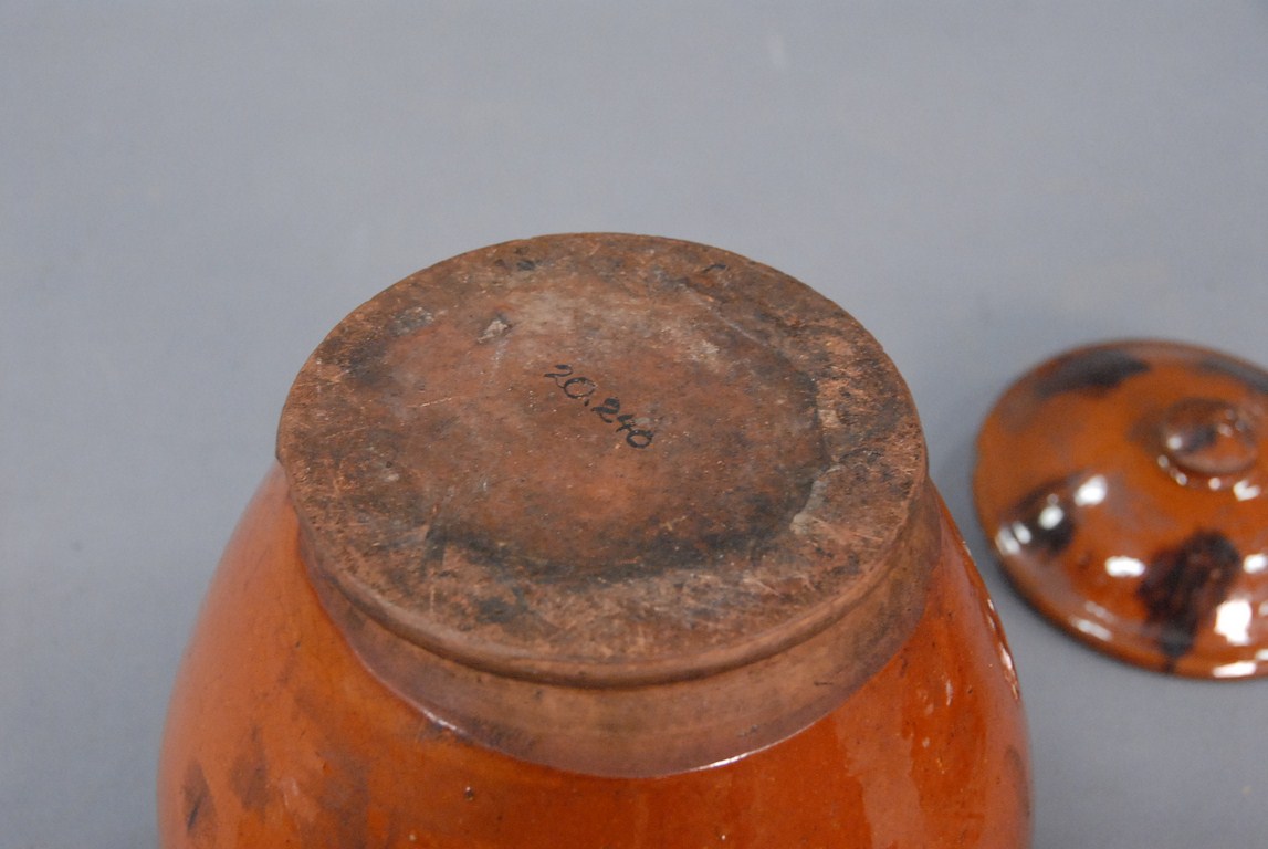 Lot 20: Redware crock with cover and two handles with overall manganese decoration. ht. 11in.