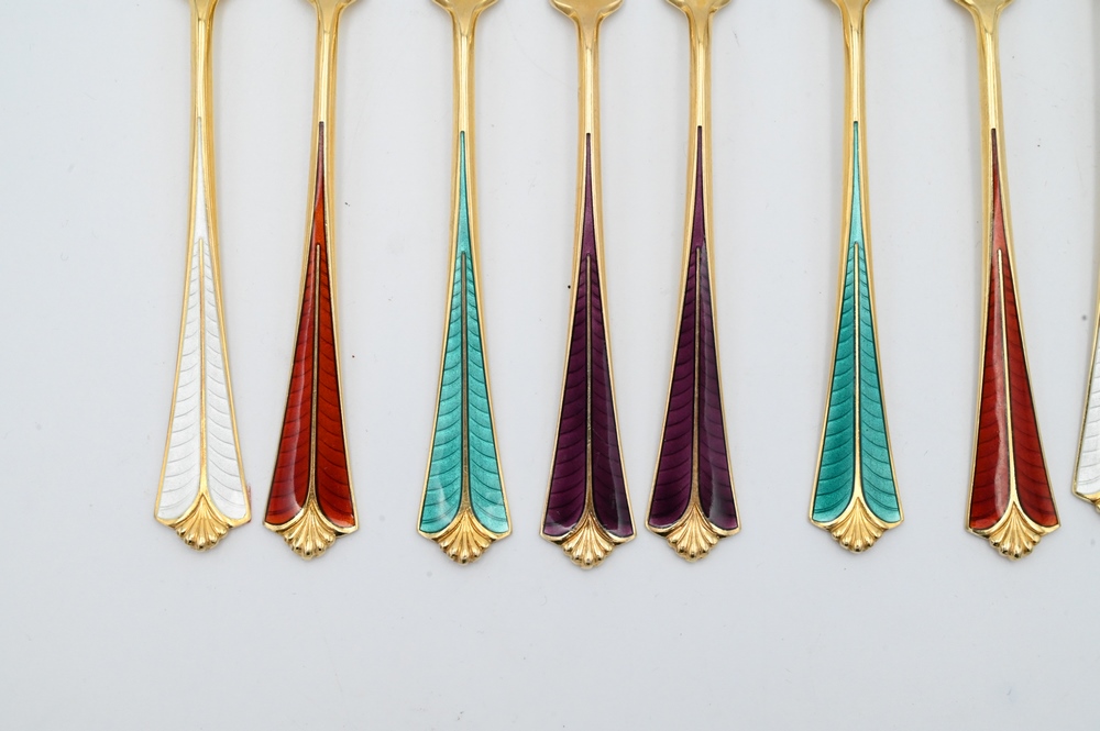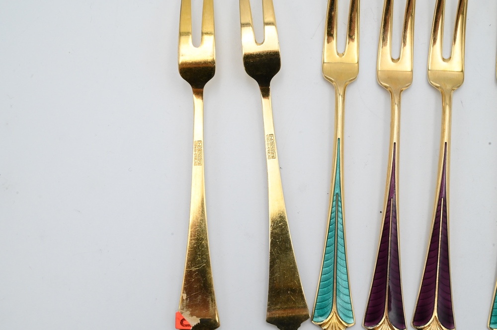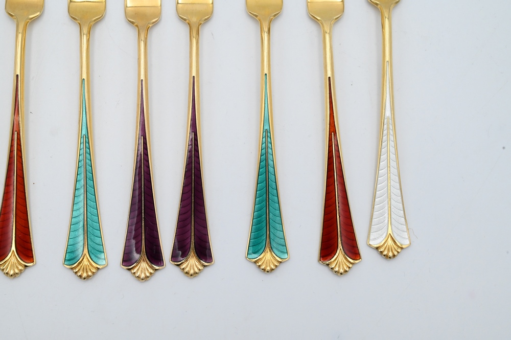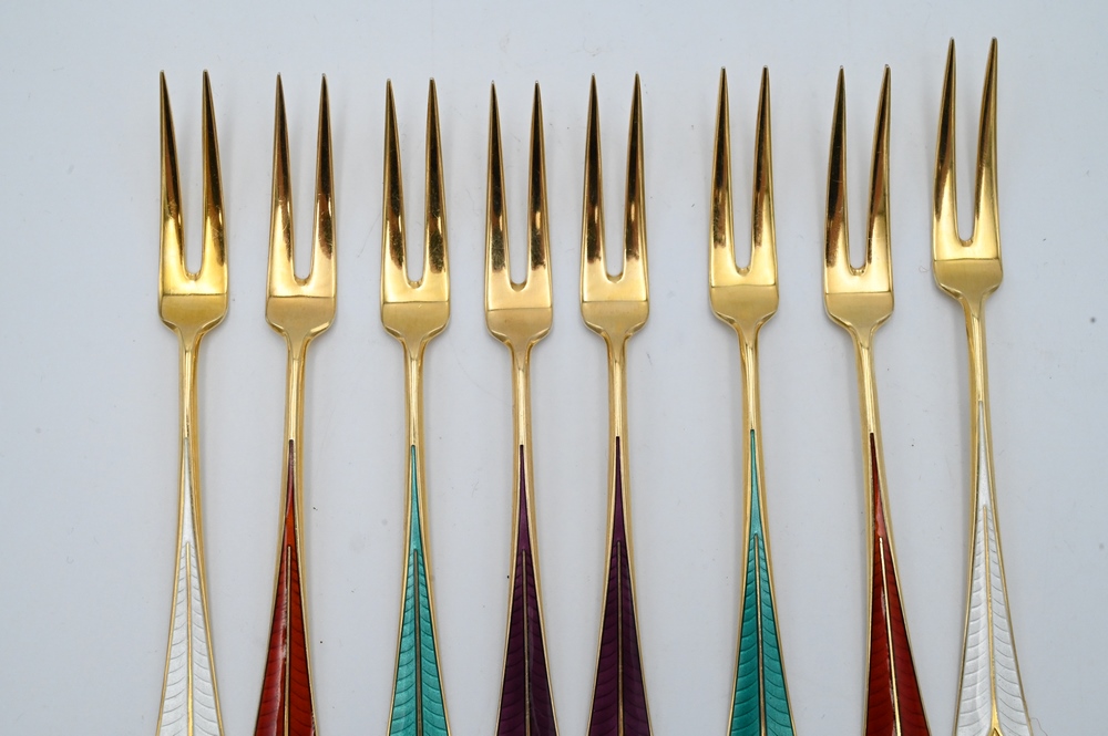 Lot 20: Set of Eight DA Norway Silver Gilt Cocktail Forks, having enameled handles, length 5 inches, 3.71 t.oz.