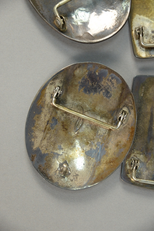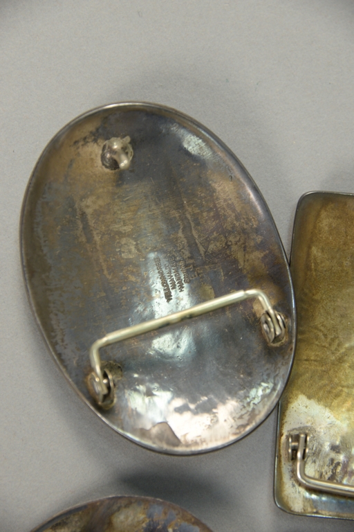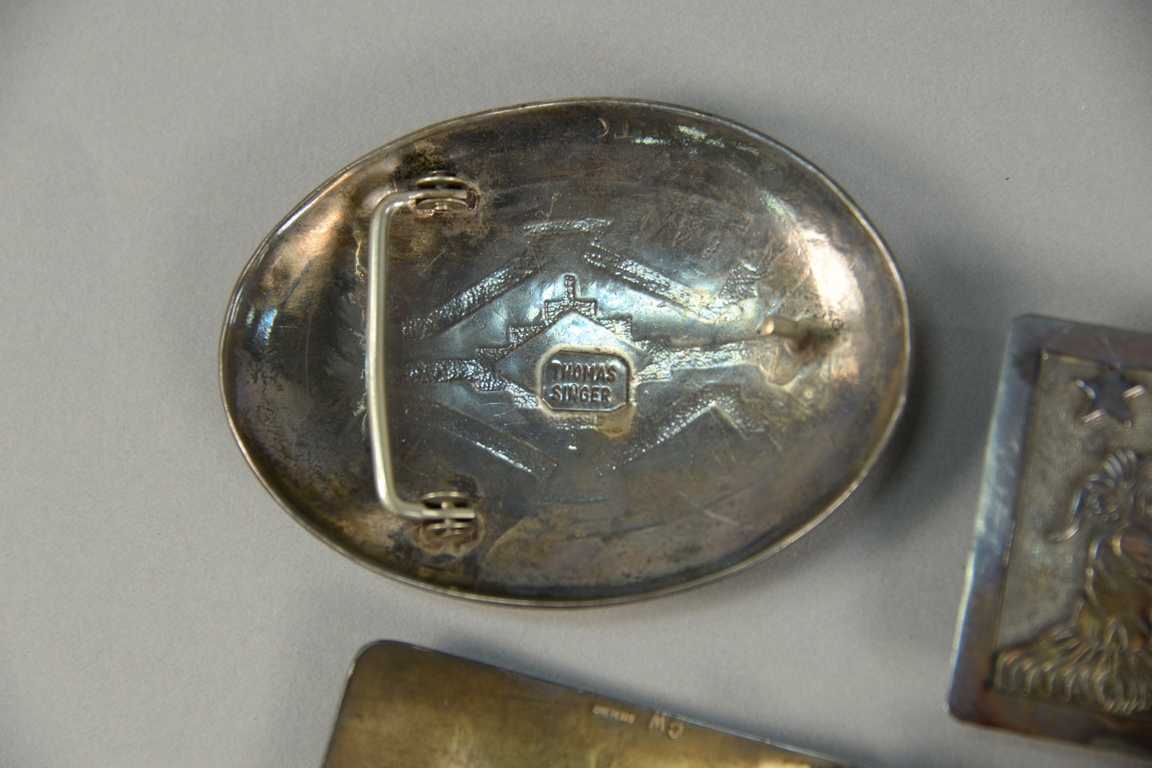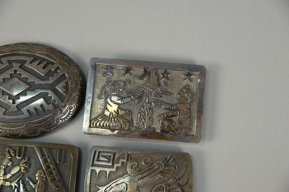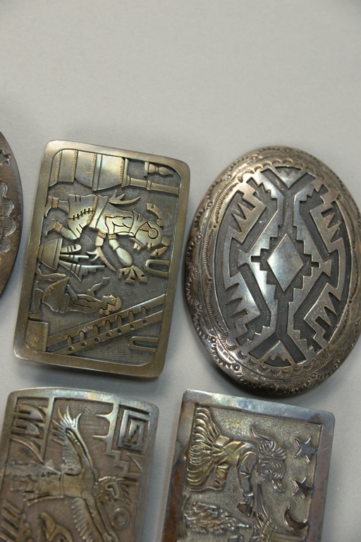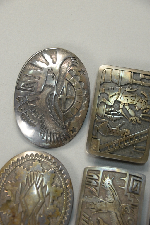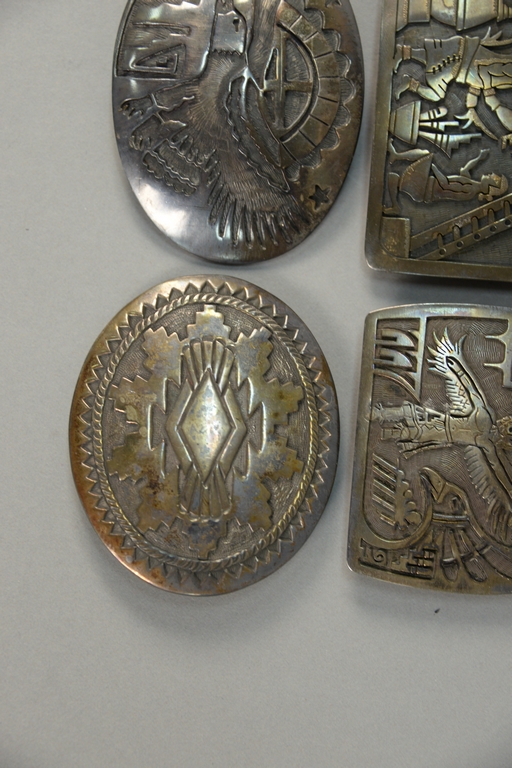 Six sterling Navajo Native American Indian belt buckles marked Yellow Horse EJ, Thomas Singer, and CW. largest: 2 1/2 x 3,10 t oz.