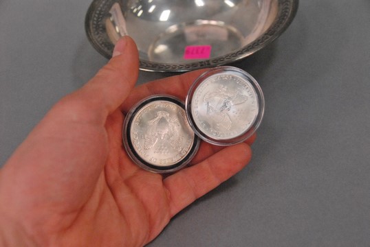 Small Tiffany sterling bowl along with two silver year 2000 Liberty Eagle coins.